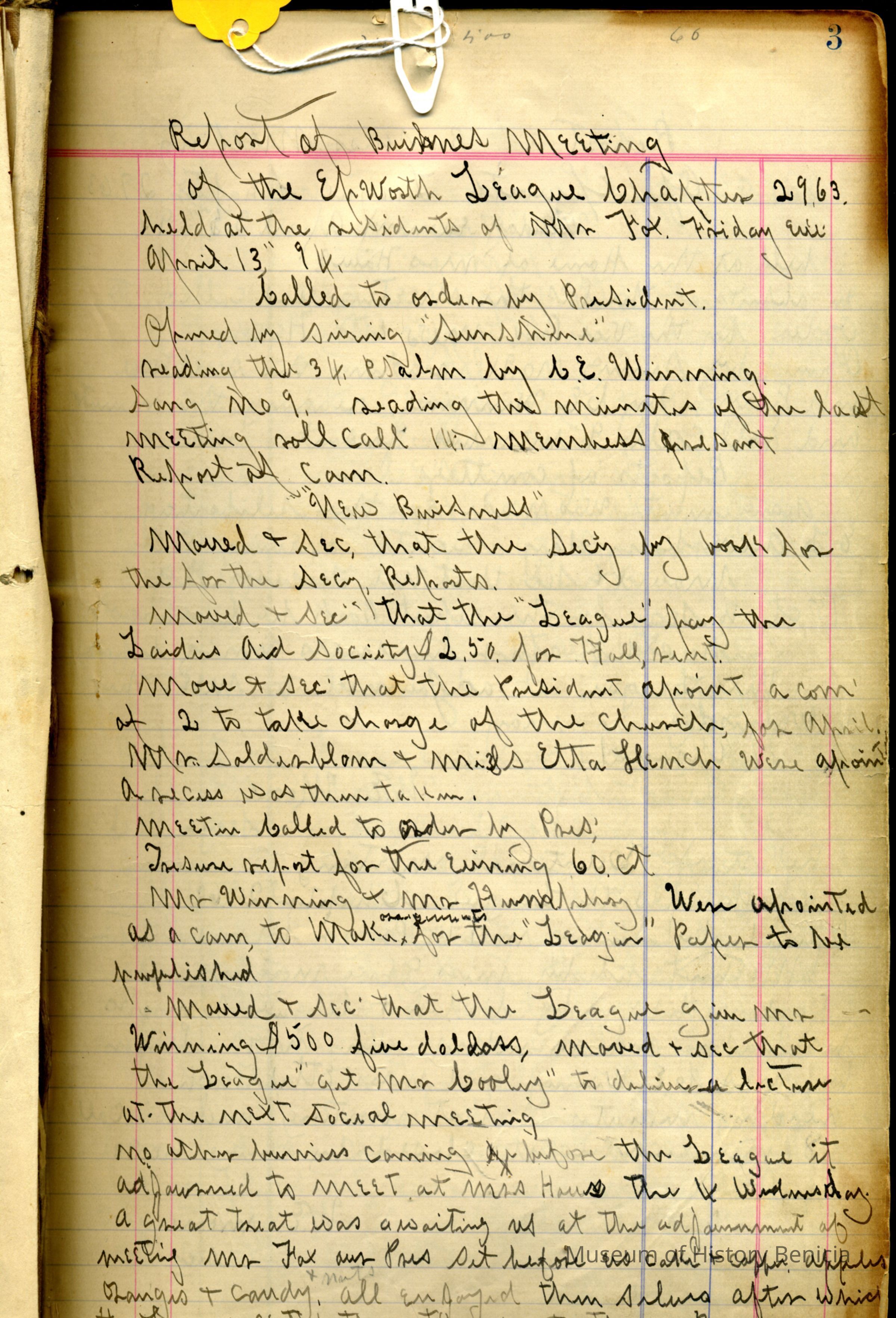 The journal conains the minutes and membership roll for the Epworth League of the Benicia Methodist Episcopal Church, Chapter 2963