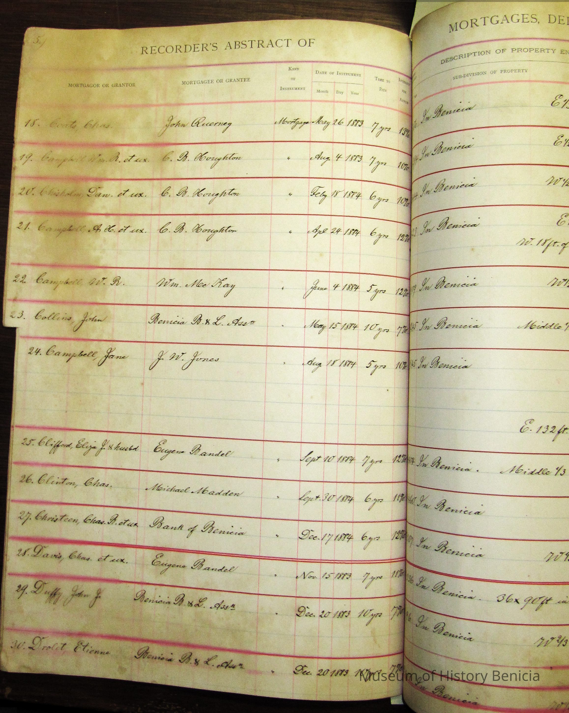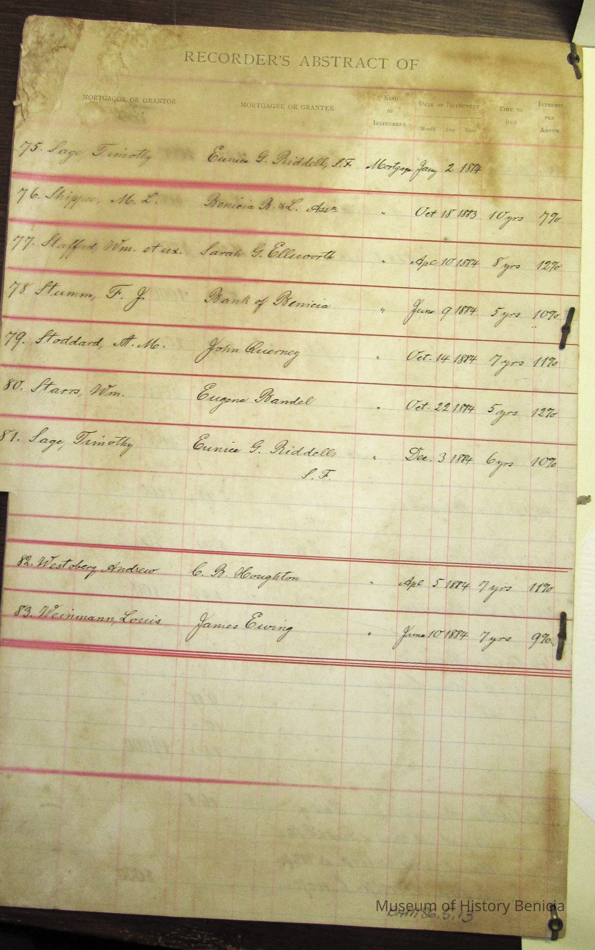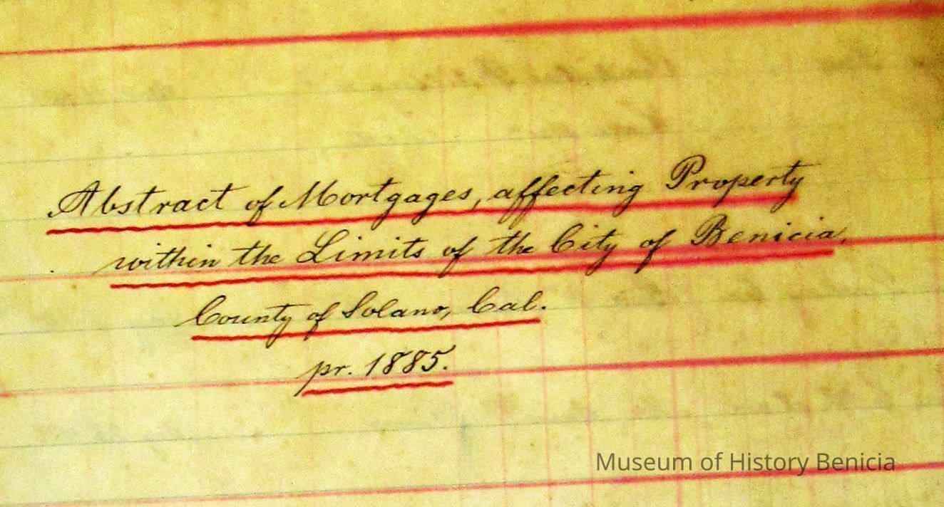 "Abstract of Mortgages, affecting Property within the Limits of the City of Benicia, County of Solano, Cal. prior 1885"