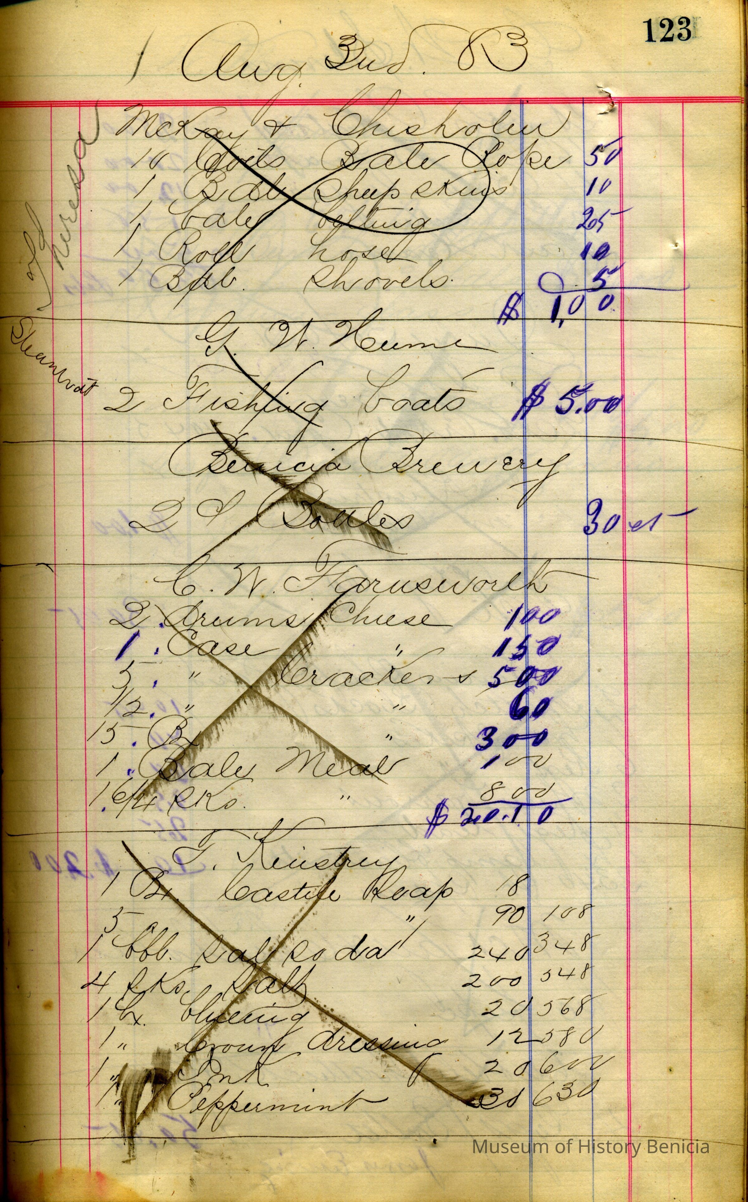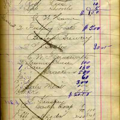 A ledger of the freight carried by the schooner "Theresa" starting in 08/04/1882. It shows the cargo, for whom it was carried, the date and the cost for each item. For example, on 08/04/1882 they carried cargo for G.W. Hume (of Hume cannery). 2 stone jars were $.25, 3 carboy of Muriatic Acid were $1.50, etc.