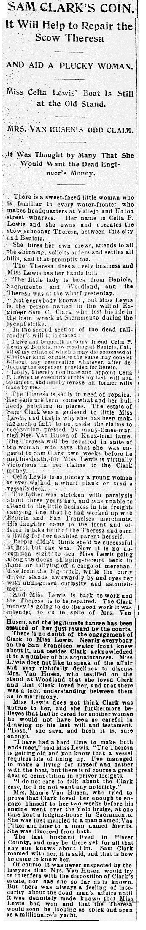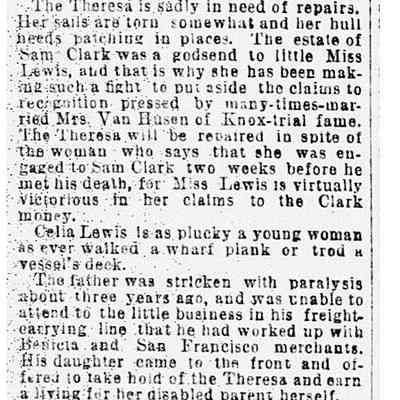 There is a sweet-faced little woman who is familiar to every water-fronter who makes headquarters at Vallejo and Union street wharves. Her name is Celia P. Lewis and she owns and operates the stow schooner Theresa, between this city and Benicia. She hires her own crews, attends to all the shipping, solicits orders and settles all bills, and that promptly too. (The newspaper mentions that Mr. Clark was killed in a labor dispute when his train was derailed outside of Sacramento in 1893.) We know that Mrs. Lewis ran the company from Benicia based on the 1900 US Census. She lived in Benicia on "H" street with her sister Oceana Dillingham who also ran several freight carrying schooners with her second husband, Capt. Wallace Dillingham until his death in 1894 and by herself after that date. We also know that Mrs. Lewis died in 1903 and is buried in the Benicia City Cemetery.Collection