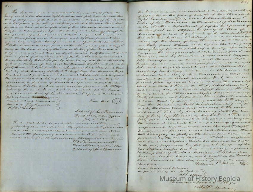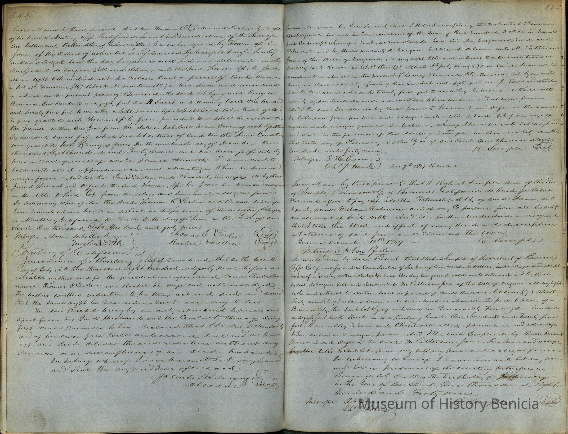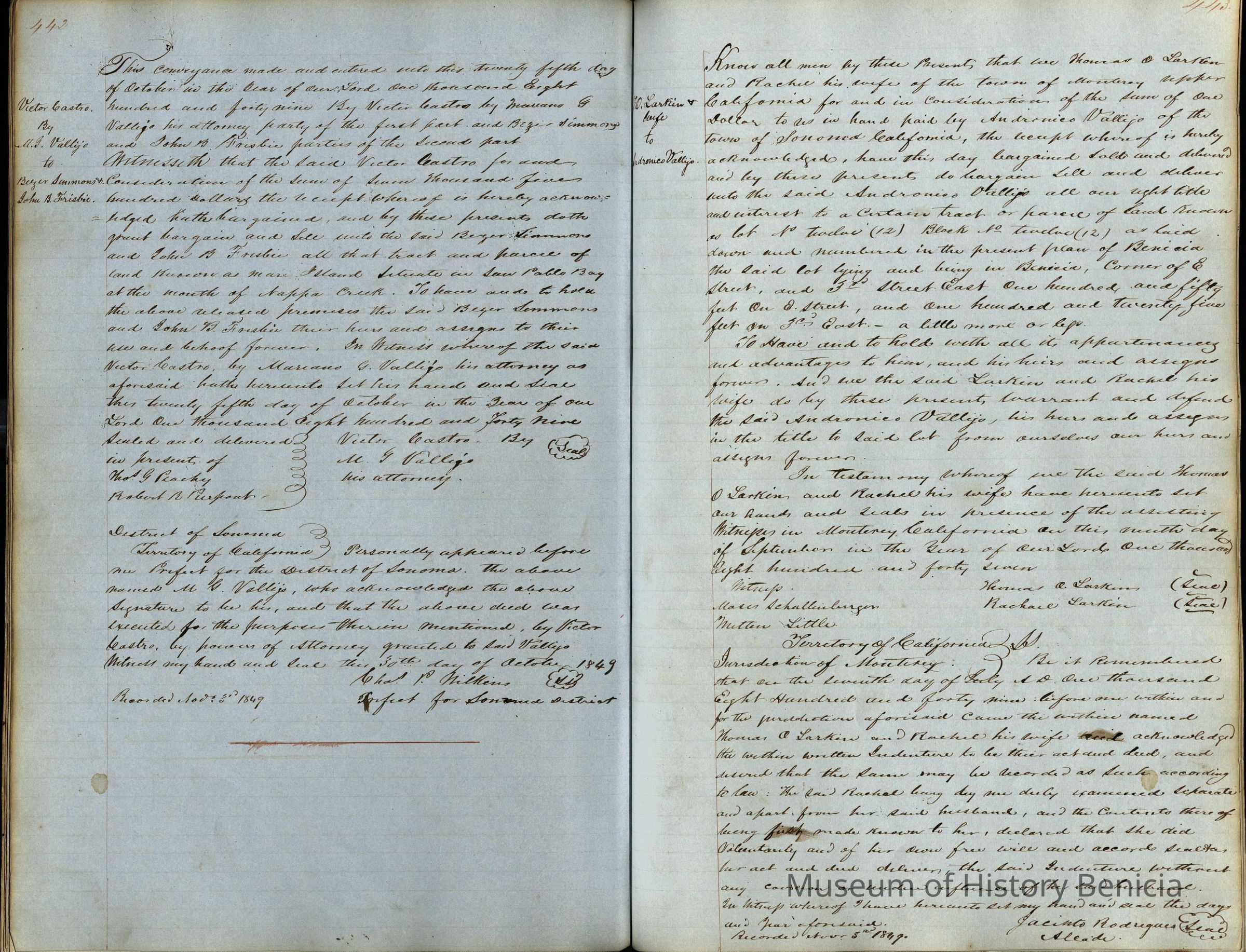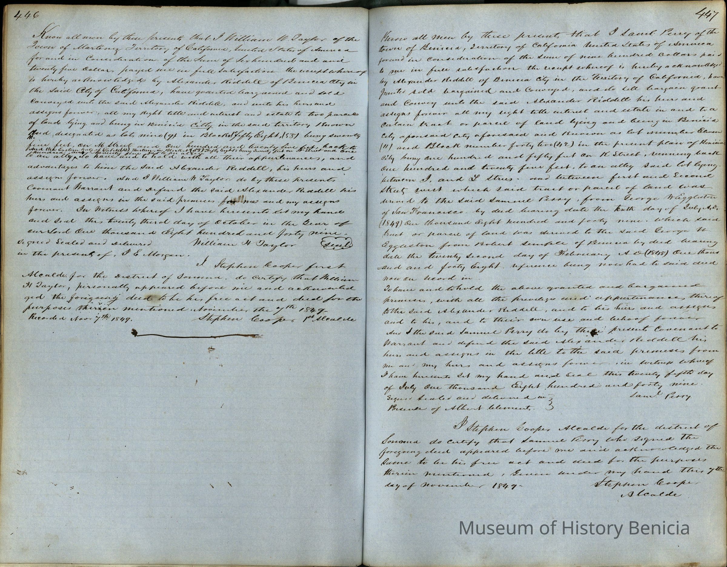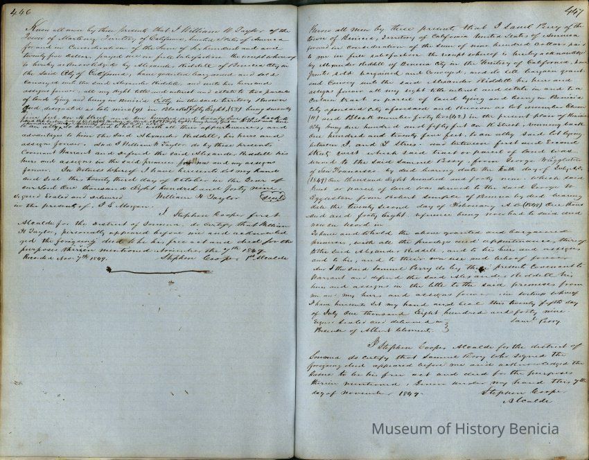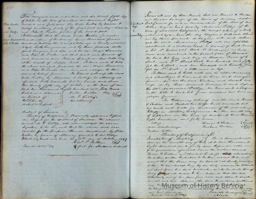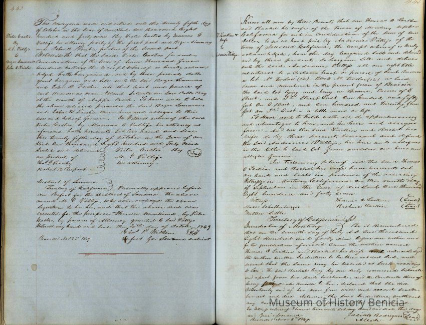 This journal/ledger contains the beginnings of Benicia including: lists and descriptions of first 12 houses in Benicia, a translation of the deed to General Vallejo by Manual Micheltorena, Governor of Calif. (1844); deed to Semple and Larkin by Vallejo (1847); deeds of properties sold by Semple and Larkin from 1847 - 1849