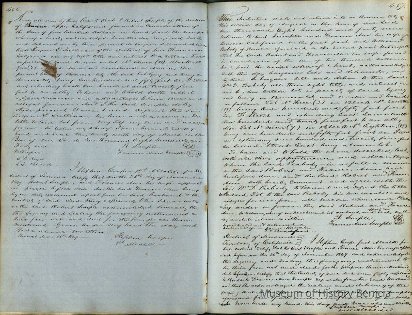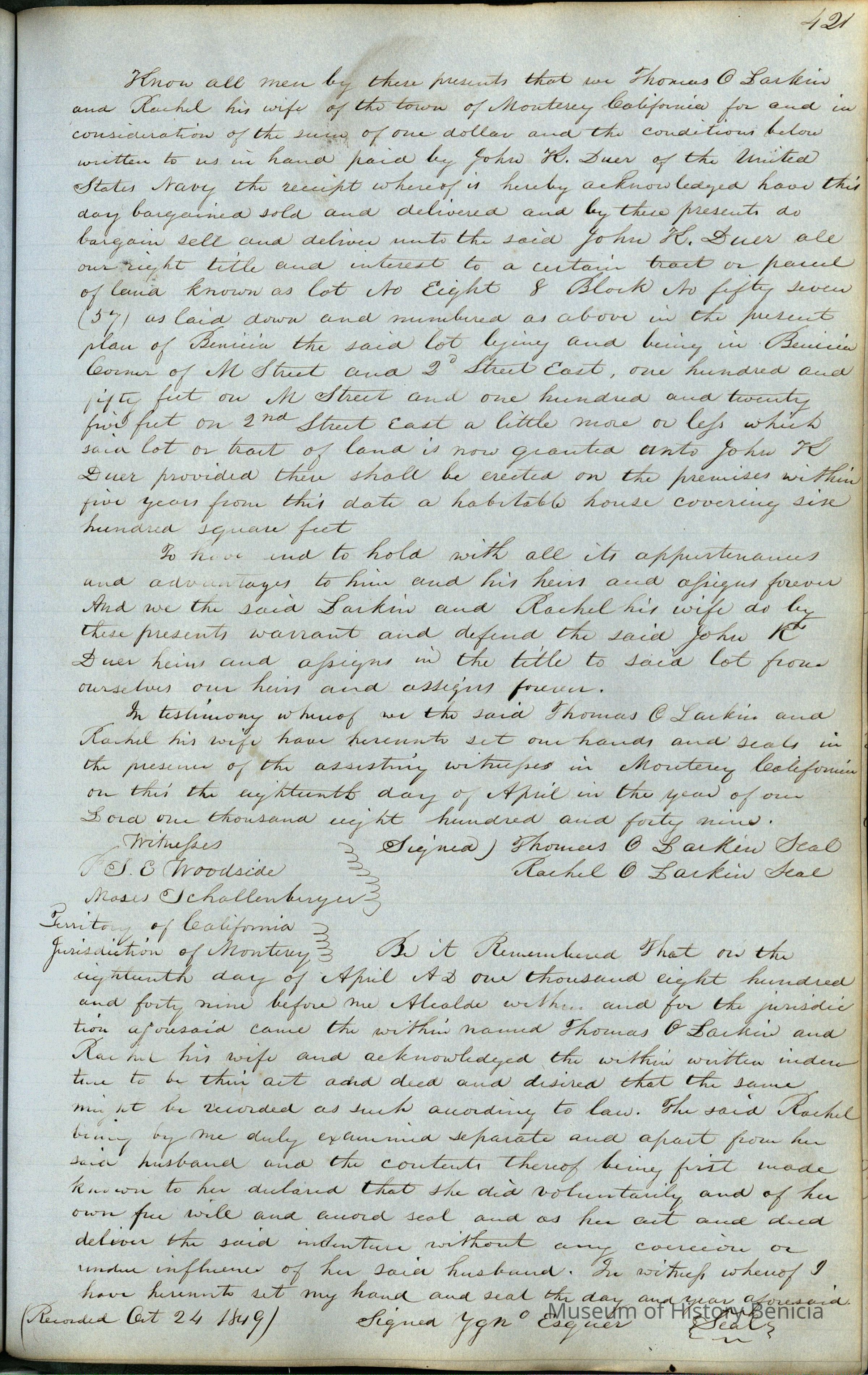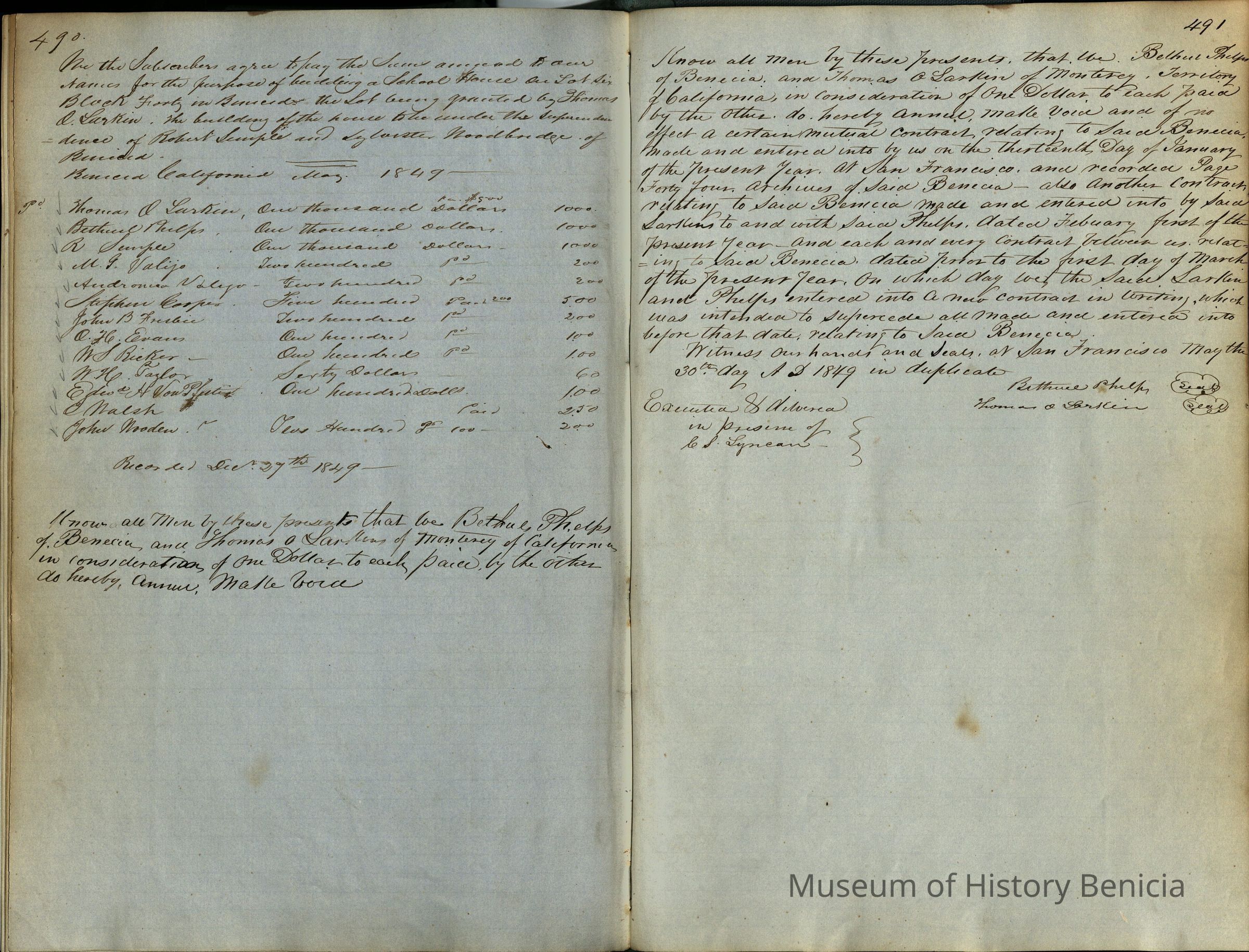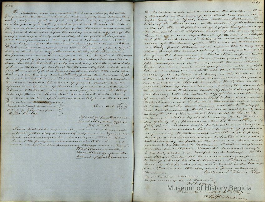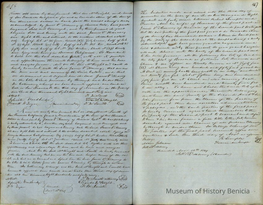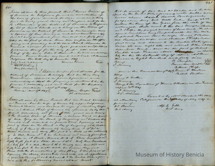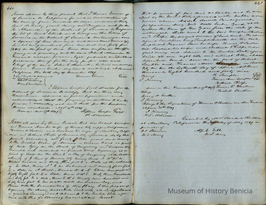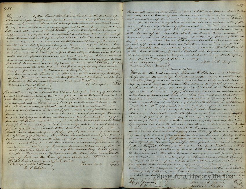 This journal/ledger contains the beginnings of Benicia including: lists and descriptions of first 12 houses in Benicia, a translation of the deed to General Vallejo by Manual Micheltorena, Governor of Calif. (1844); deed to Semple and Larkin by Vallejo (1847); deeds of properties sold by Semple and Larkin from 1847 - 1849