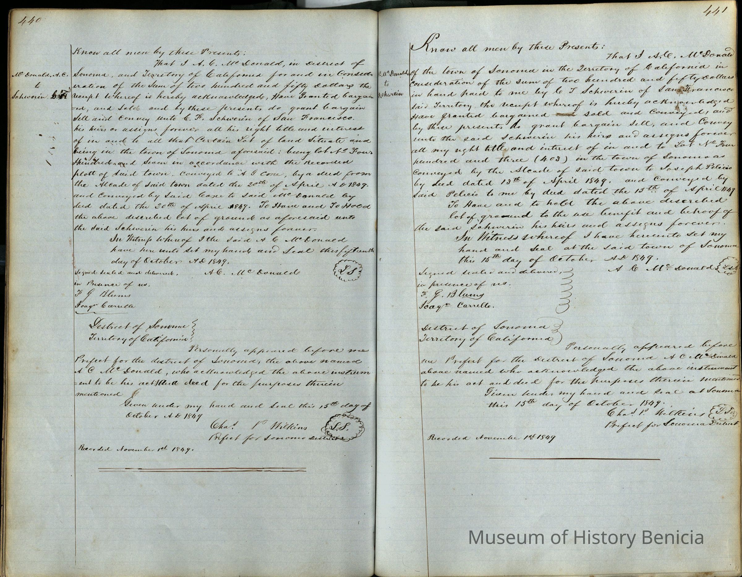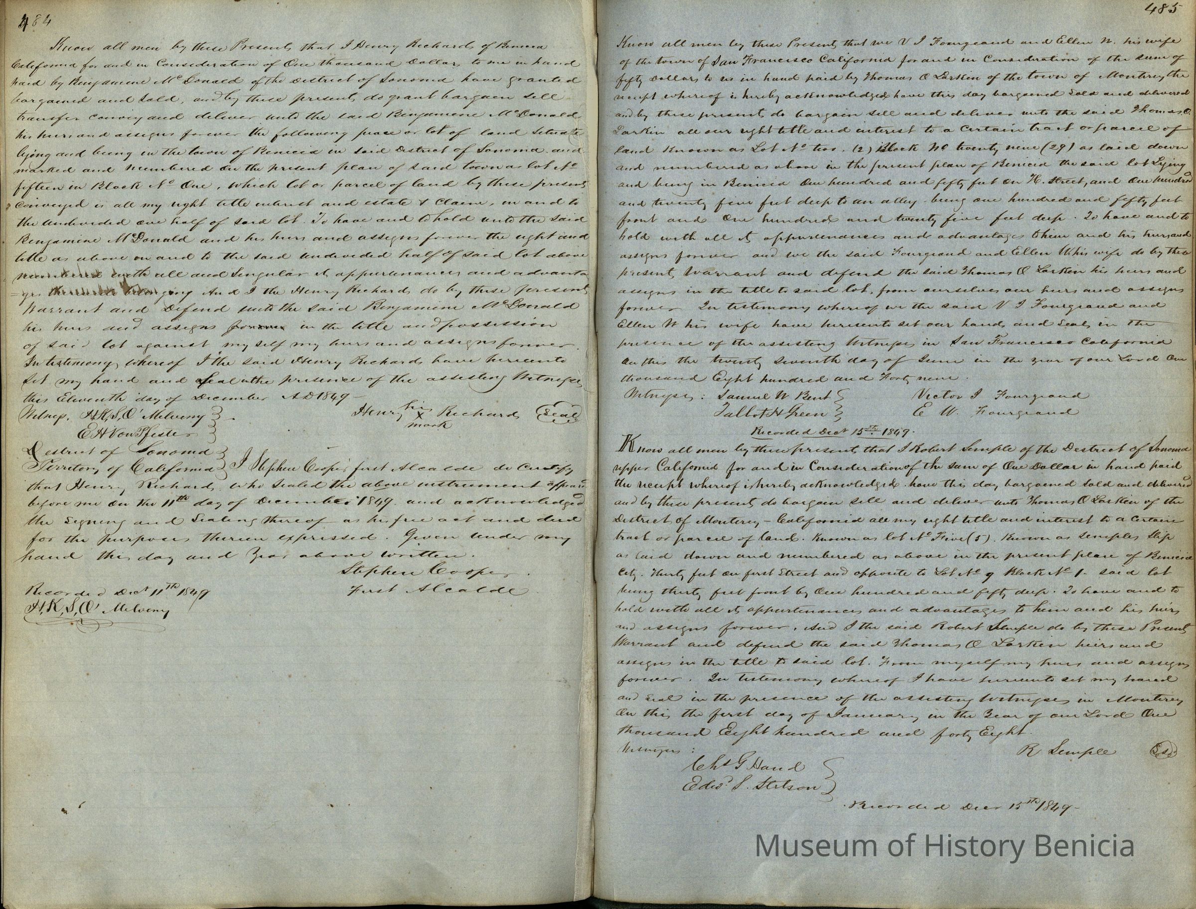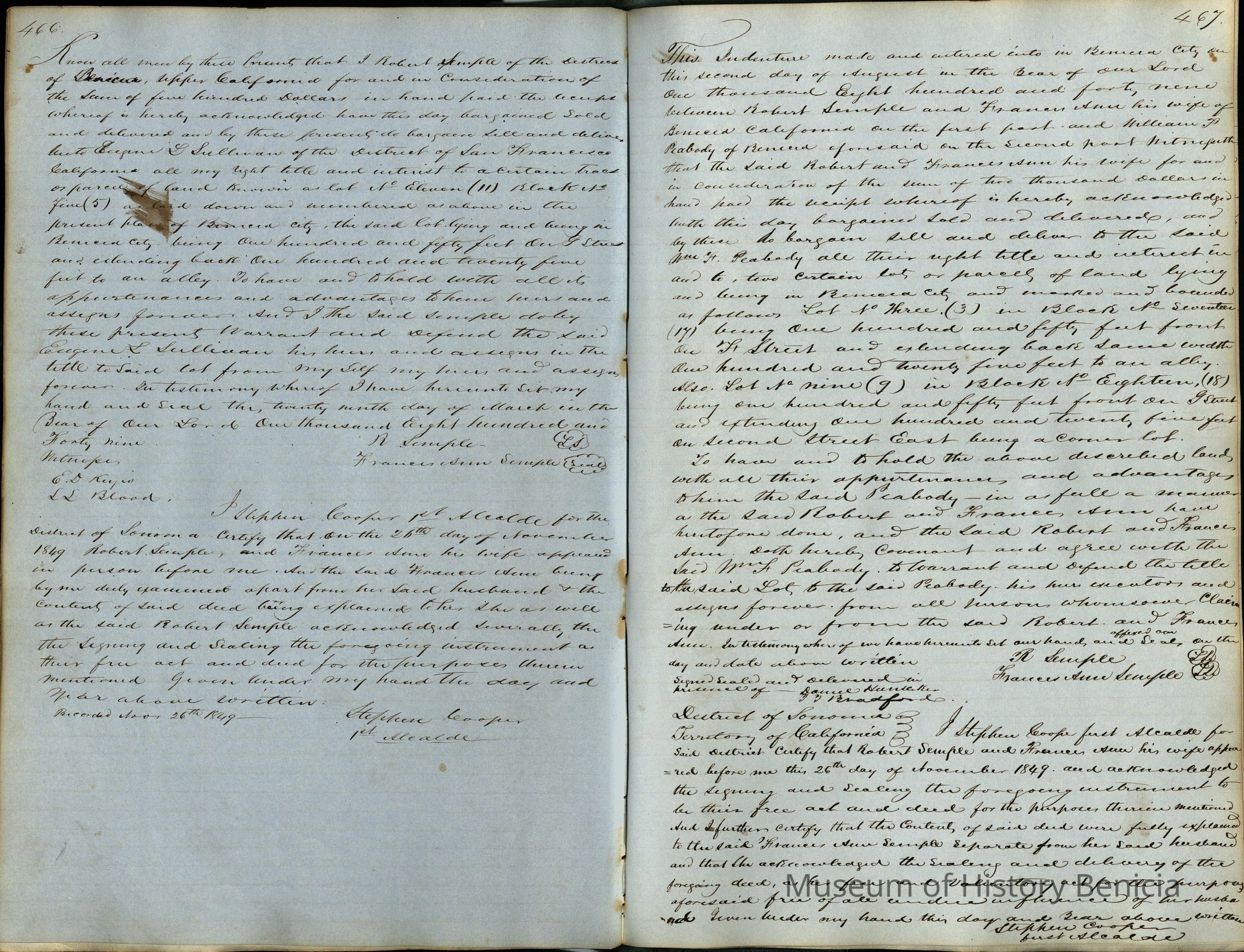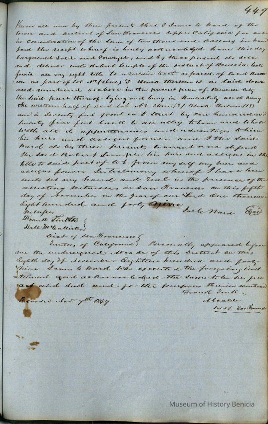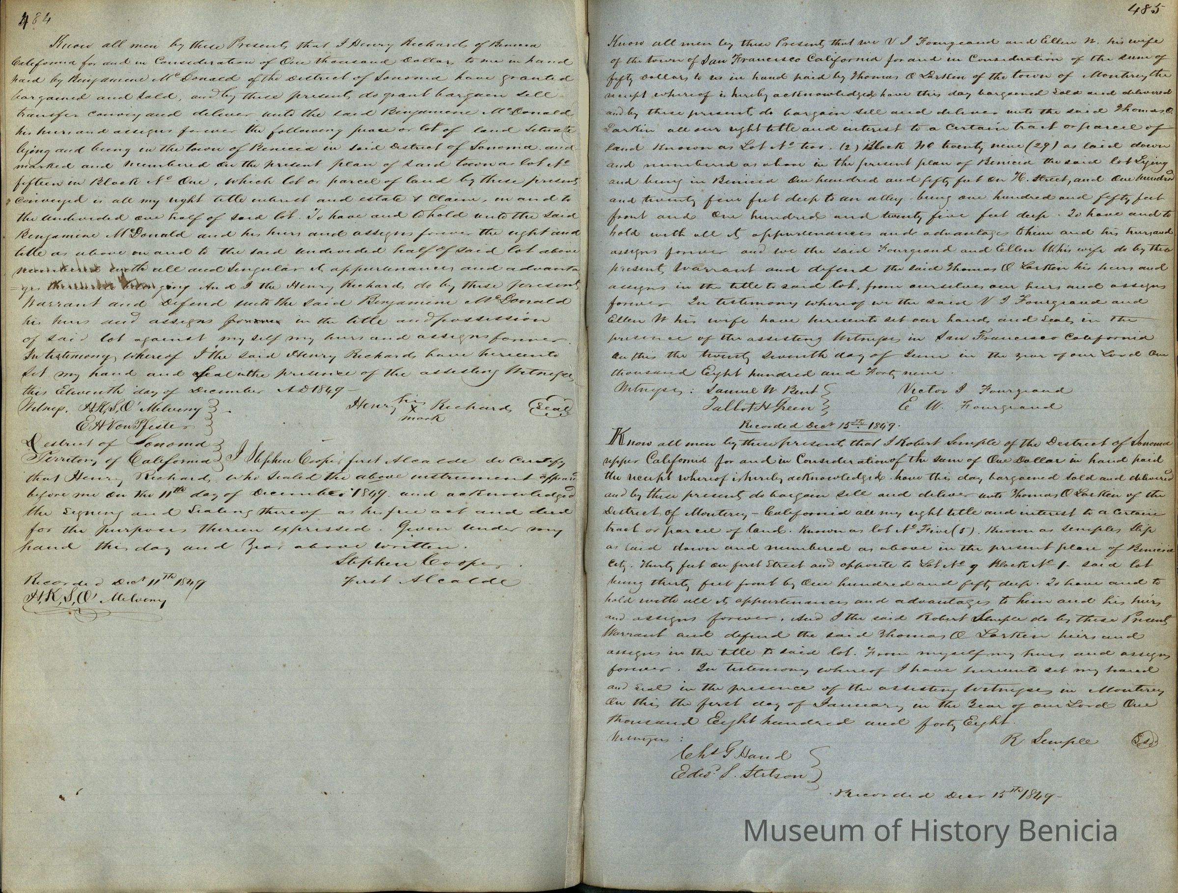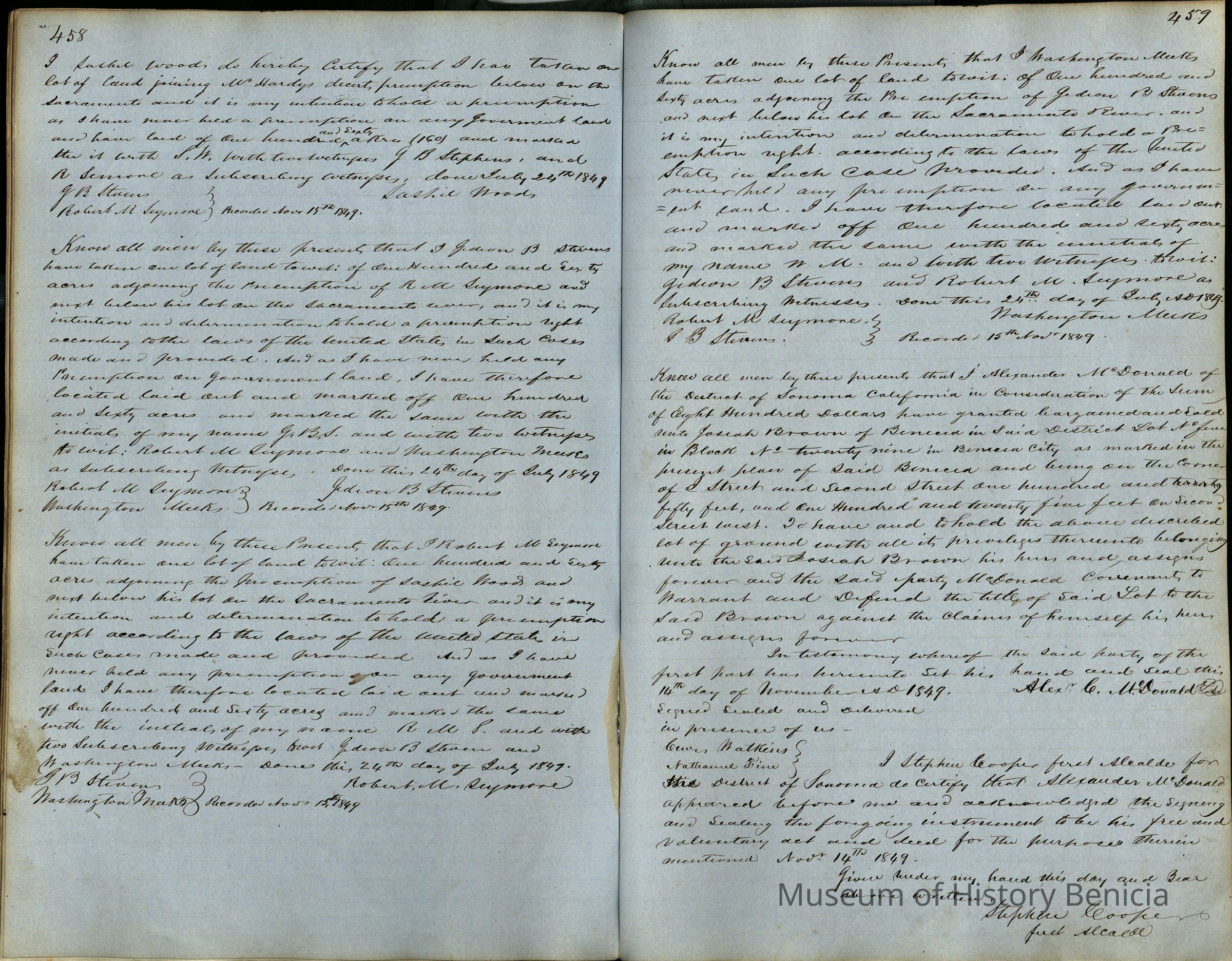 This journal/ledger contains the beginnings of Benicia including: lists and descriptions of first 12 houses in Benicia, a translation of the deed to General Vallejo by Manual Micheltorena, Governor of Calif. (1844); deed to Semple and Larkin by Vallejo (1847); deeds of properties sold by Semple and Larkin from 1847 - 1849
