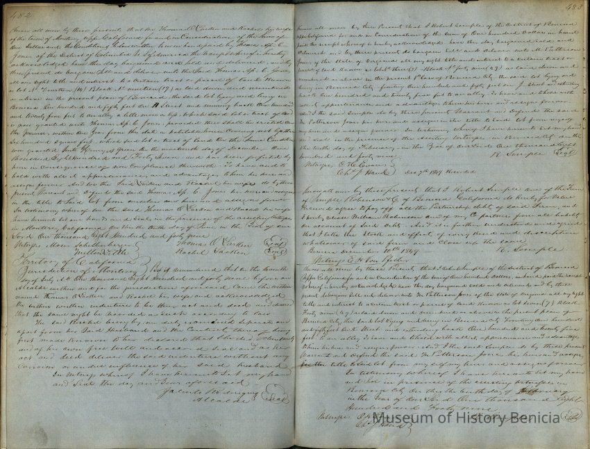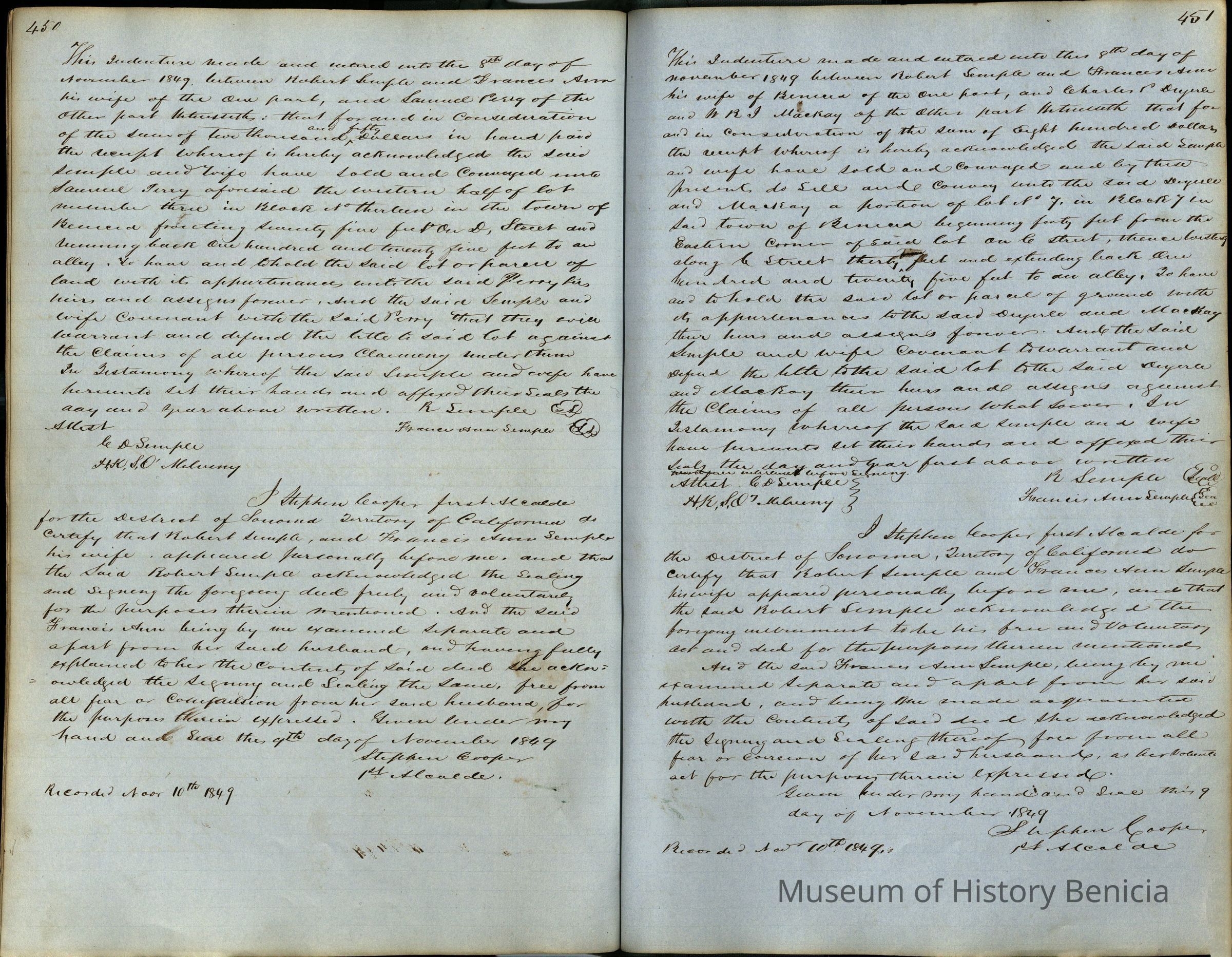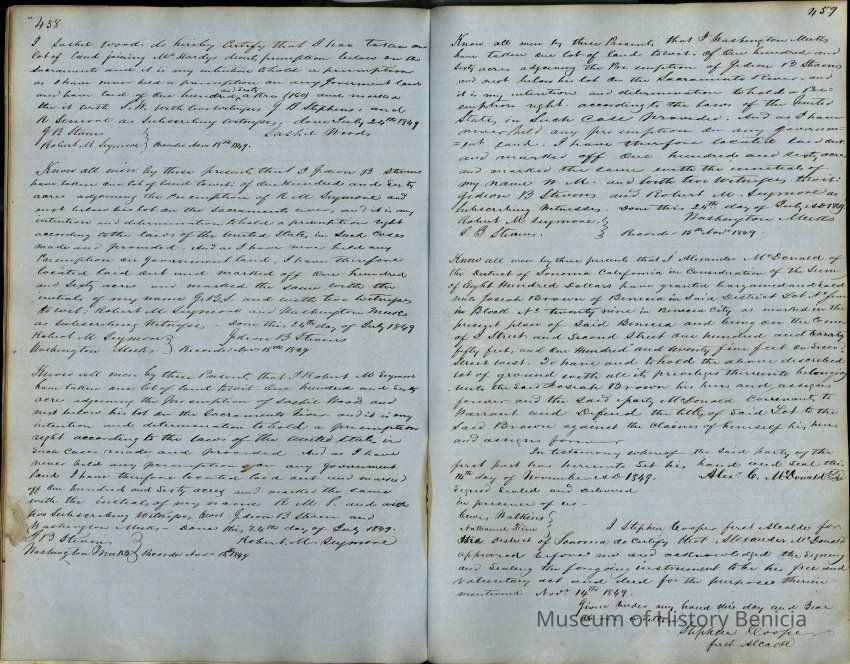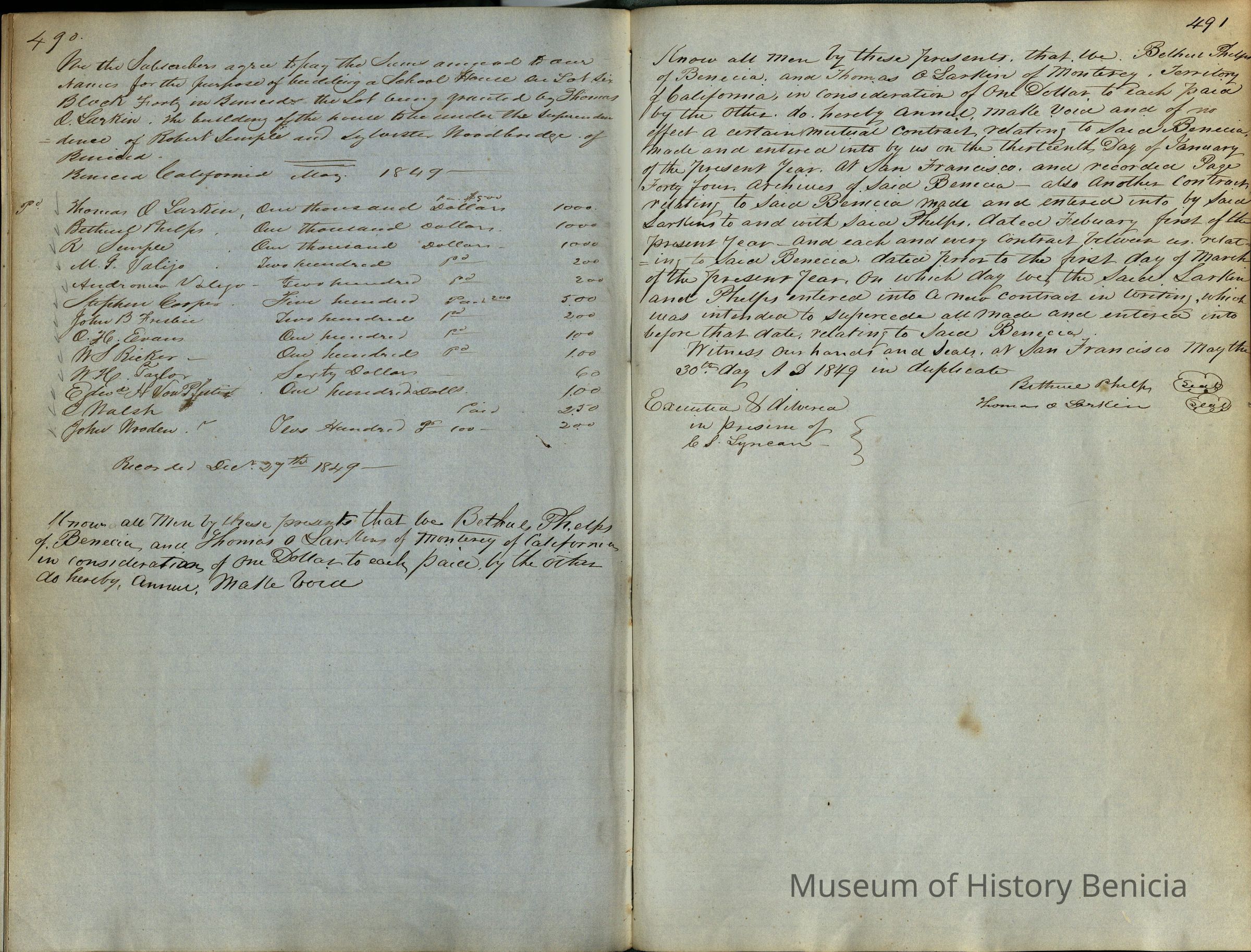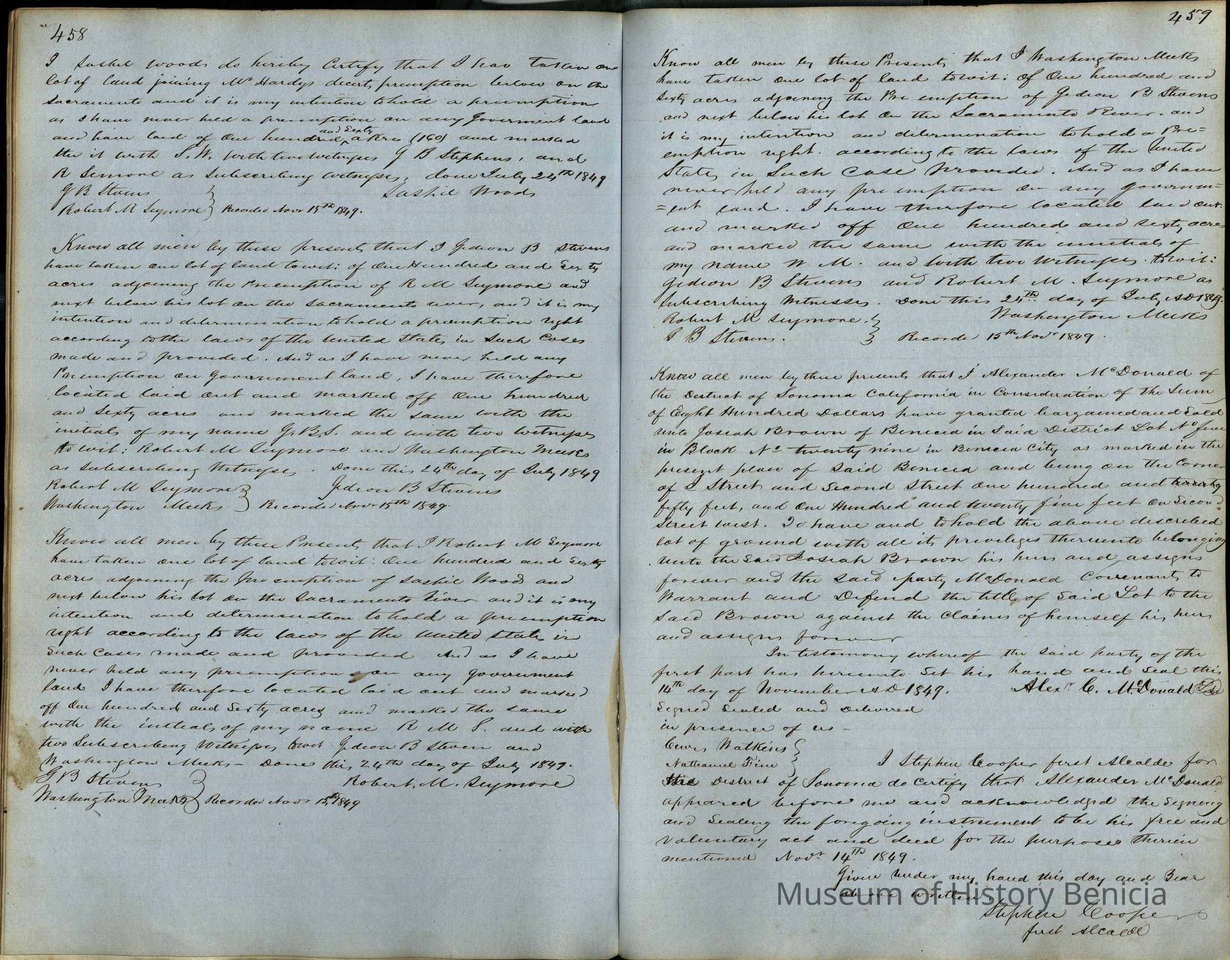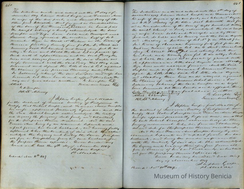 This journal/ledger contains the beginnings of Benicia including: lists and descriptions of first 12 houses in Benicia, a translation of the deed to General Vallejo by Manual Micheltorena, Governor of Calif. (1844); deed to Semple and Larkin by Vallejo (1847); deeds of properties sold by Semple and Larkin from 1847 - 1849