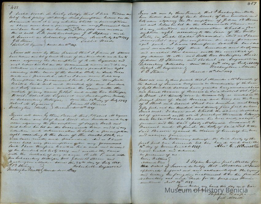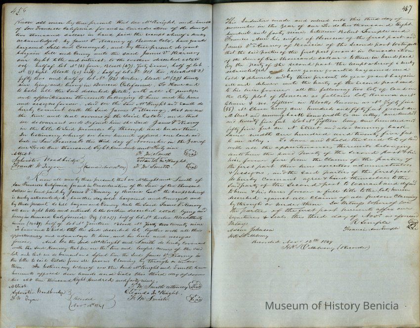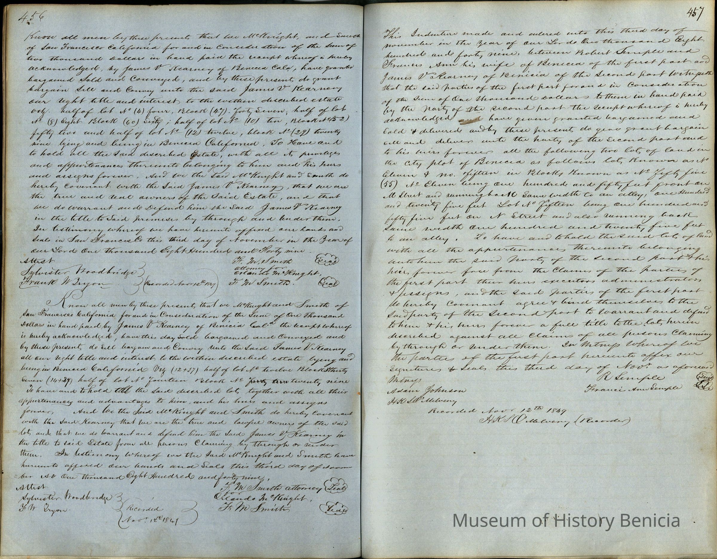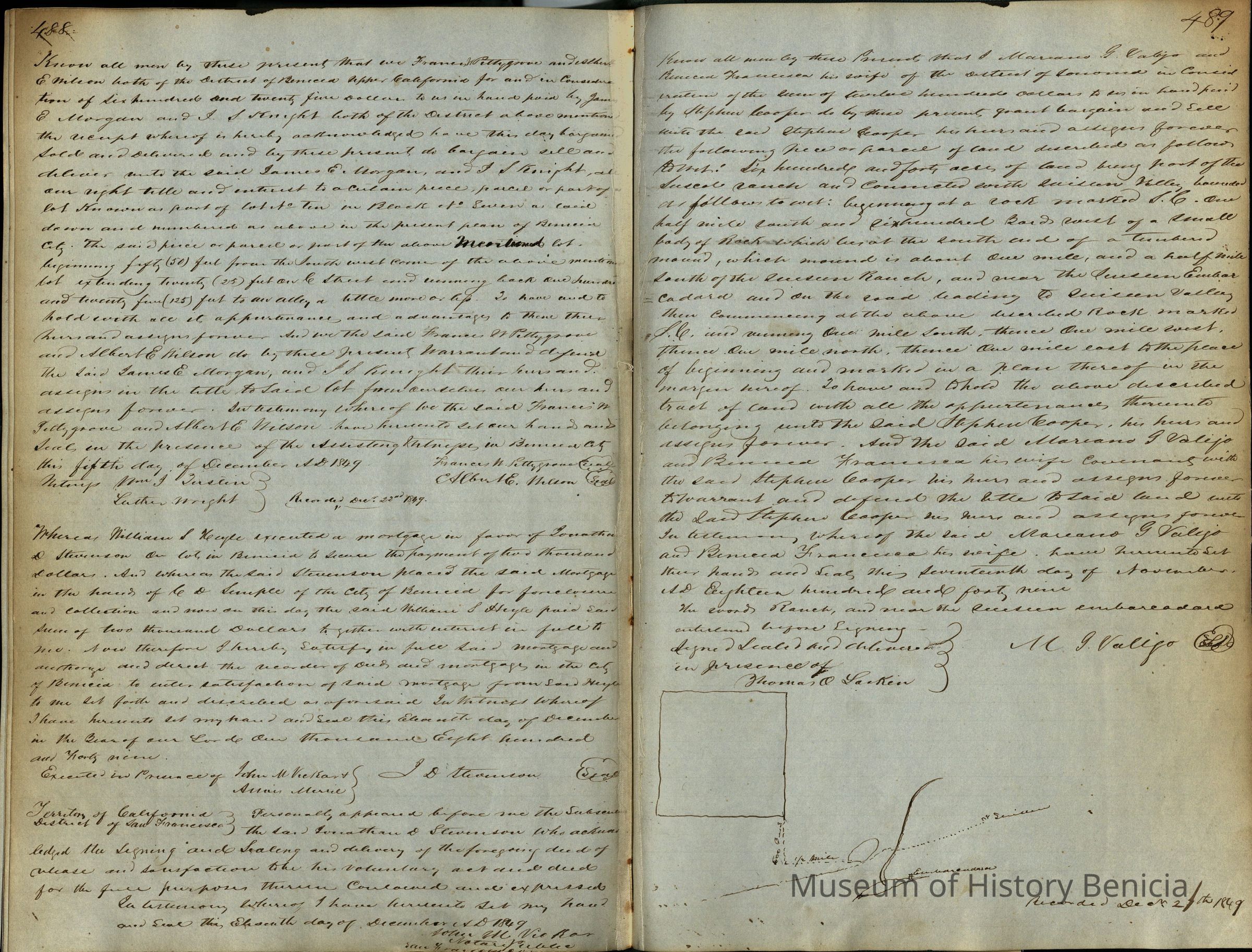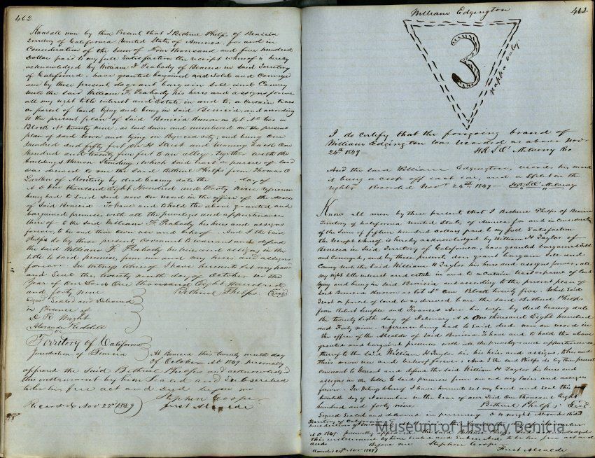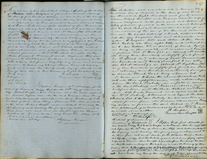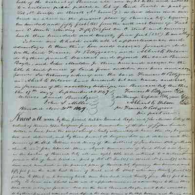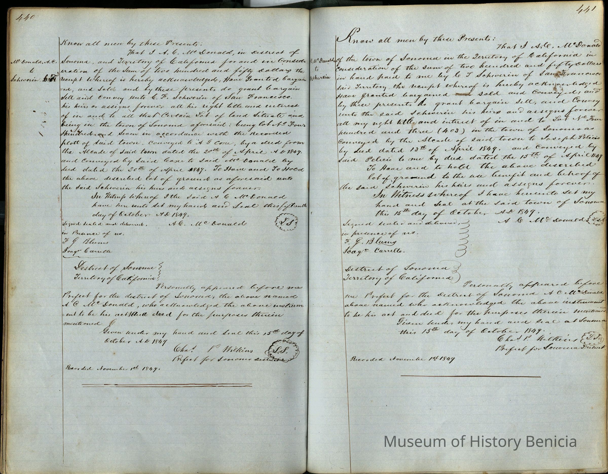 This journal/ledger contains the beginnings of Benicia including: lists and descriptions of first 12 houses in Benicia, a translation of the deed to General Vallejo by Manual Micheltorena, Governor of Calif. (1844); deed to Semple and Larkin by Vallejo (1847); deeds of properties sold by Semple and Larkin from 1847 - 1849