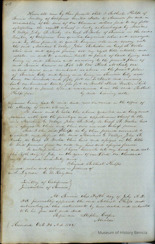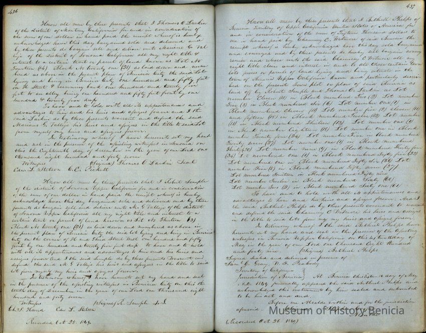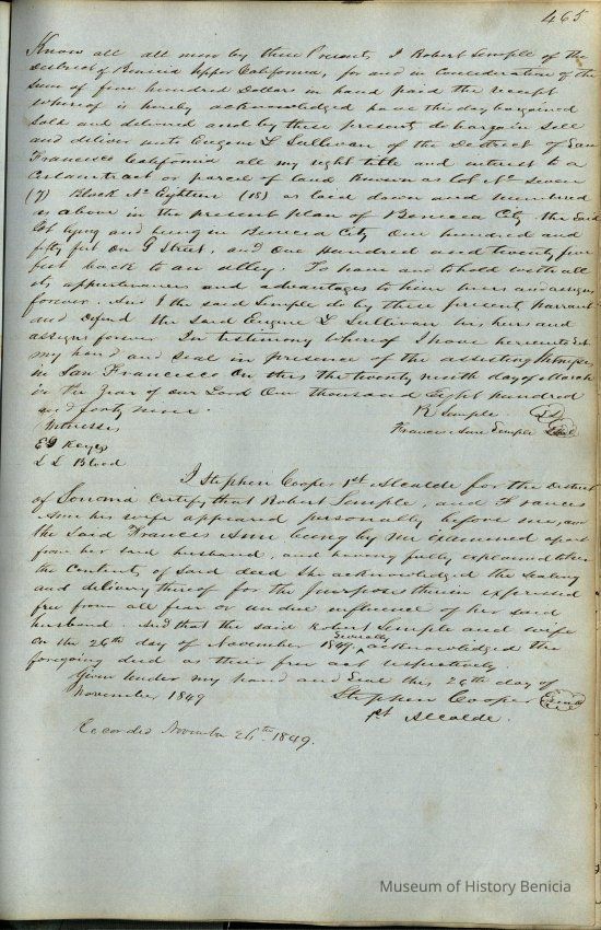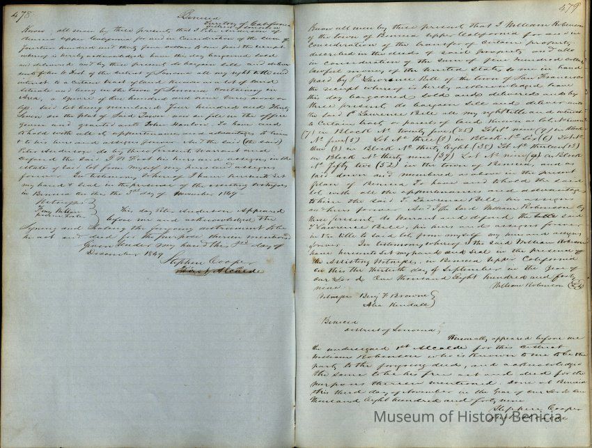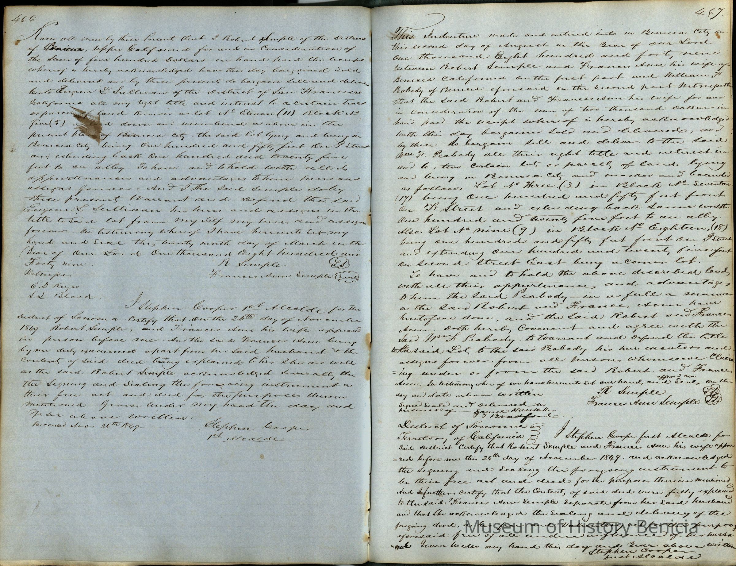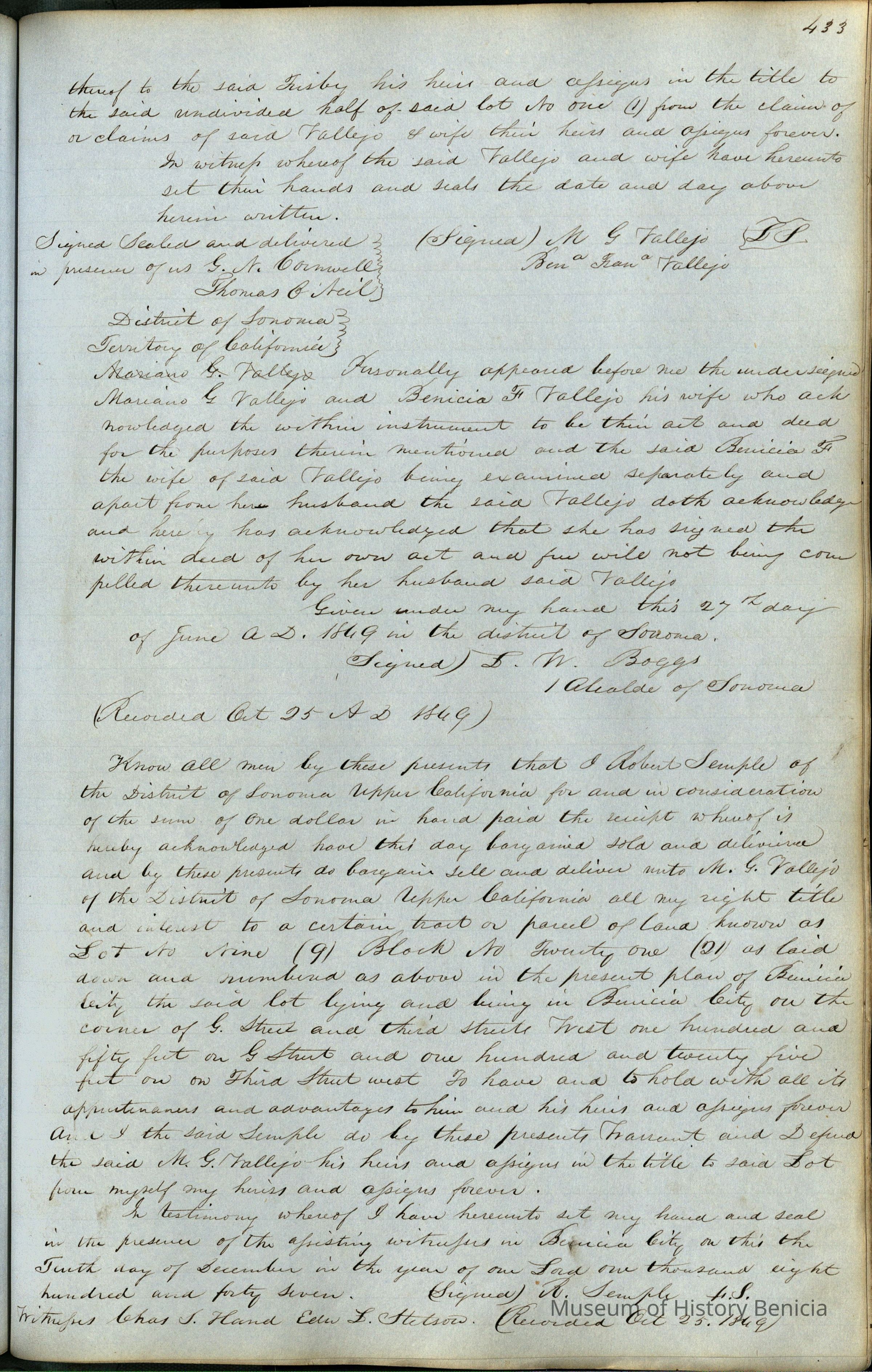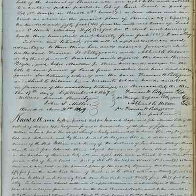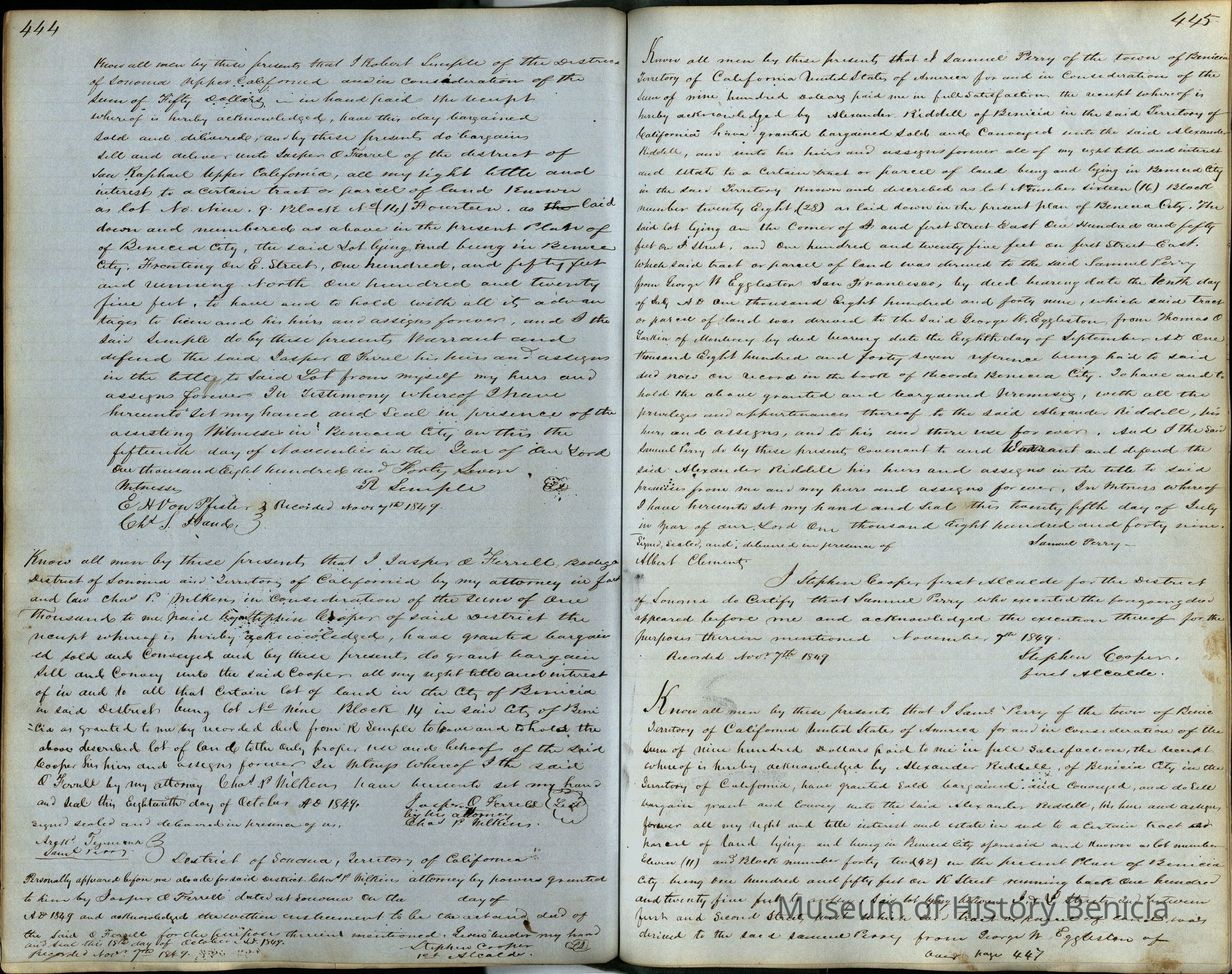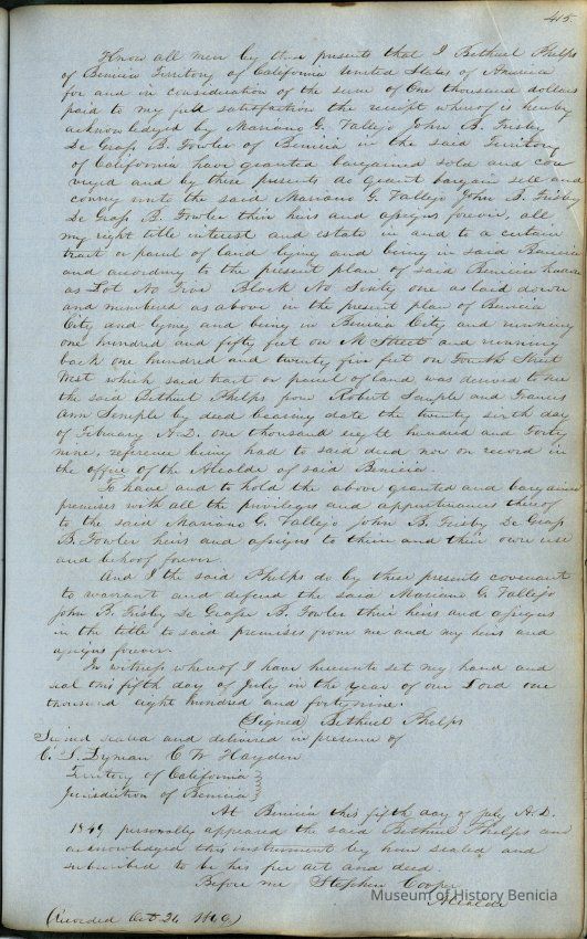 This journal/ledger contains the beginnings of Benicia including: lists and descriptions of first 12 houses in Benicia, a translation of the deed to General Vallejo by Manual Micheltorena, Governor of Calif. (1844); deed to Semple and Larkin by Vallejo (1847); deeds of properties sold by Semple and Larkin from 1847 - 1849