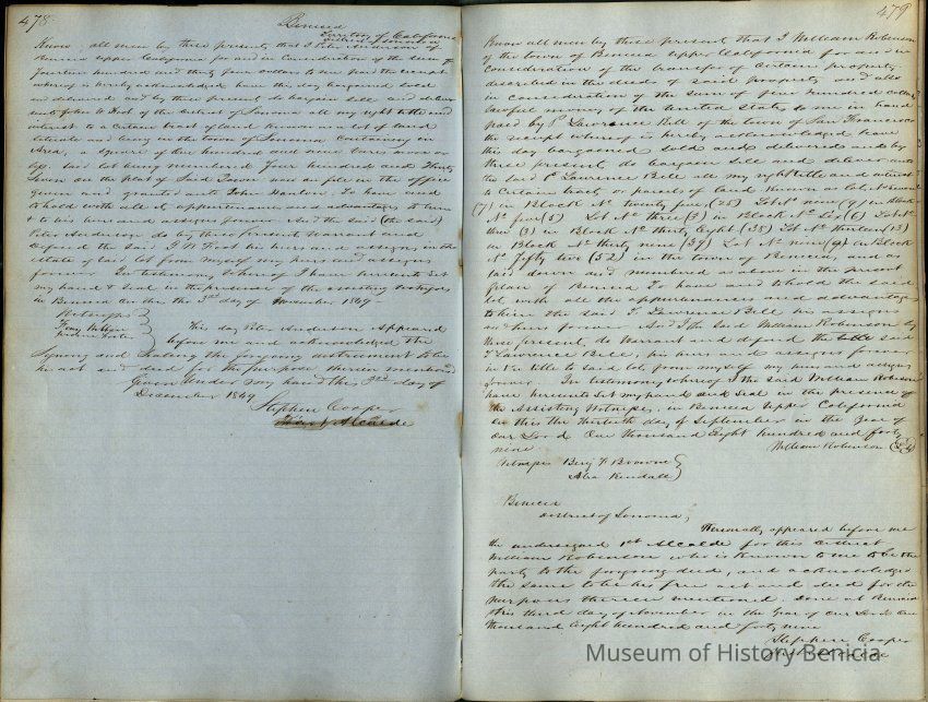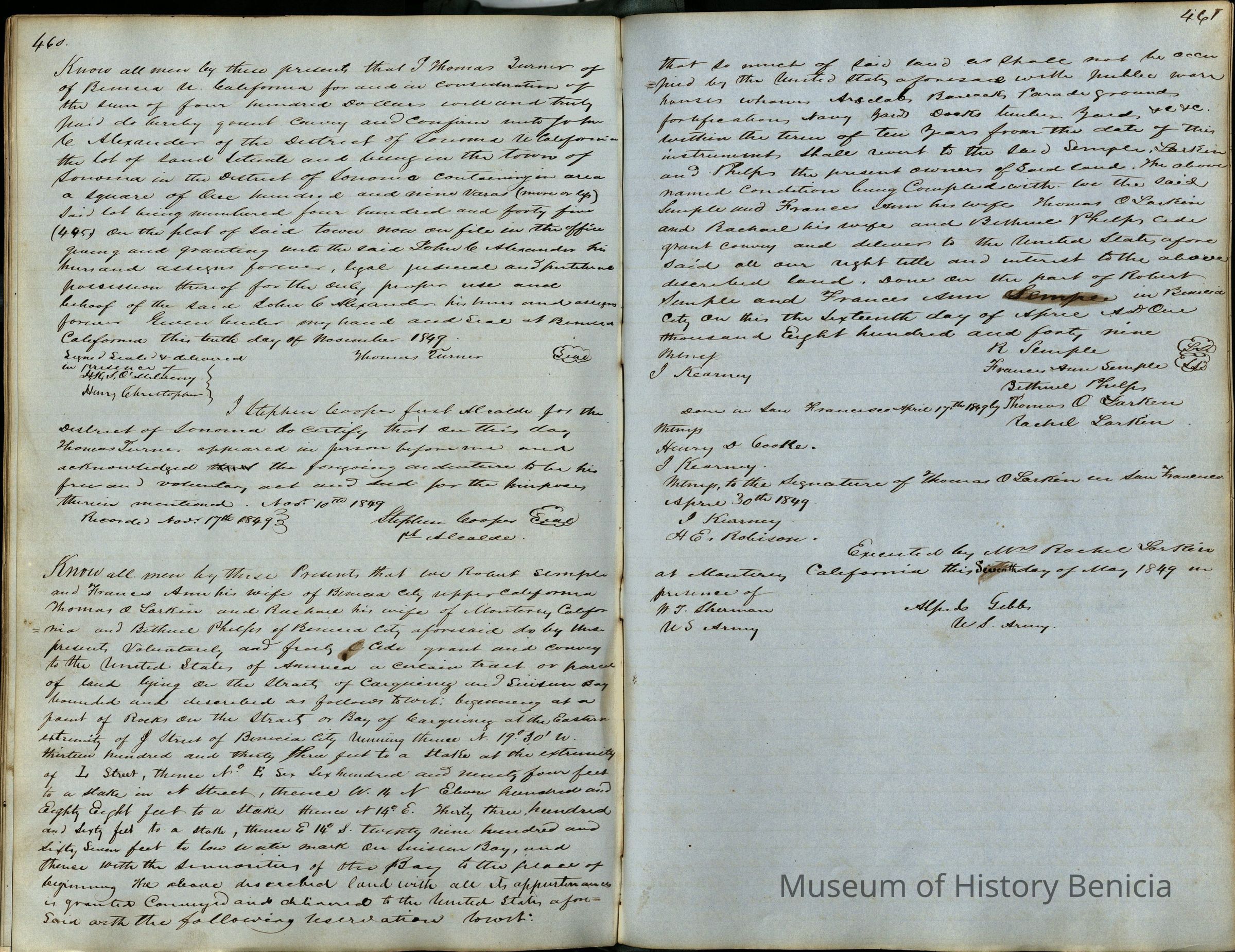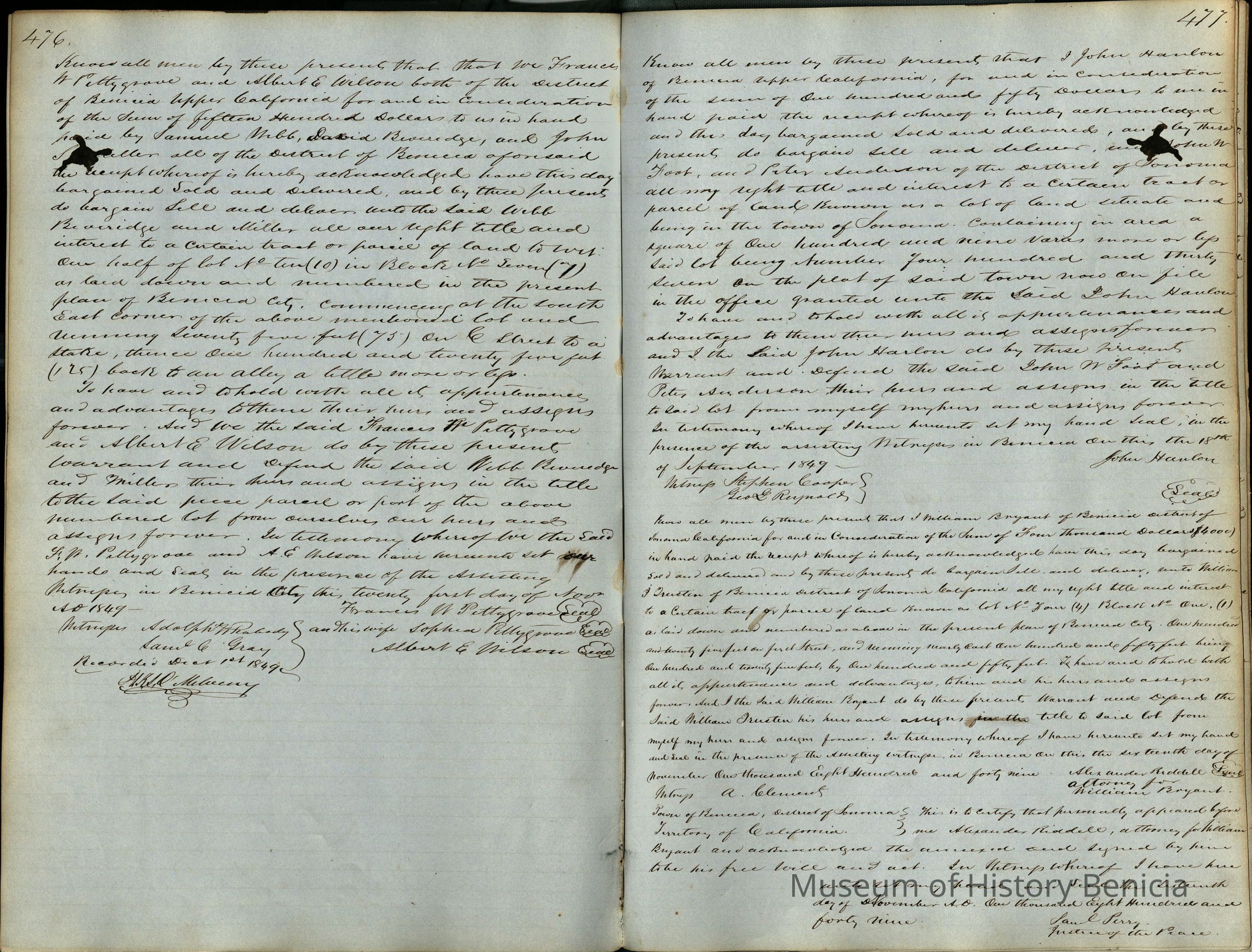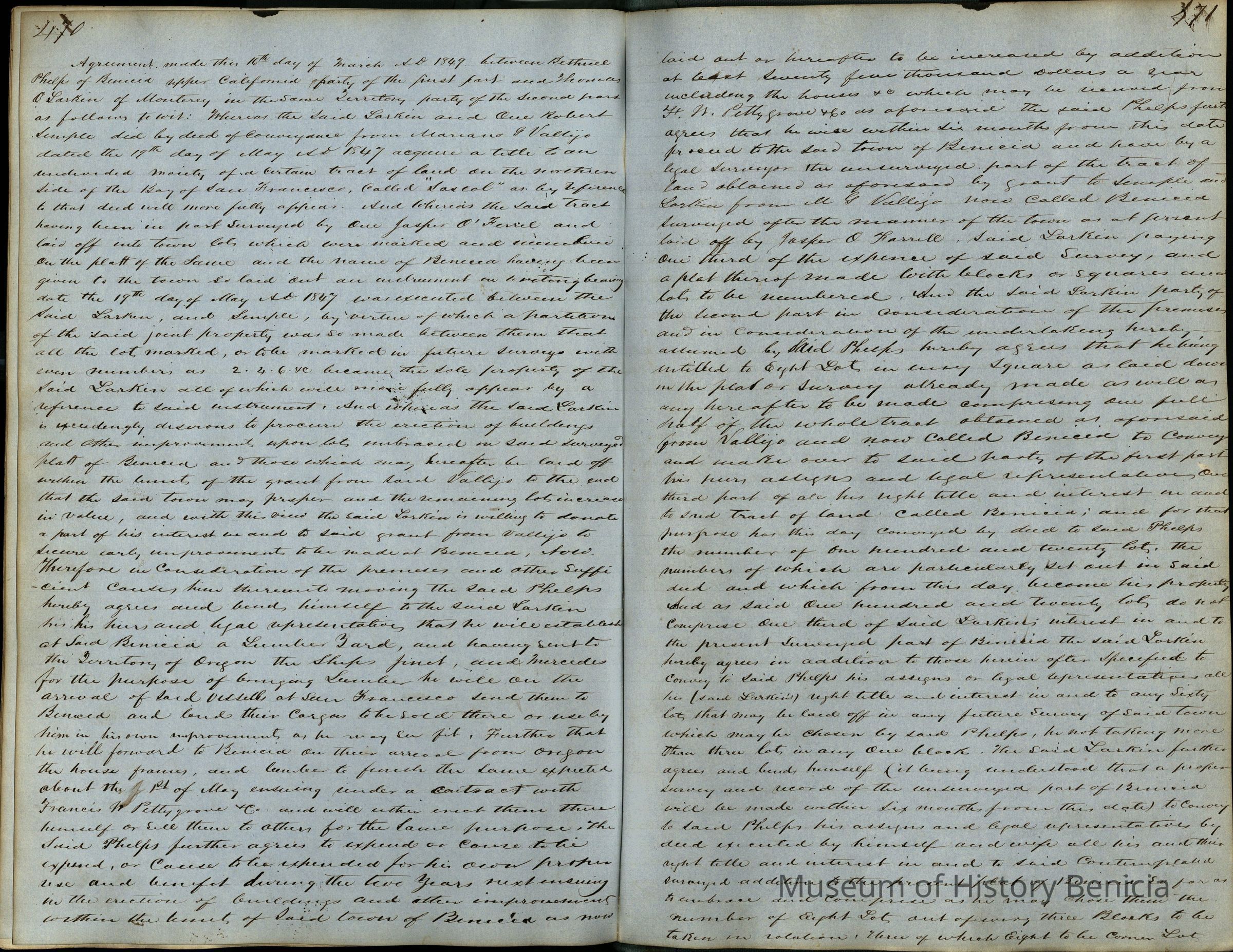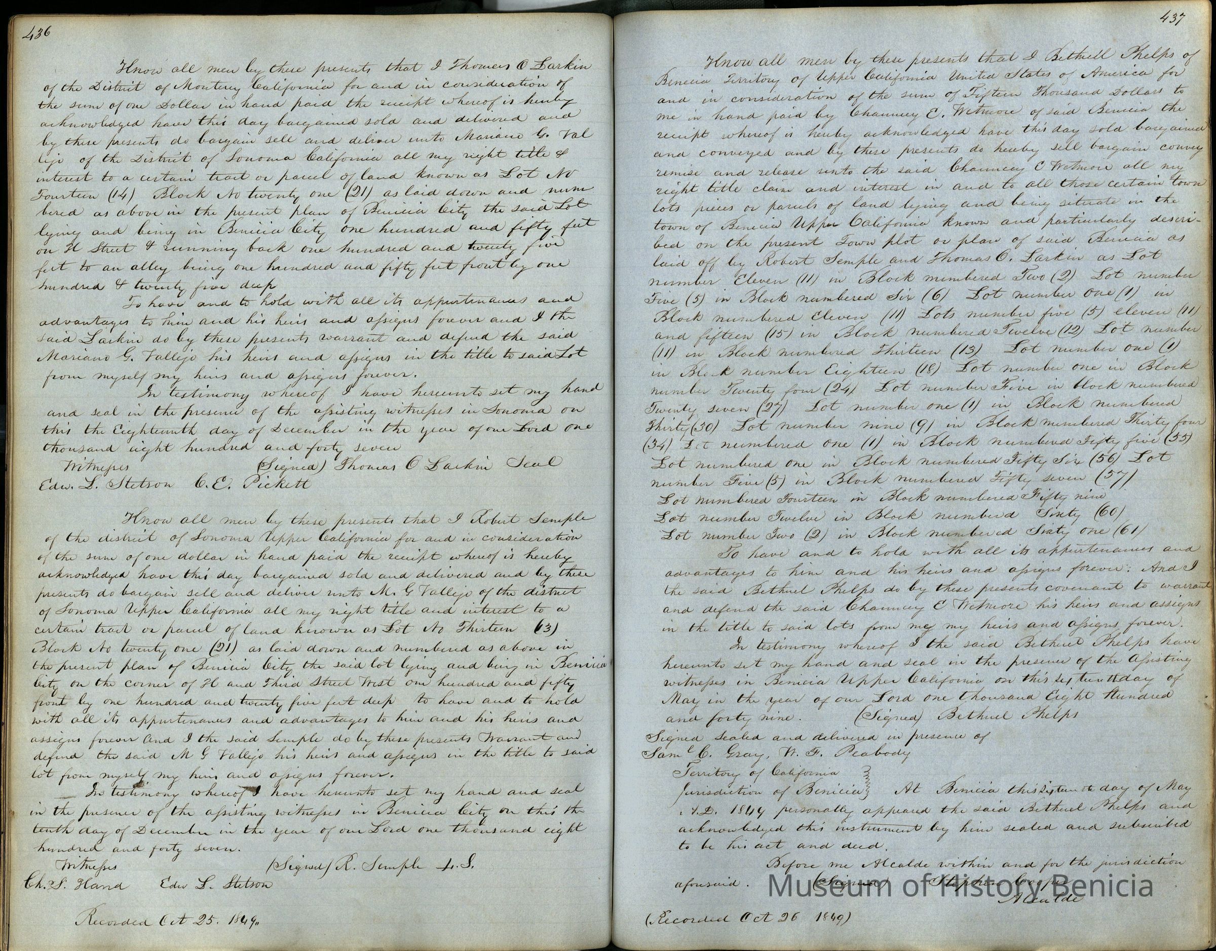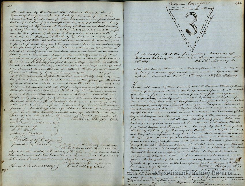 This journal/ledger contains the beginnings of Benicia including: lists and descriptions of first 12 houses in Benicia, a translation of the deed to General Vallejo by Manual Micheltorena, Governor of Calif. (1844); deed to Semple and Larkin by Vallejo (1847); deeds of properties sold by Semple and Larkin from 1847 - 1849