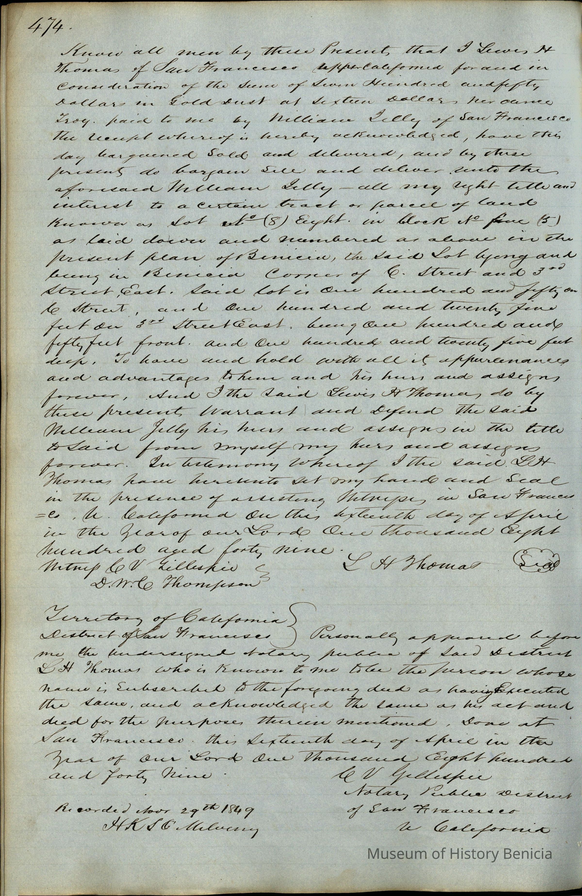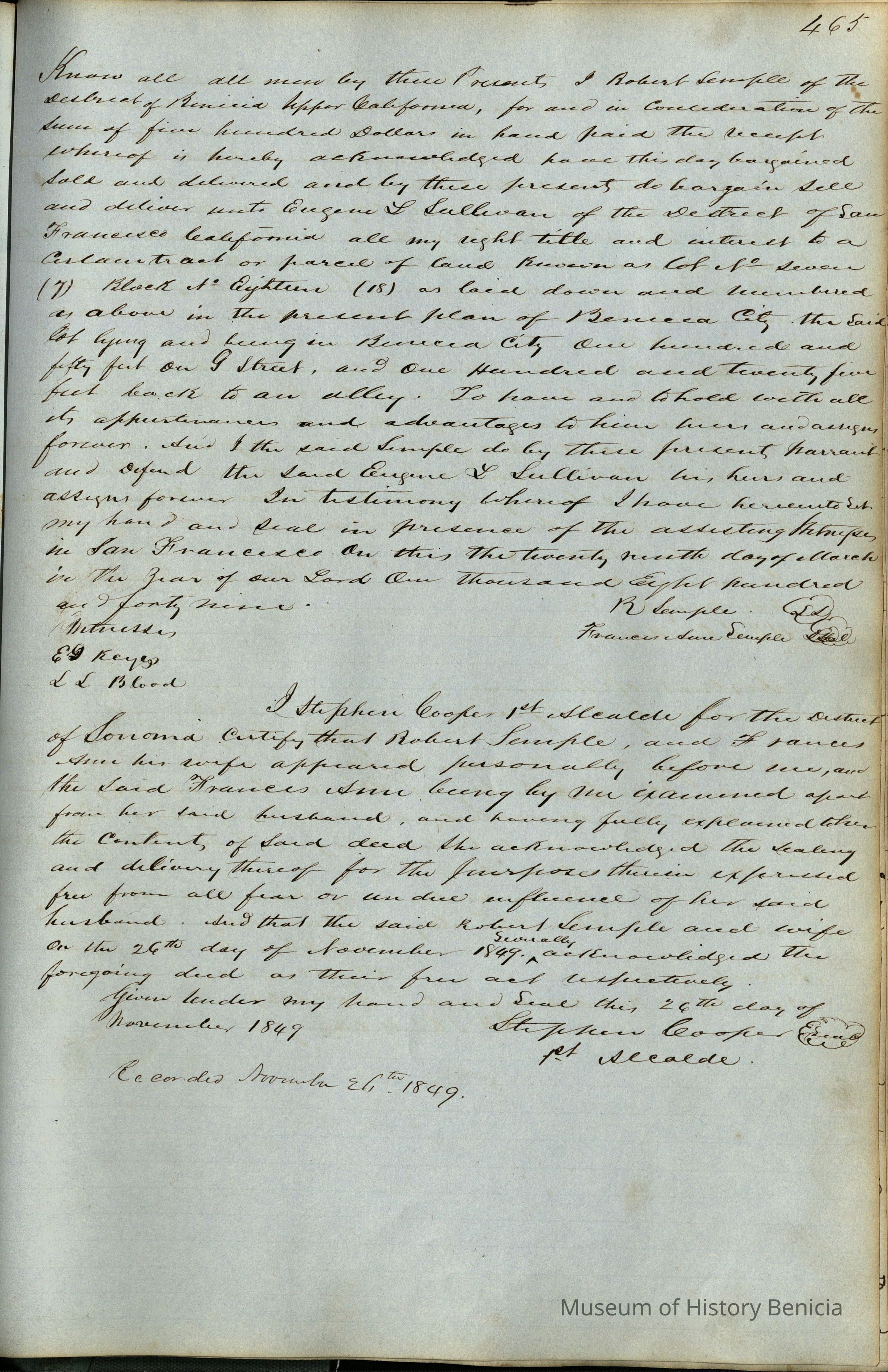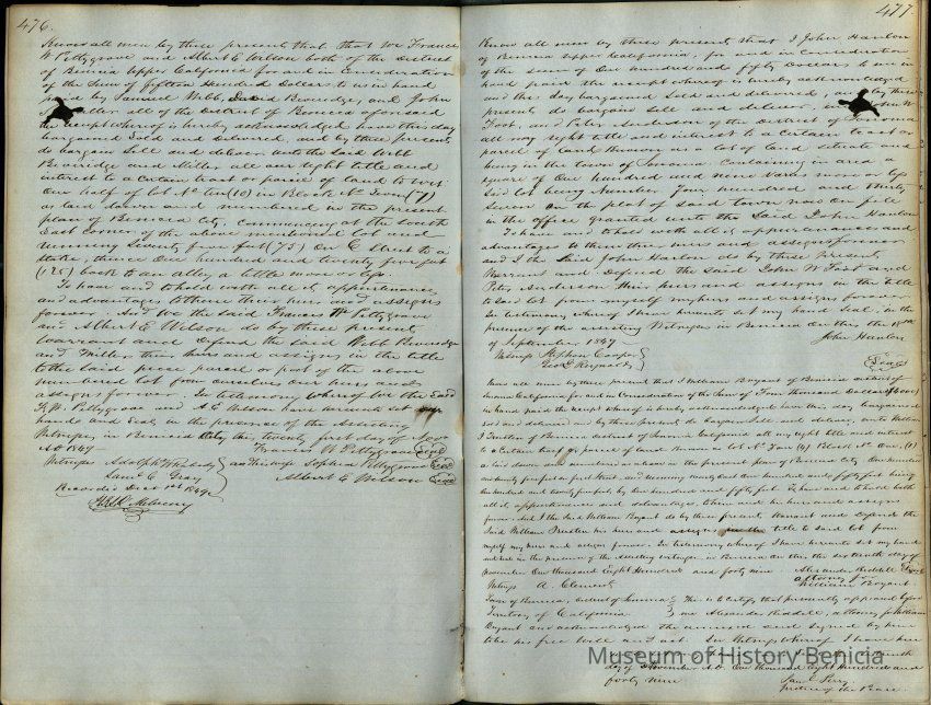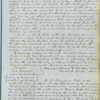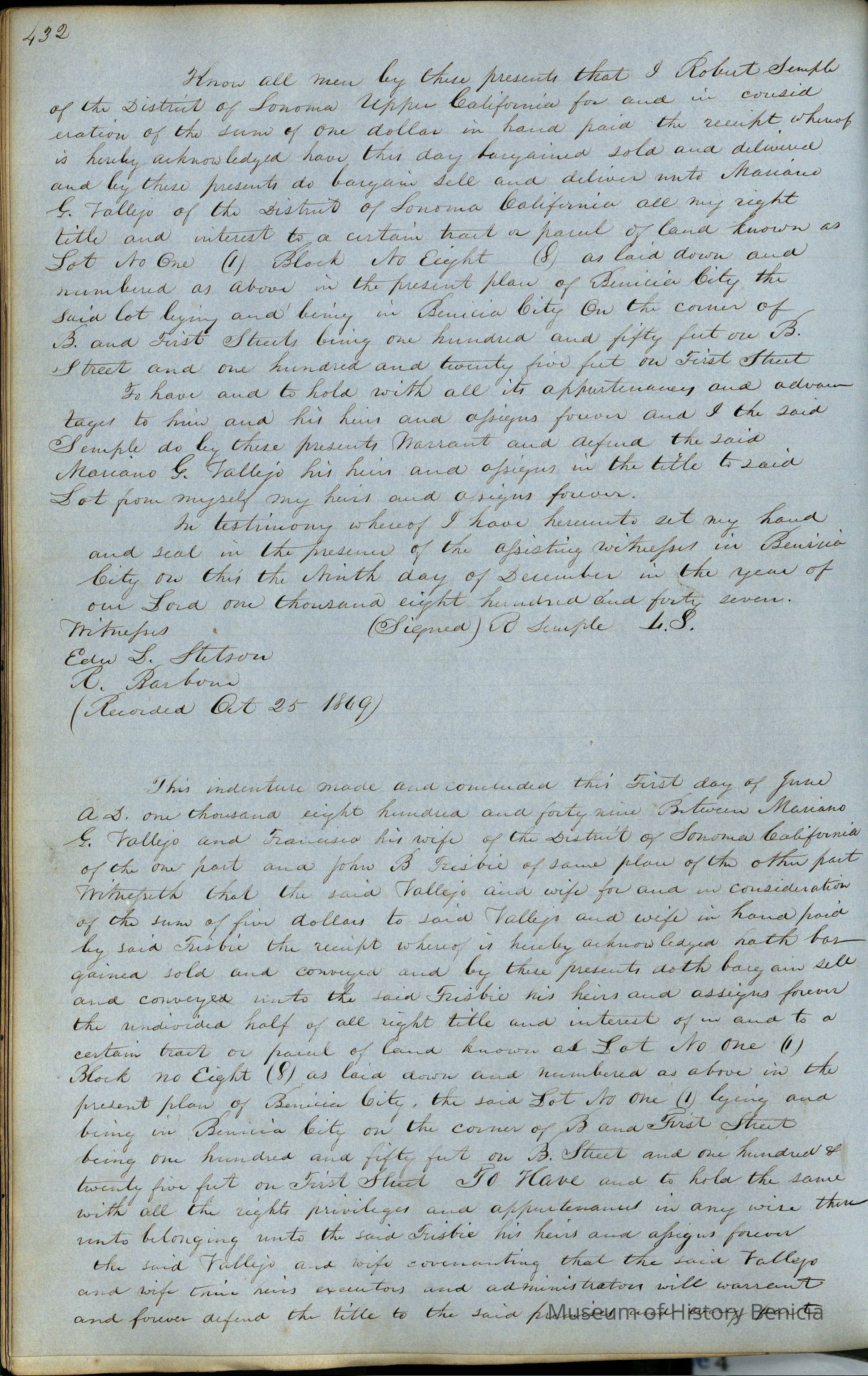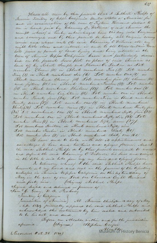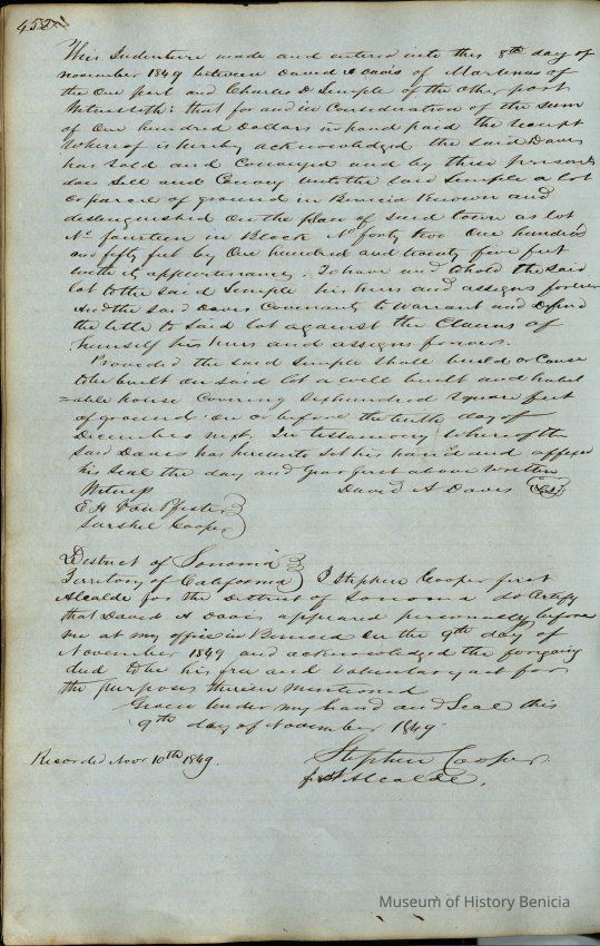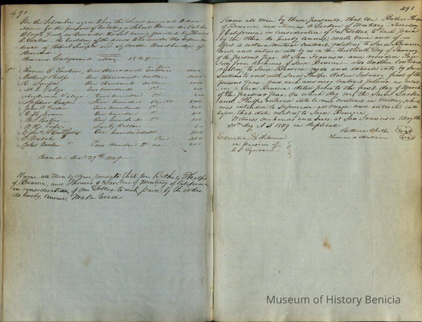 This journal/ledger contains the beginnings of Benicia including: lists and descriptions of first 12 houses in Benicia, a translation of the deed to General Vallejo by Manual Micheltorena, Governor of Calif. (1844); deed to Semple and Larkin by Vallejo (1847); deeds of properties sold by Semple and Larkin from 1847 - 1849
