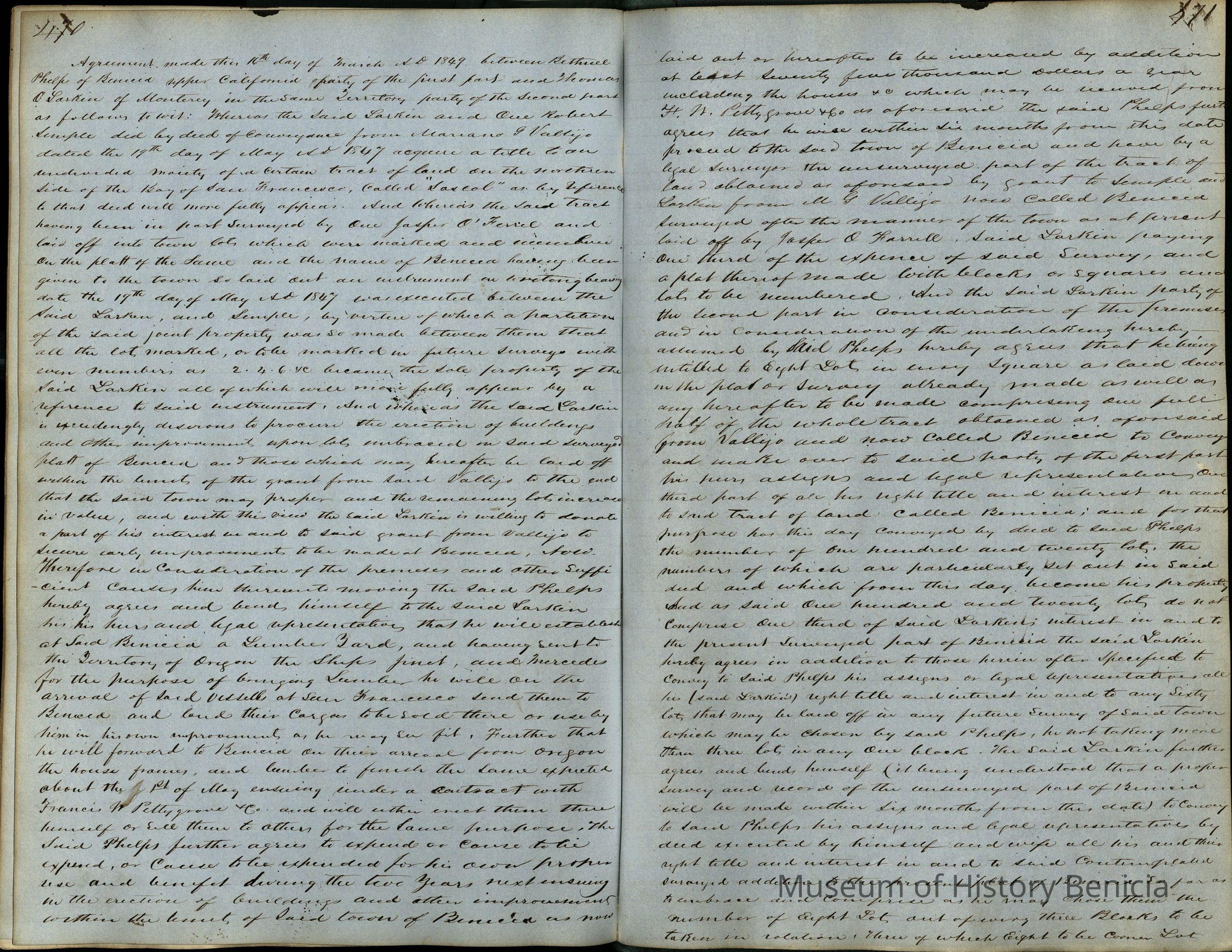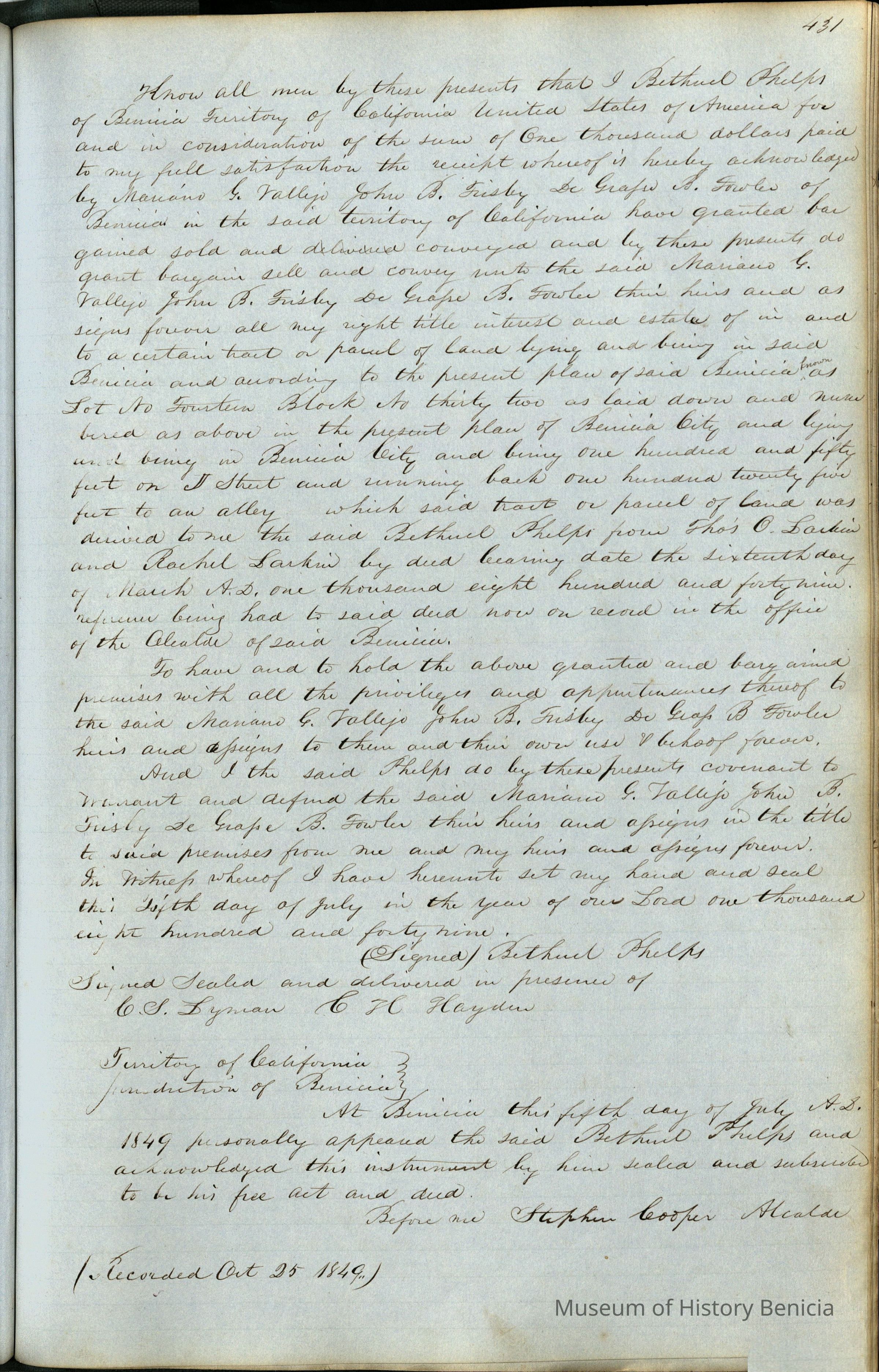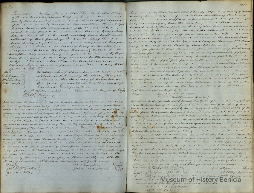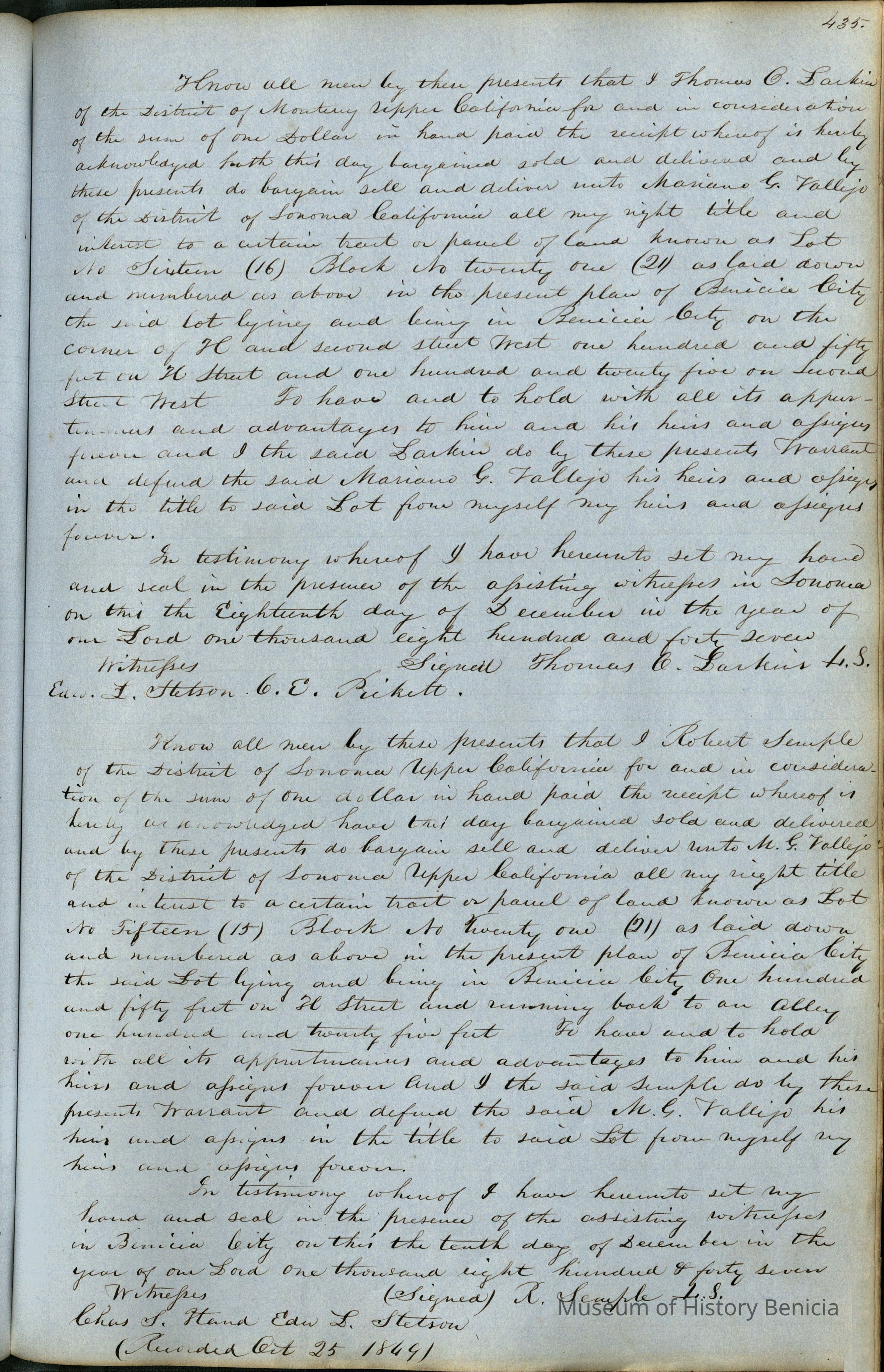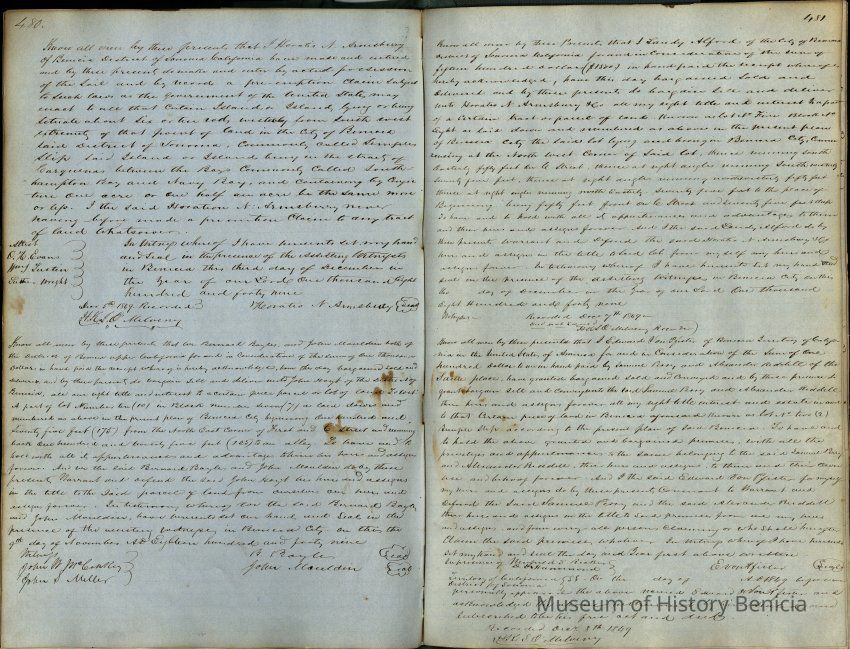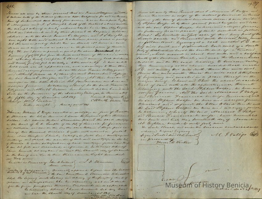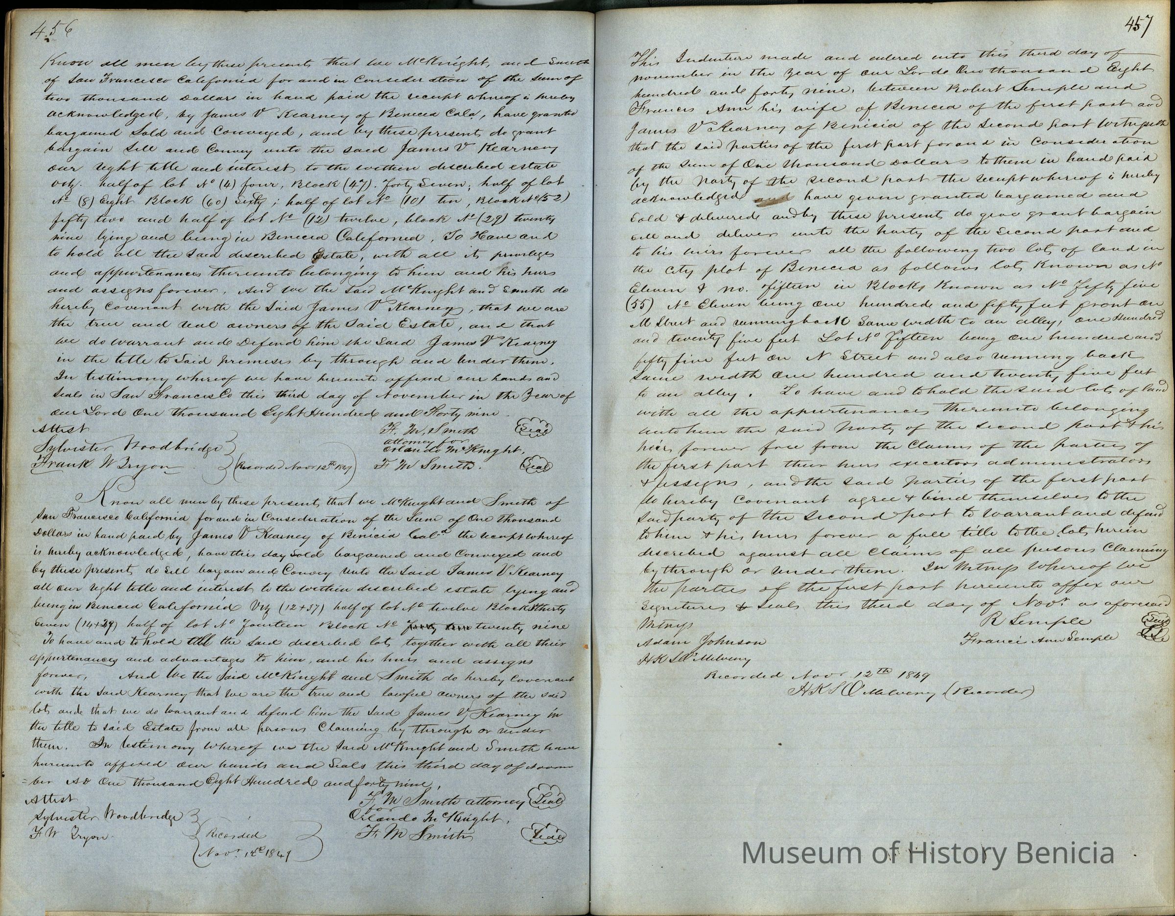 This journal/ledger contains the beginnings of Benicia including: lists and descriptions of first 12 houses in Benicia, a translation of the deed to General Vallejo by Manual Micheltorena, Governor of Calif. (1844); deed to Semple and Larkin by Vallejo (1847); deeds of properties sold by Semple and Larkin from 1847 - 1849