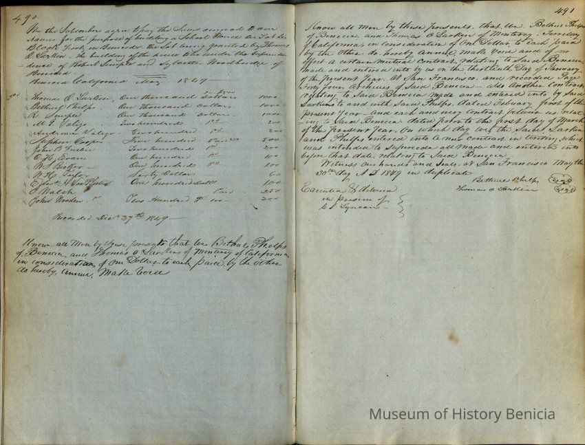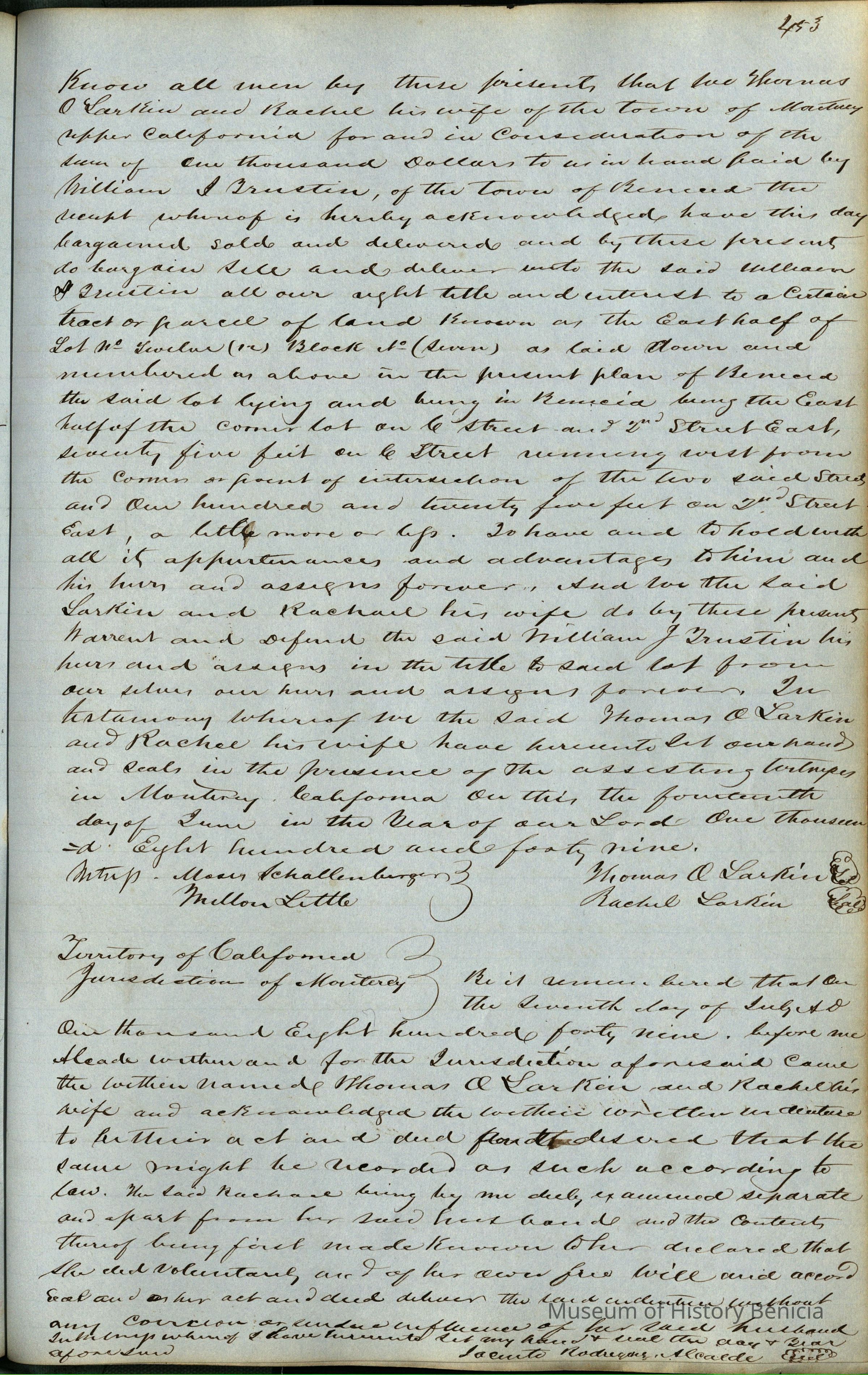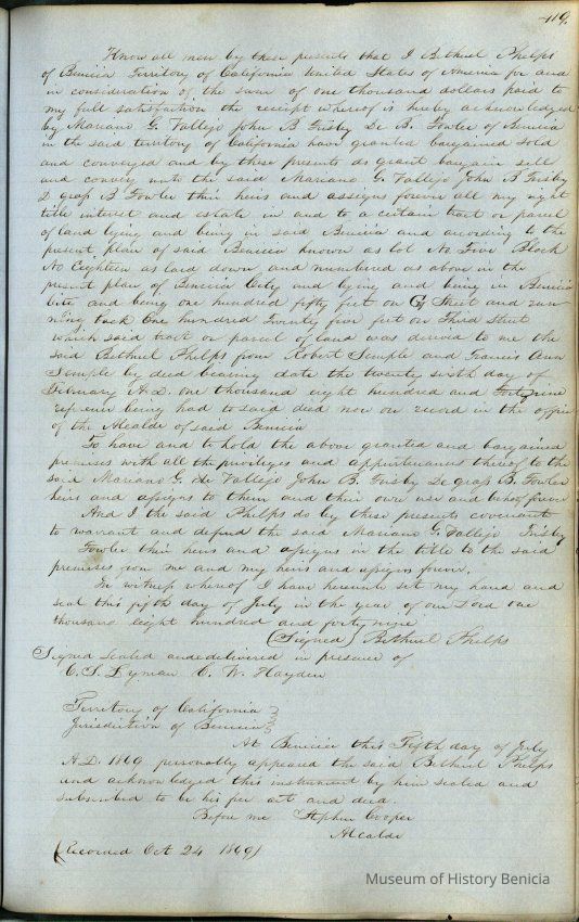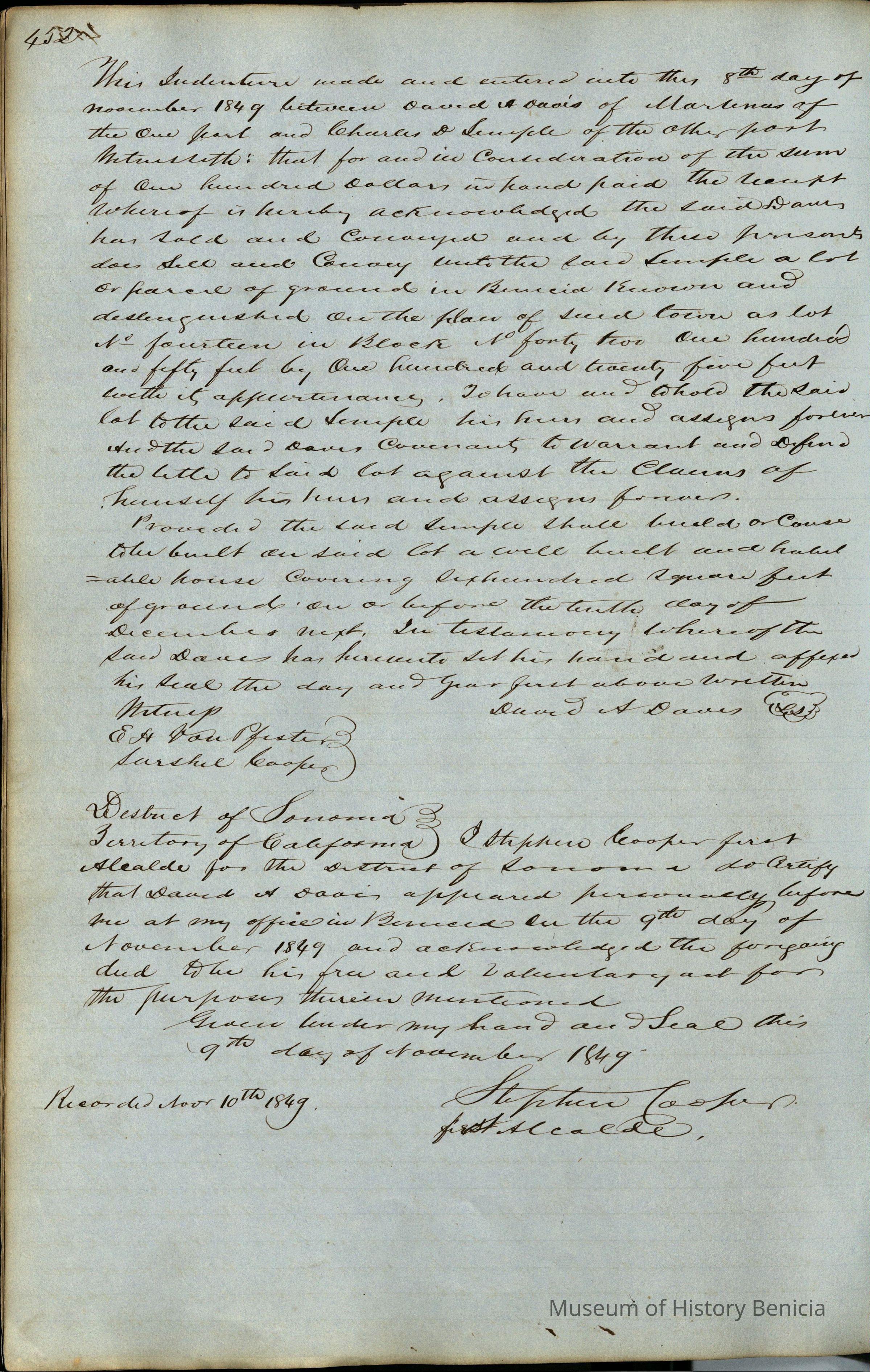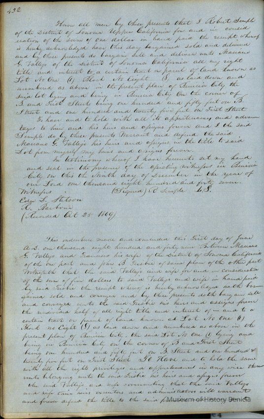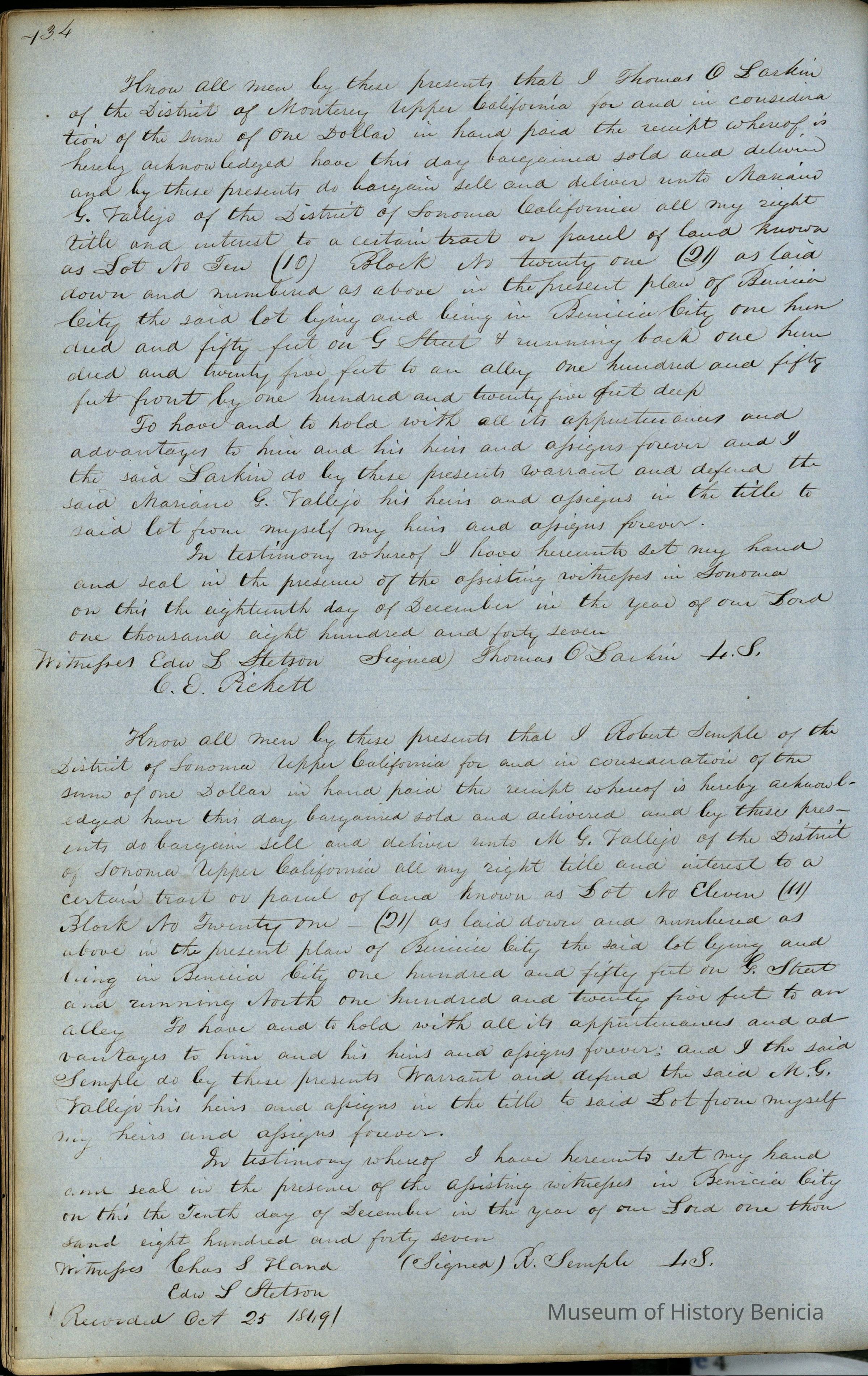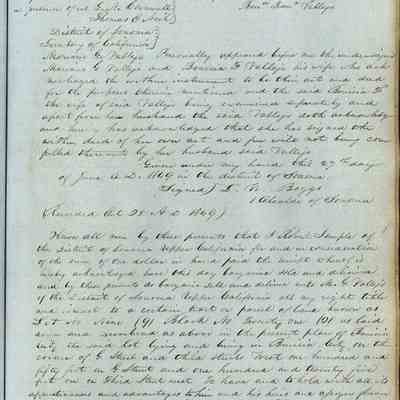 This journal/ledger contains the beginnings of Benicia including: lists and descriptions of first 12 houses in Benicia, a translation of the deed to General Vallejo by Manual Micheltorena, Governor of Calif. (1844); deed to Semple and Larkin by Vallejo (1847); deeds of properties sold by Semple and Larkin from 1847 - 1849