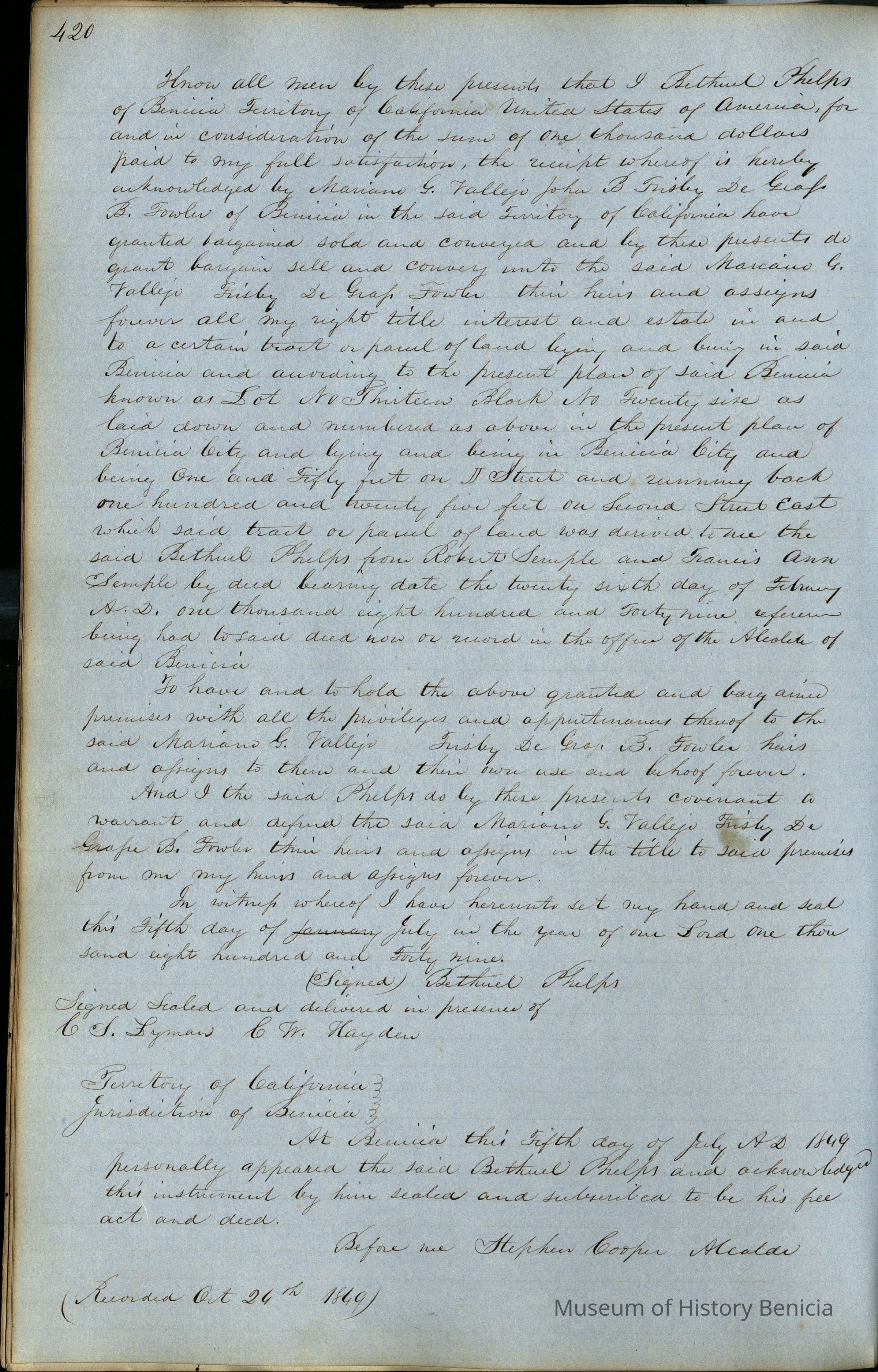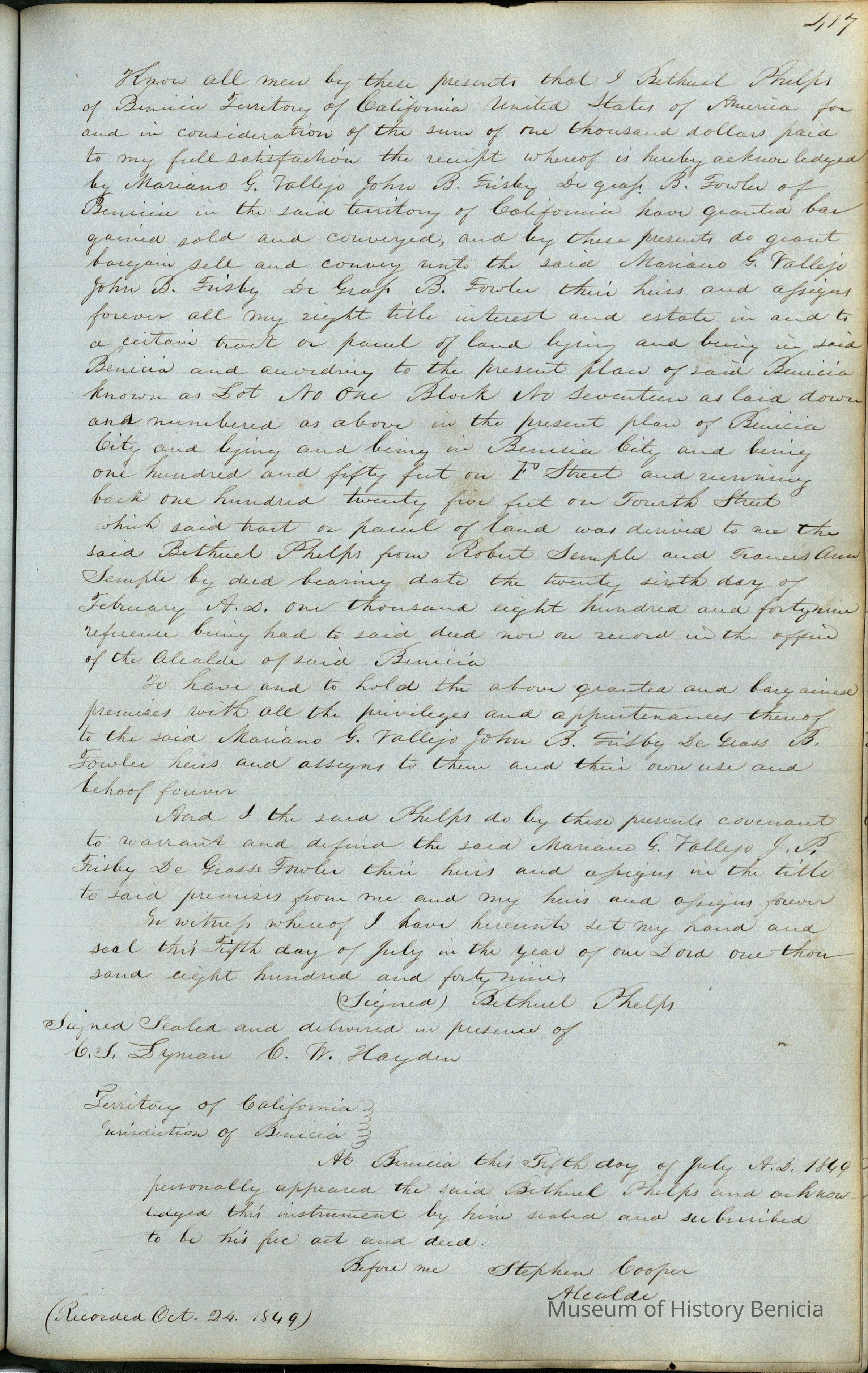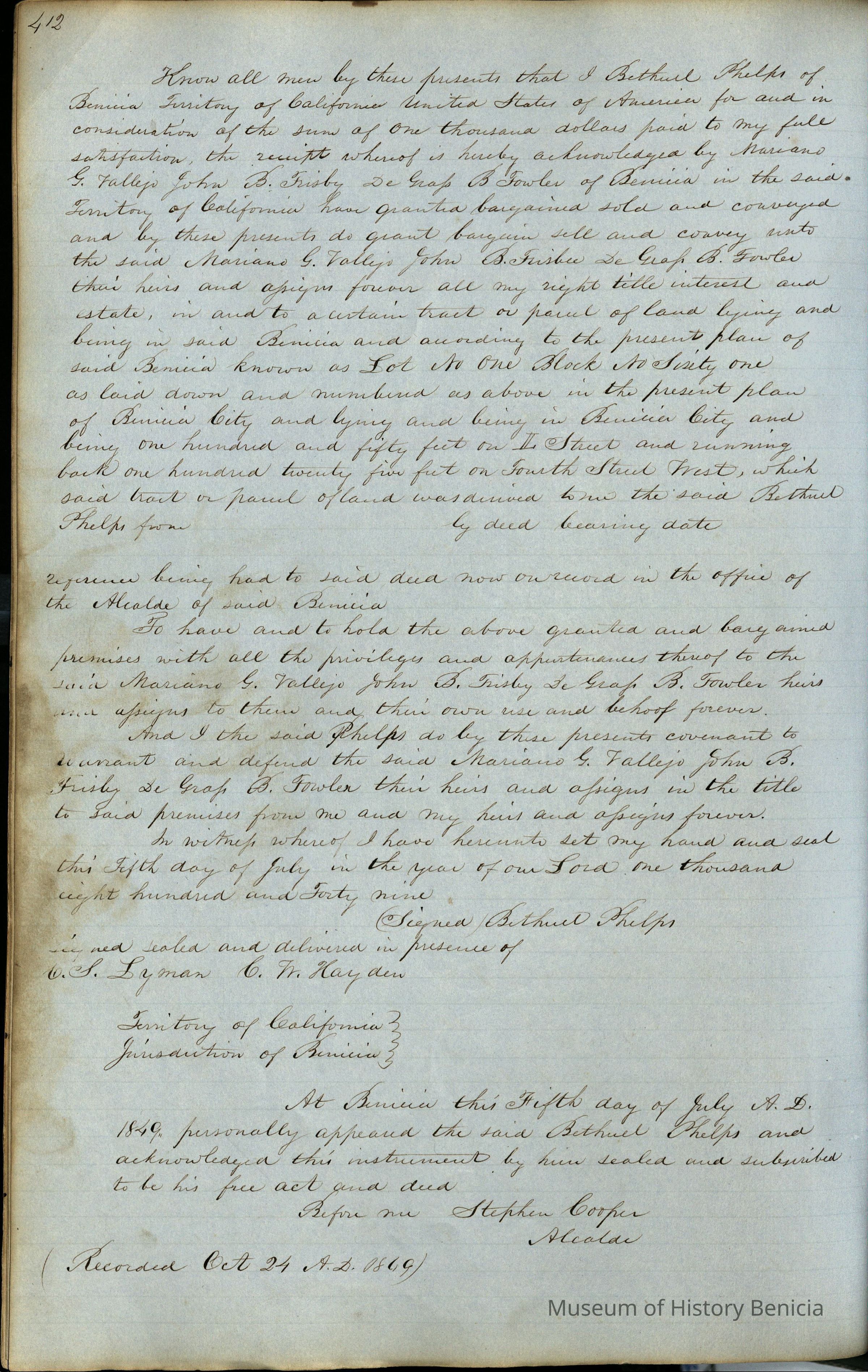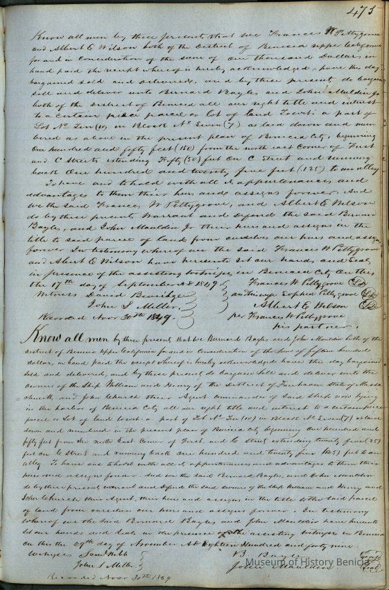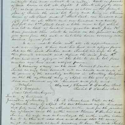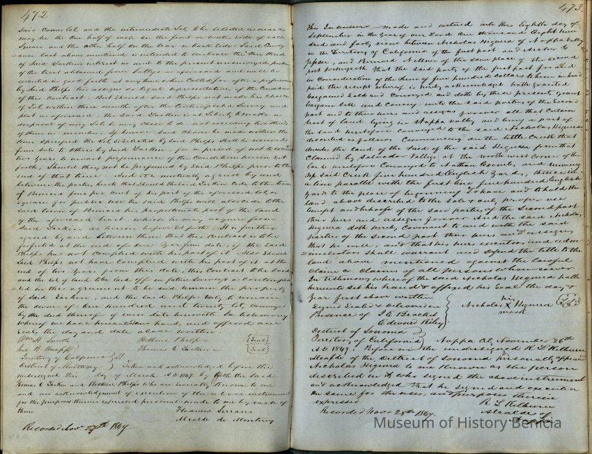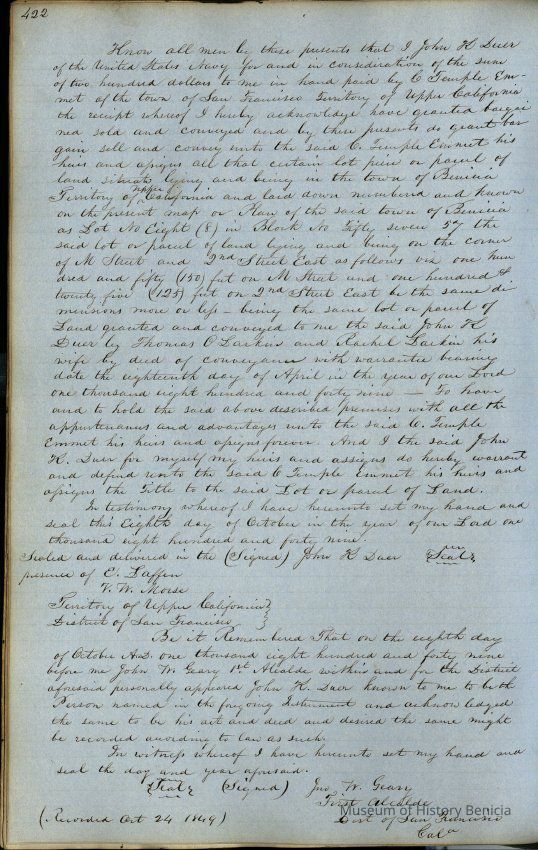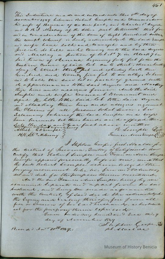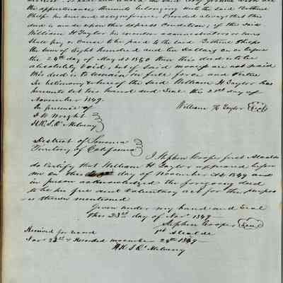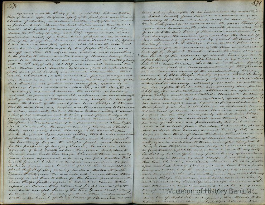 This journal/ledger contains the beginnings of Benicia including: lists and descriptions of first 12 houses in Benicia, a translation of the deed to General Vallejo by Manual Micheltorena, Governor of Calif. (1844); deed to Semple and Larkin by Vallejo (1847); deeds of properties sold by Semple and Larkin from 1847 - 1849