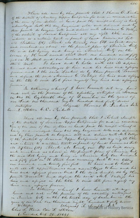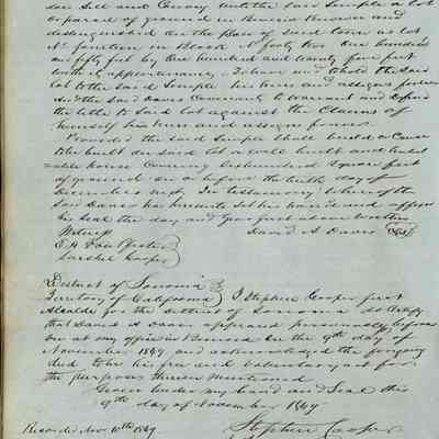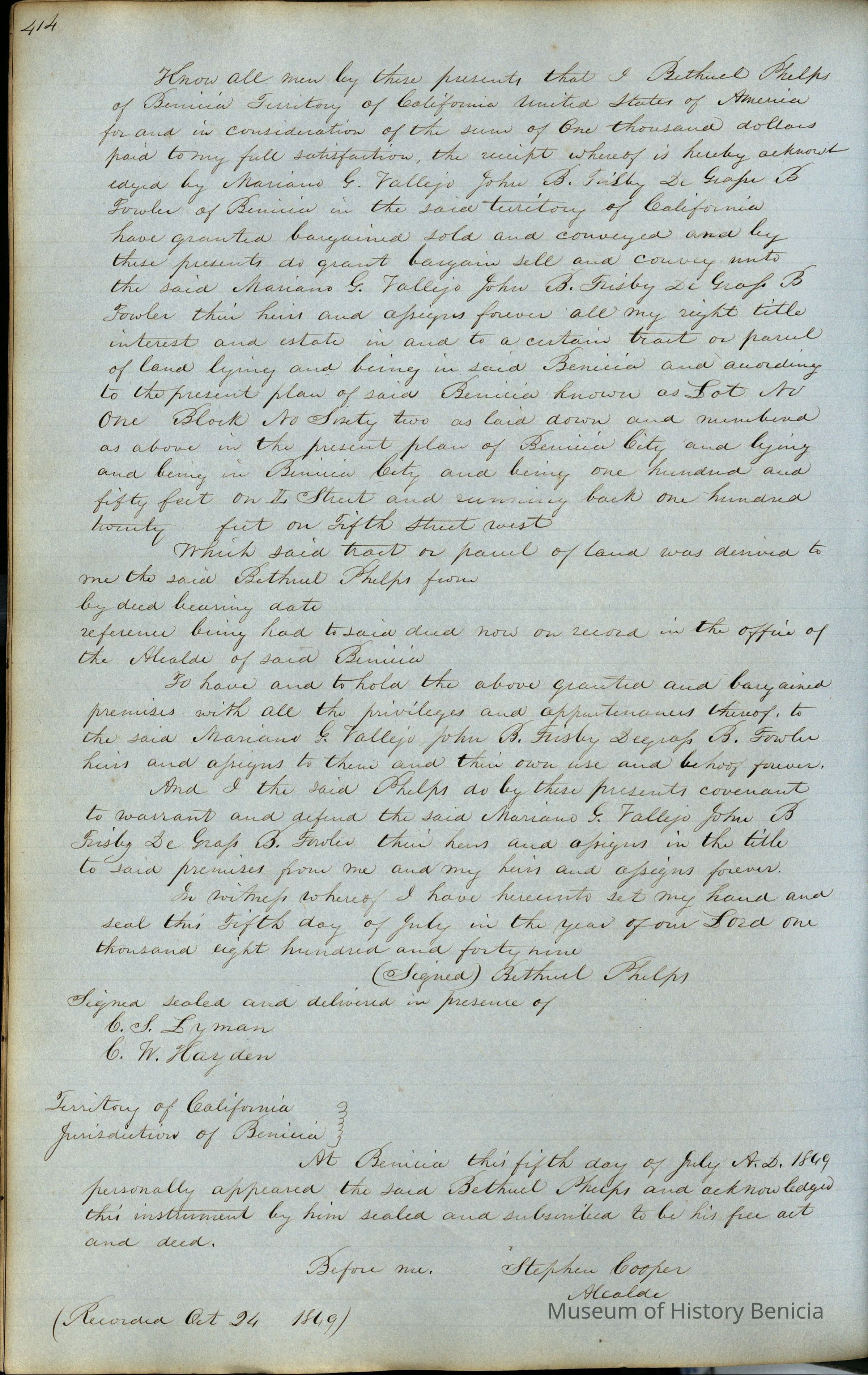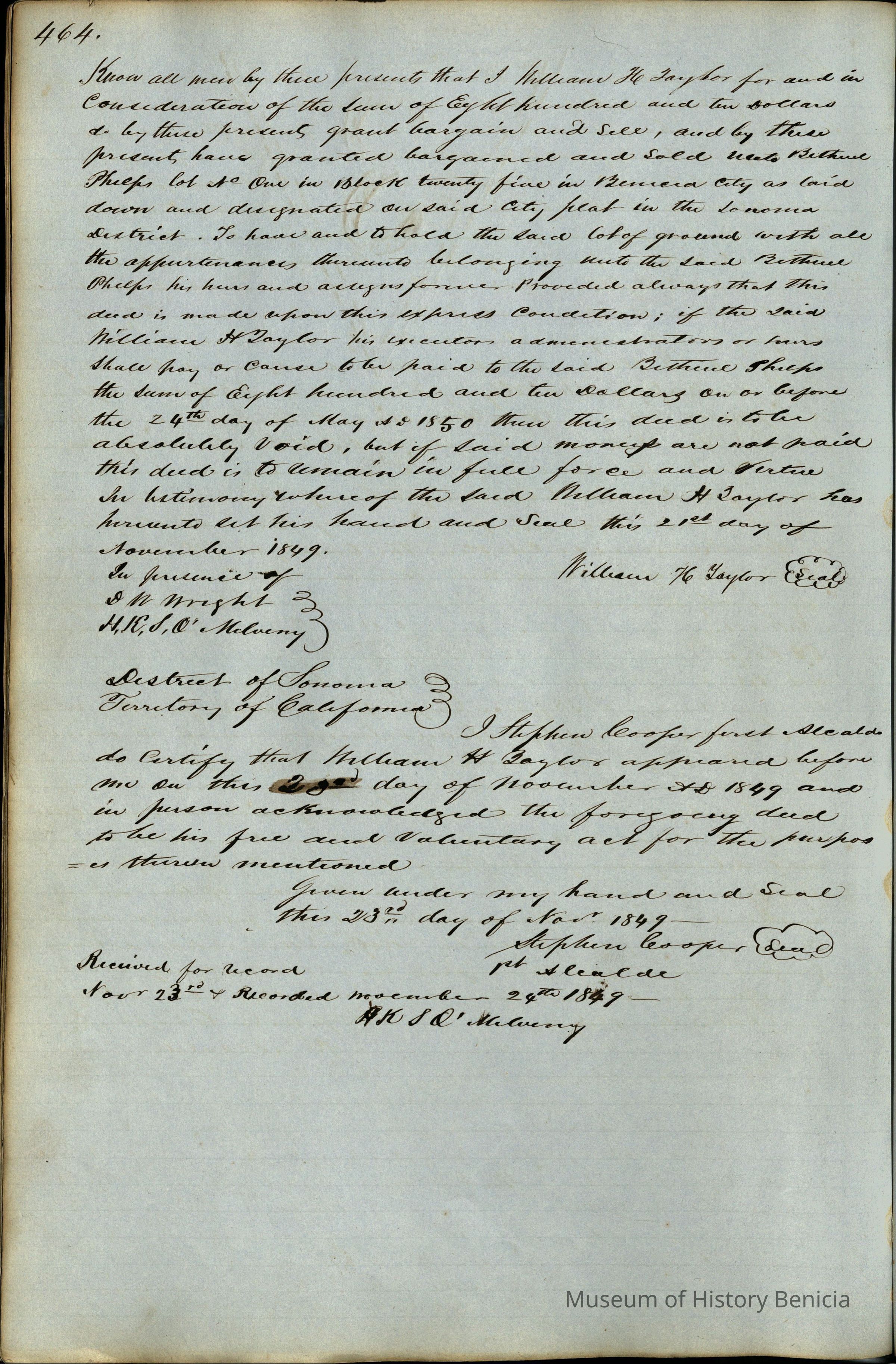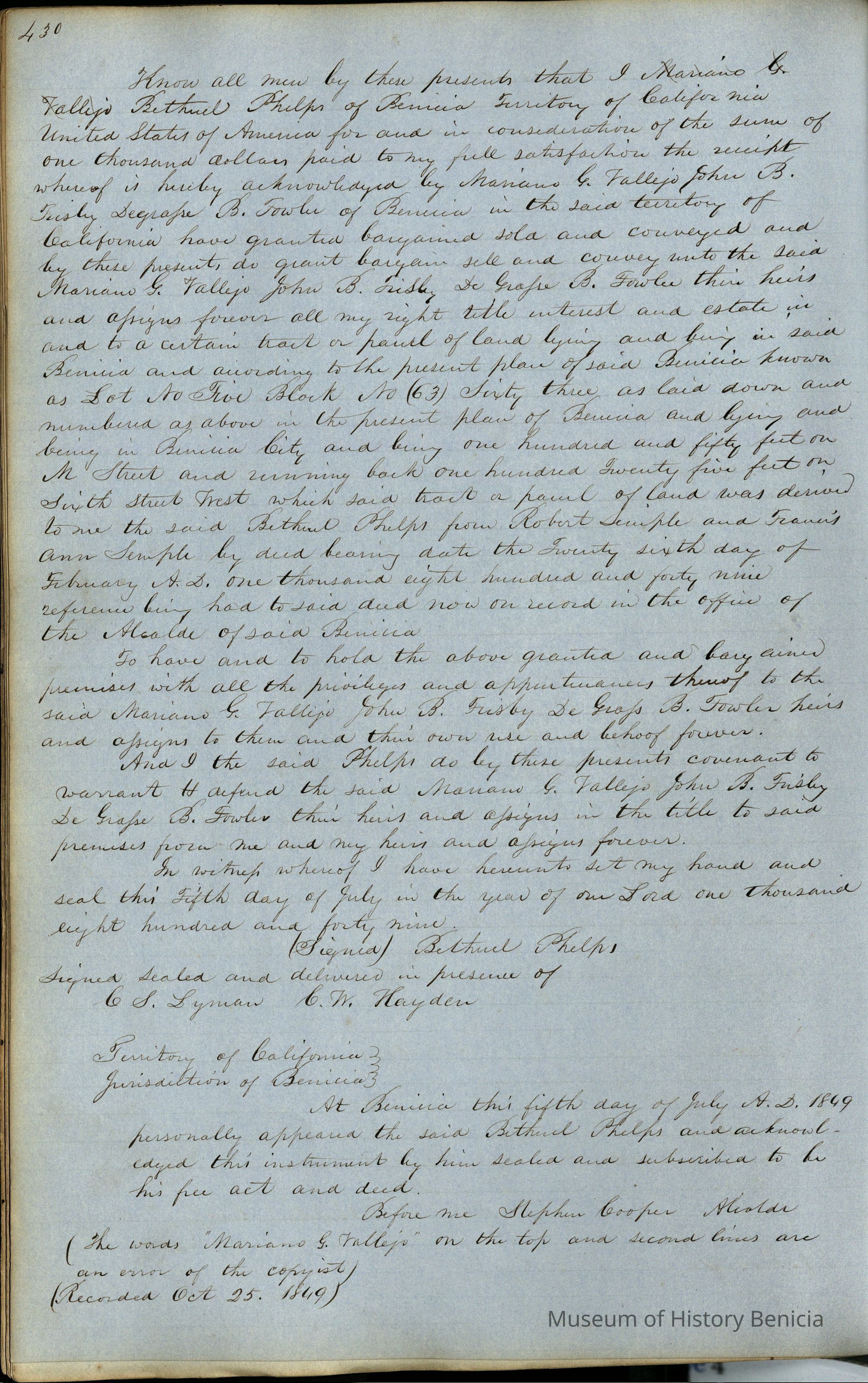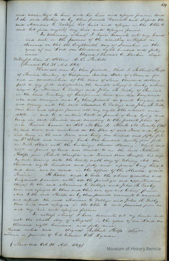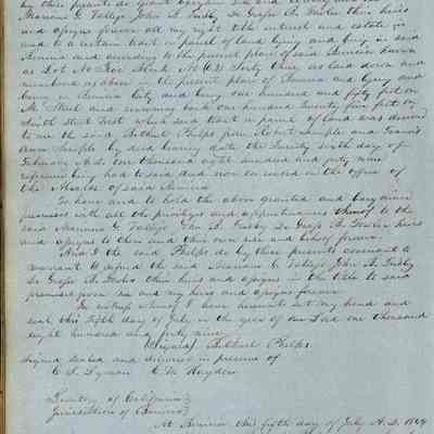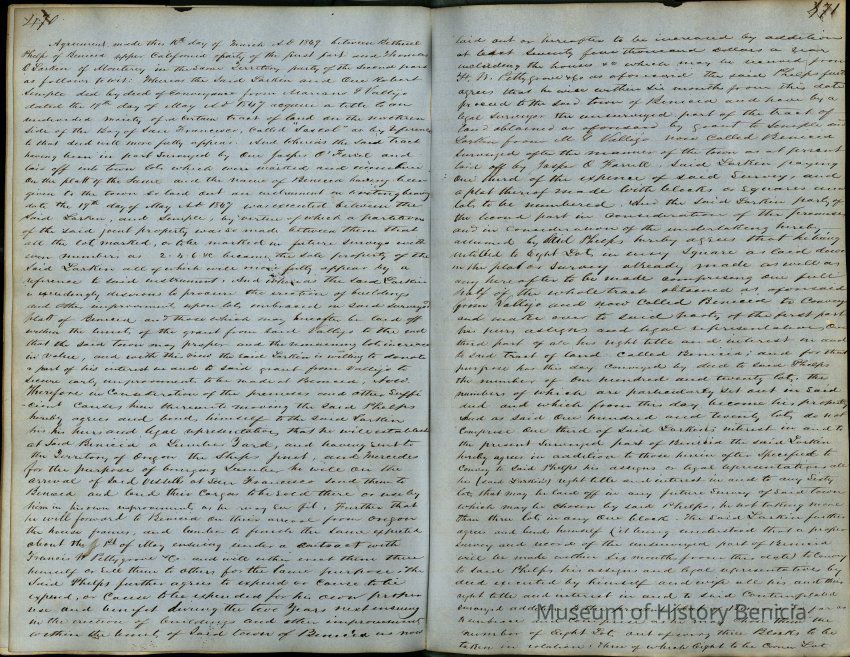 This journal/ledger contains the beginnings of Benicia including: lists and descriptions of first 12 houses in Benicia, a translation of the deed to General Vallejo by Manual Micheltorena, Governor of Calif. (1844); deed to Semple and Larkin by Vallejo (1847); deeds of properties sold by Semple and Larkin from 1847 - 1849