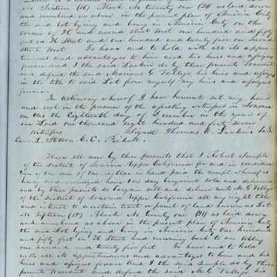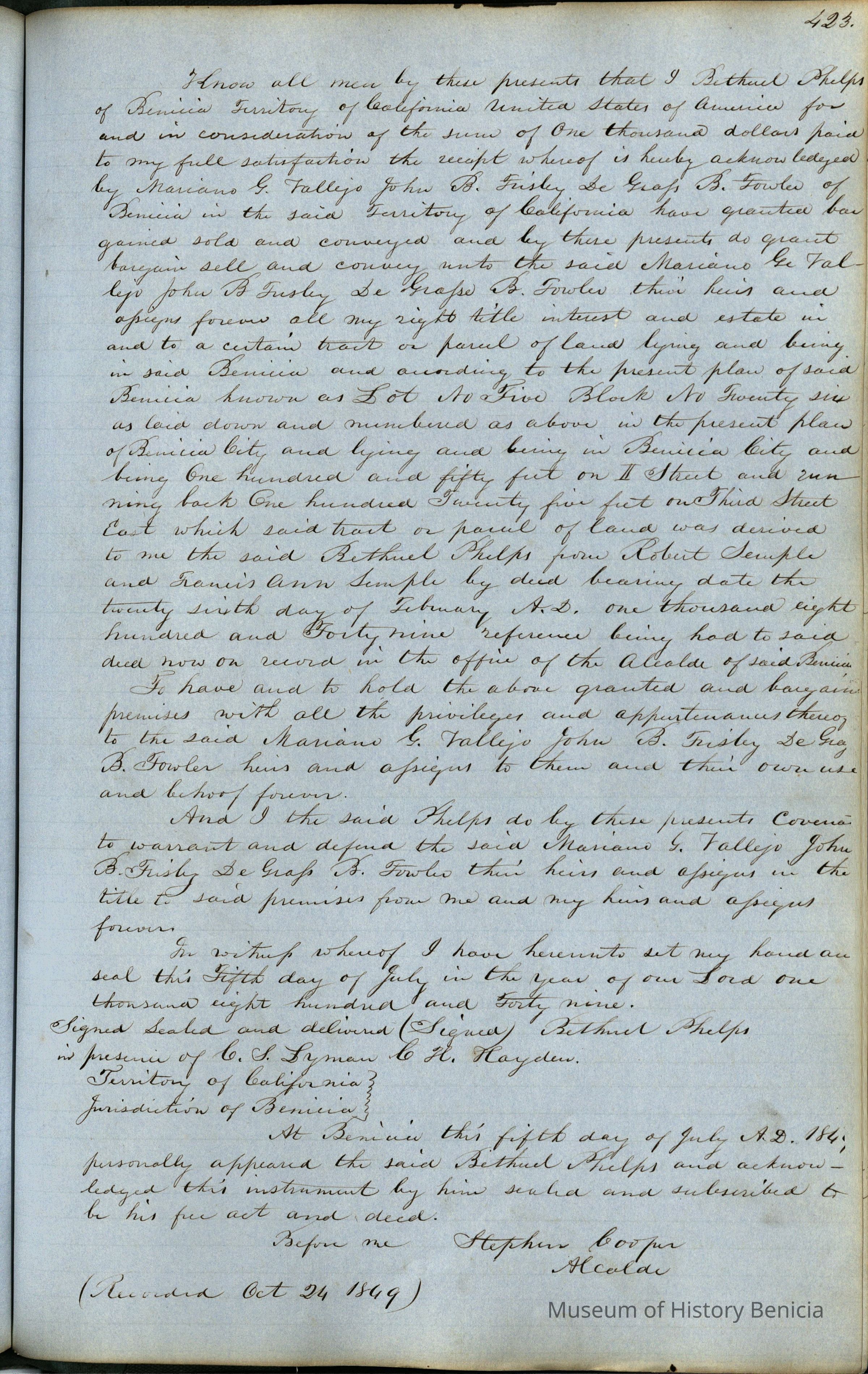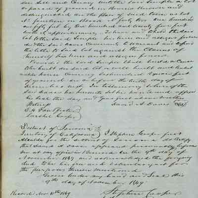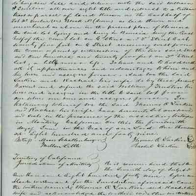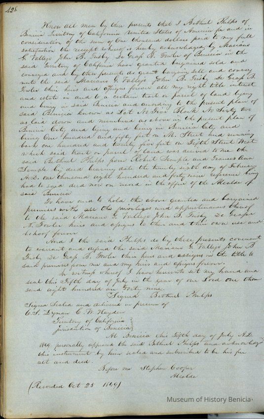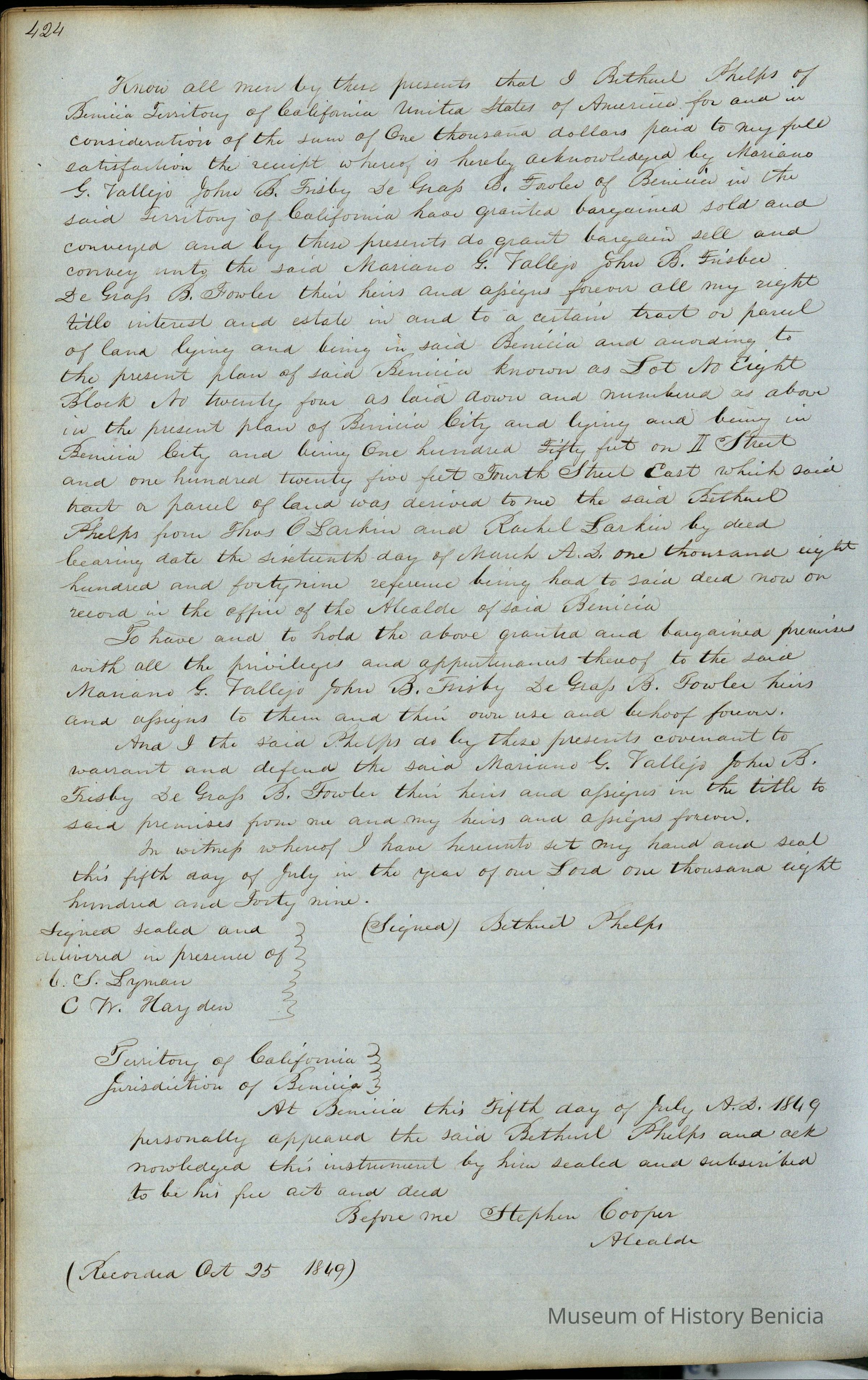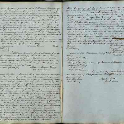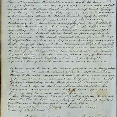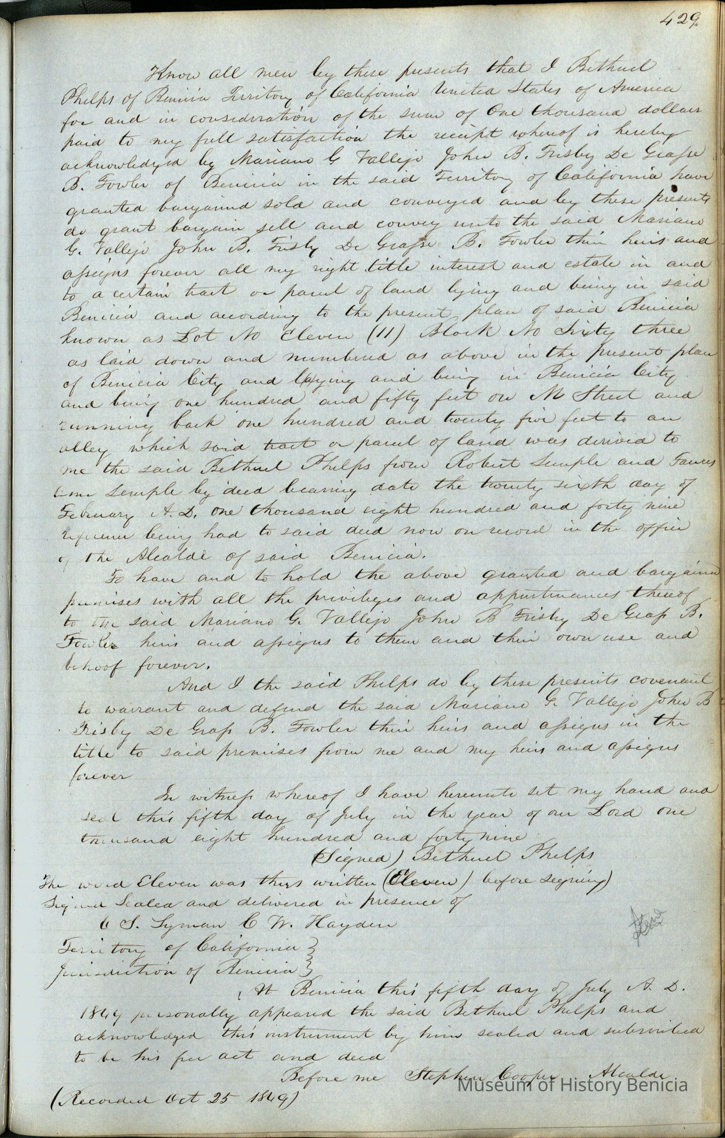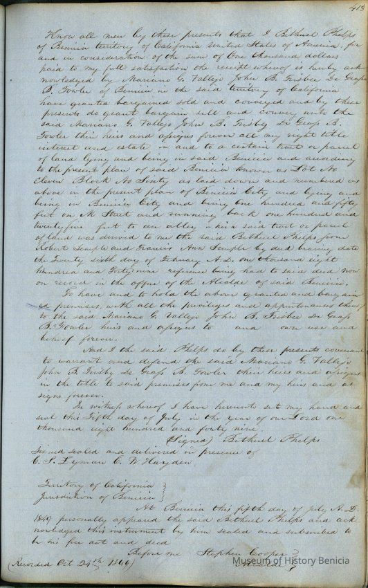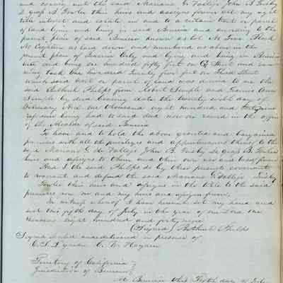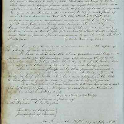 This journal/ledger contains the beginnings of Benicia including: lists and descriptions of first 12 houses in Benicia, a translation of the deed to General Vallejo by Manual Micheltorena, Governor of Calif. (1844); deed to Semple and Larkin by Vallejo (1847); deeds of properties sold by Semple and Larkin from 1847 - 1849