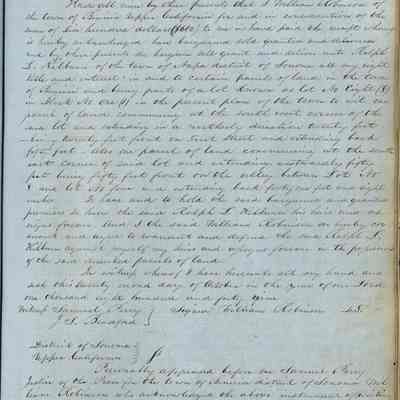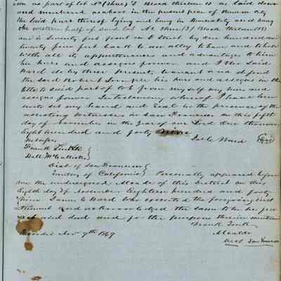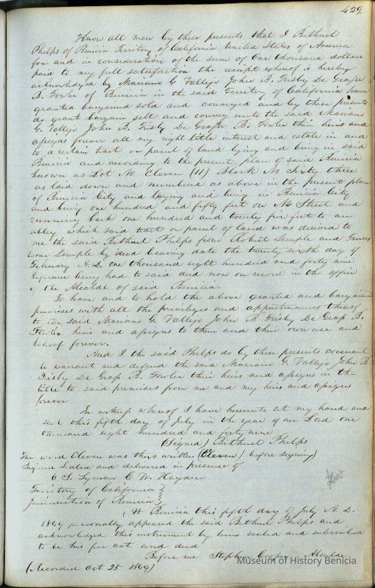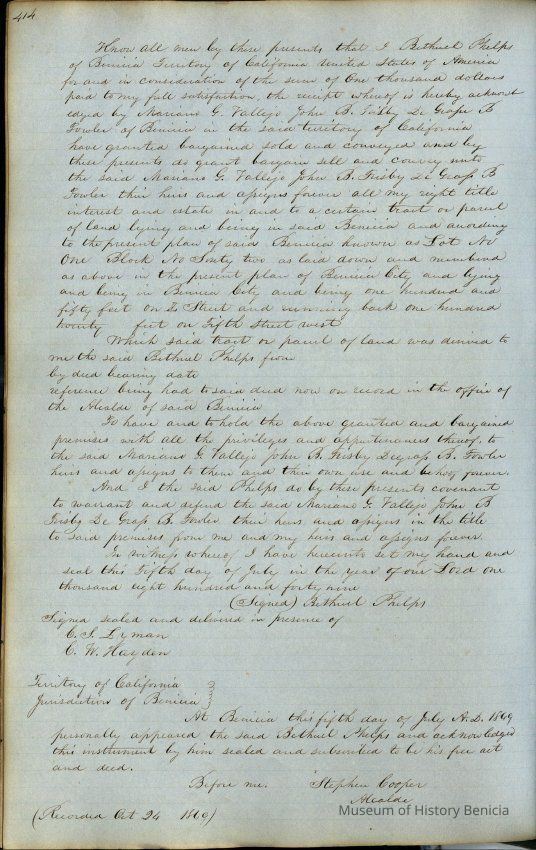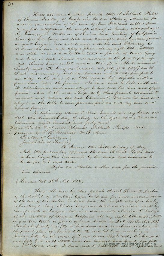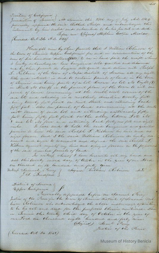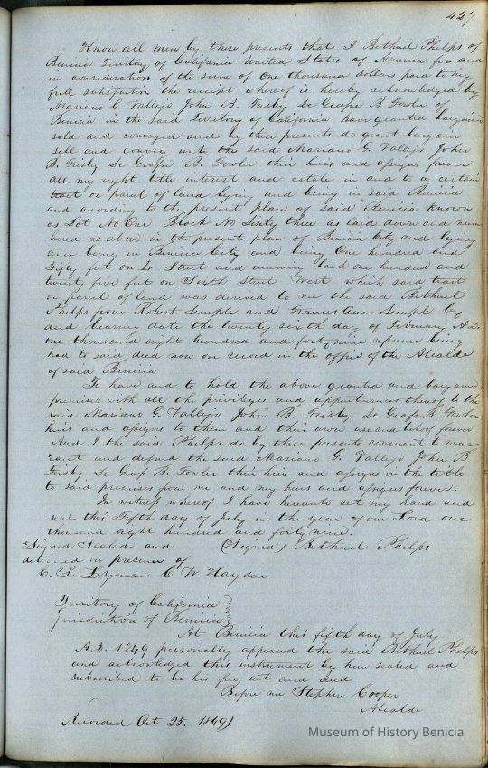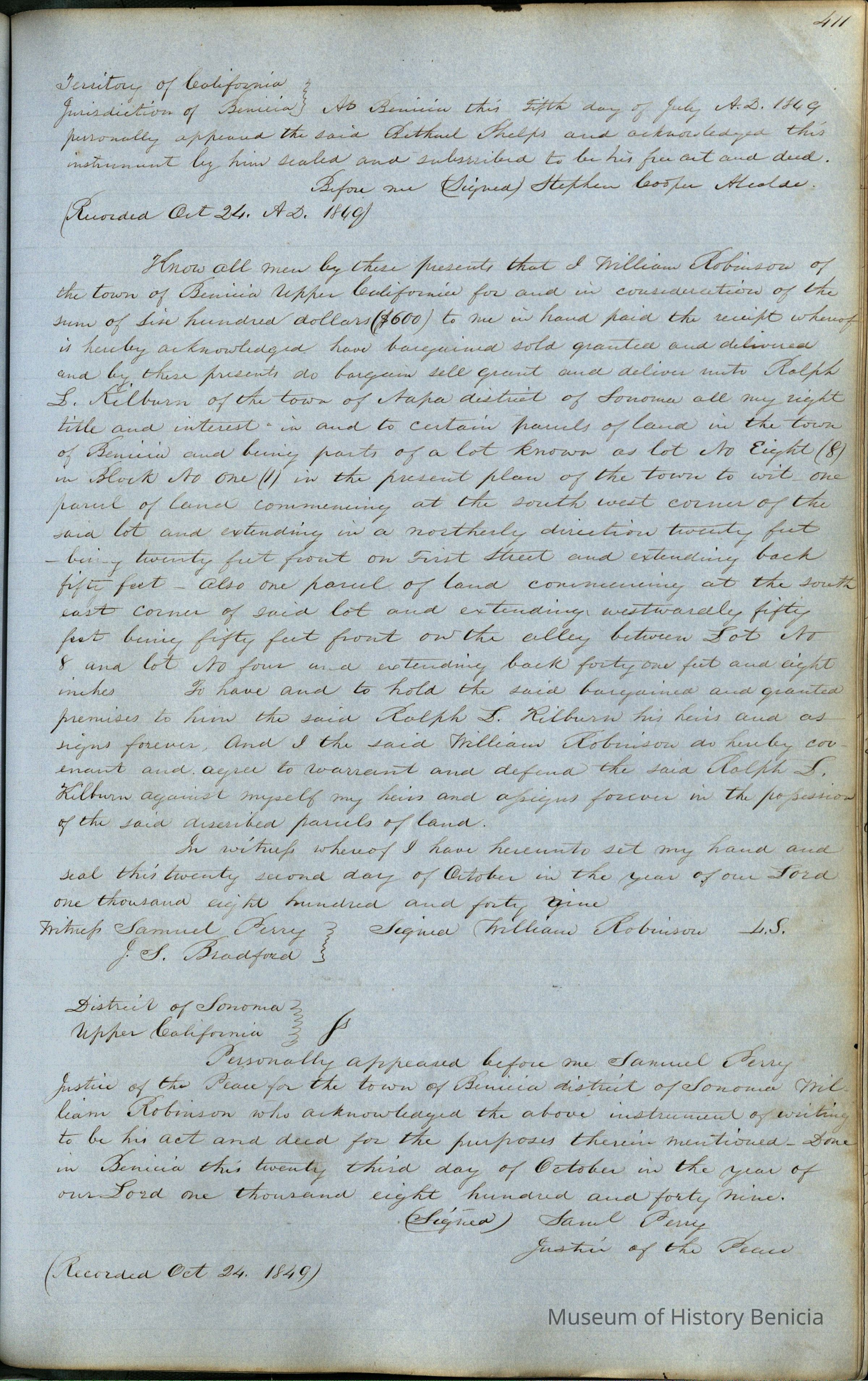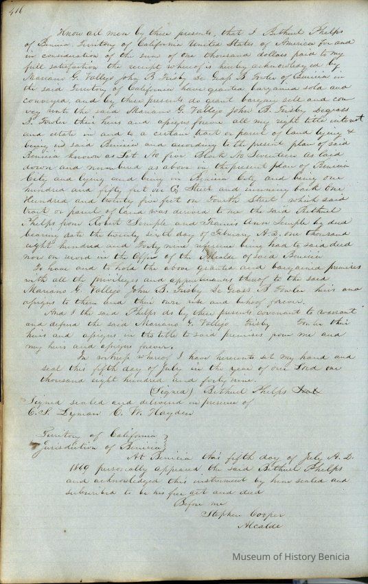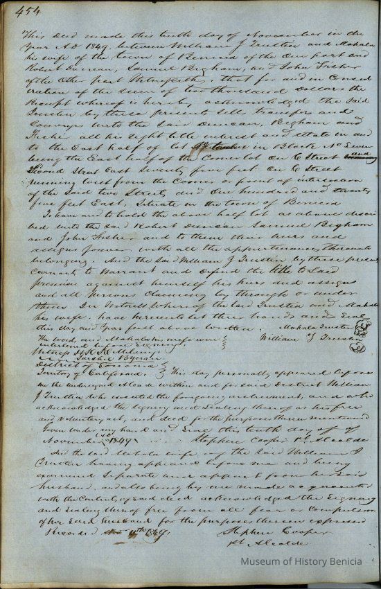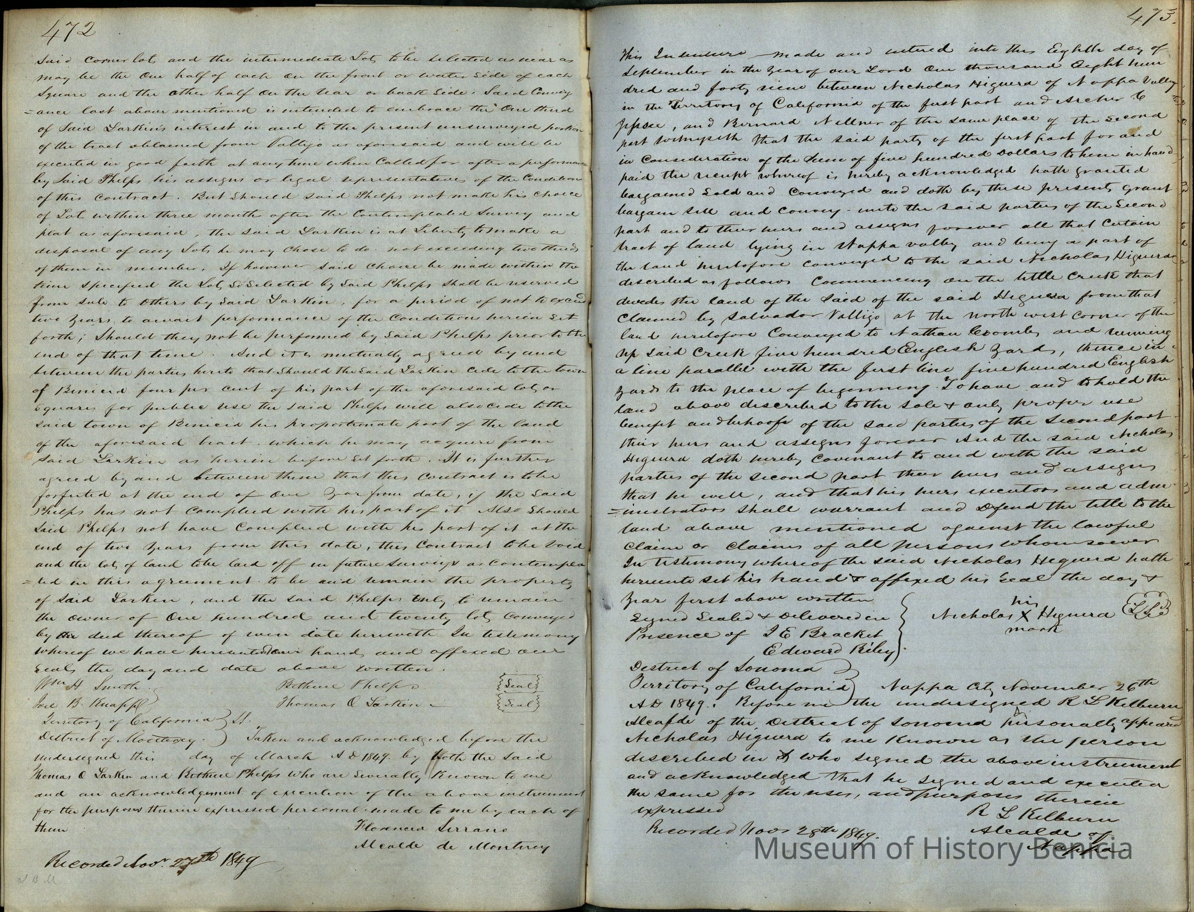 This journal/ledger contains the beginnings of Benicia including: lists and descriptions of first 12 houses in Benicia, a translation of the deed to General Vallejo by Manual Micheltorena, Governor of Calif. (1844); deed to Semple and Larkin by Vallejo (1847); deeds of properties sold by Semple and Larkin from 1847 - 1849