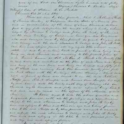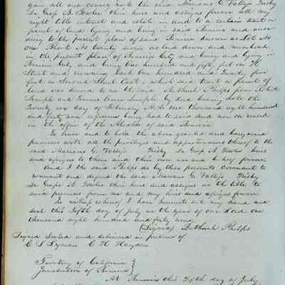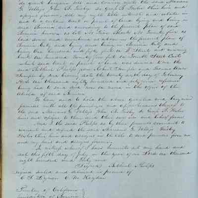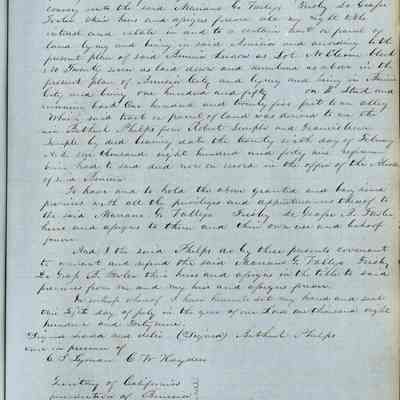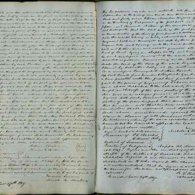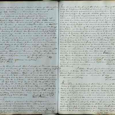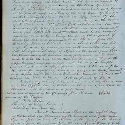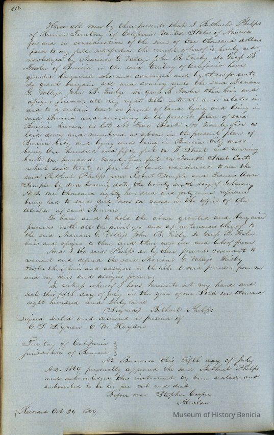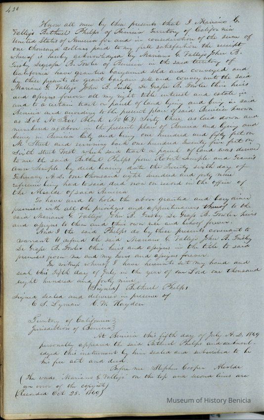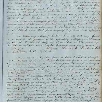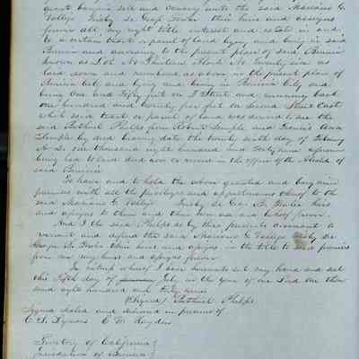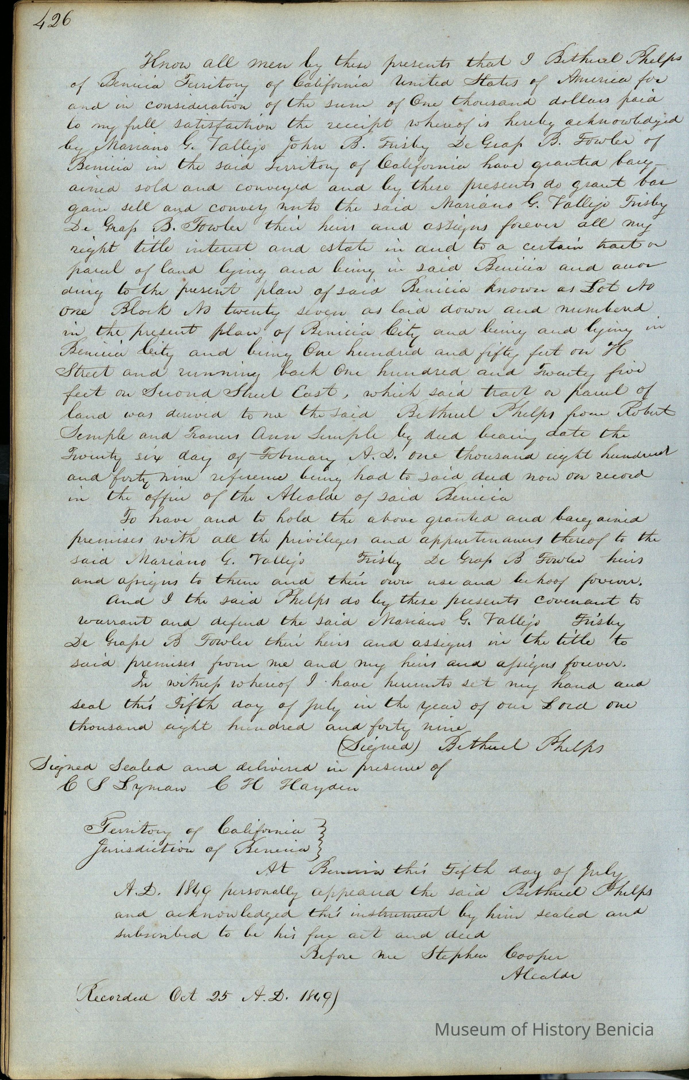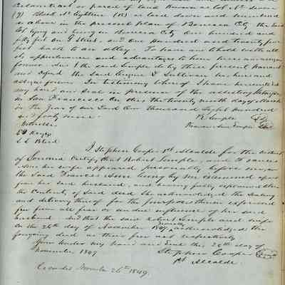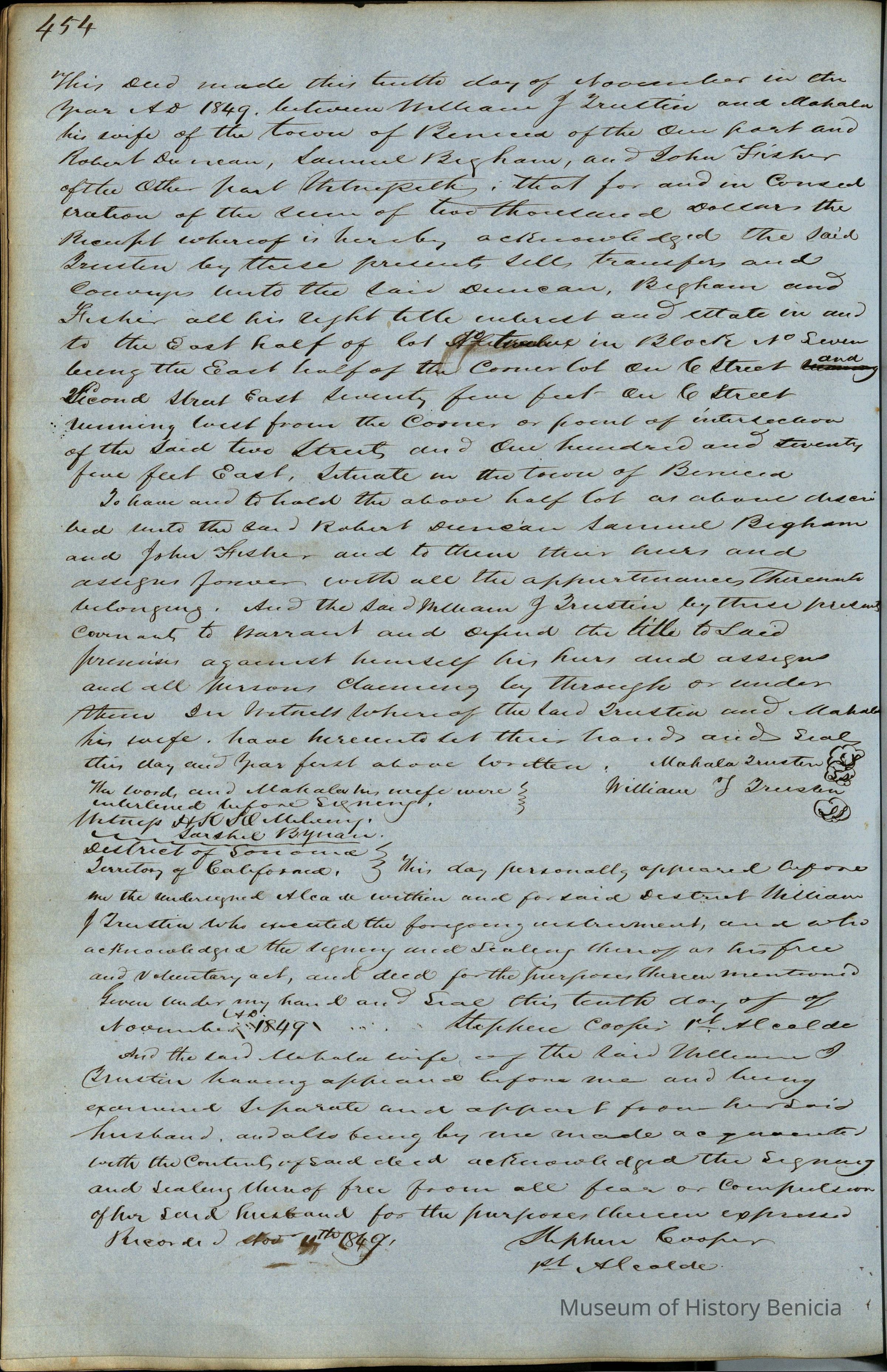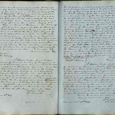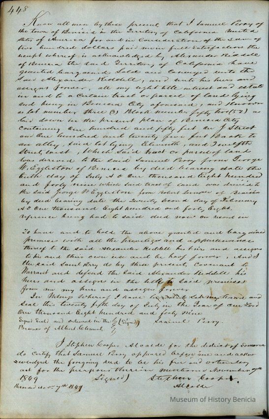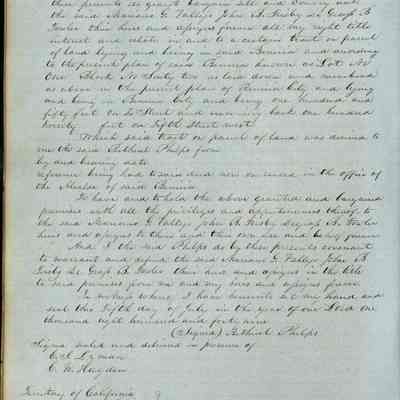 This journal/ledger contains the beginnings of Benicia including: lists and descriptions of first 12 houses in Benicia, a translation of the deed to General Vallejo by Manual Micheltorena, Governor of Calif. (1844); deed to Semple and Larkin by Vallejo (1847); deeds of properties sold by Semple and Larkin from 1847 - 1849
