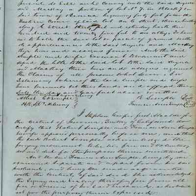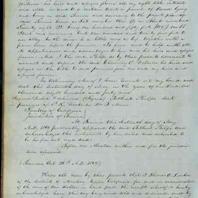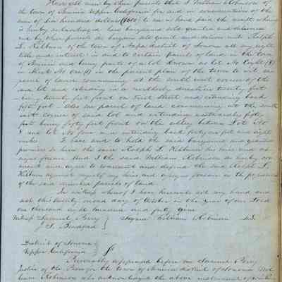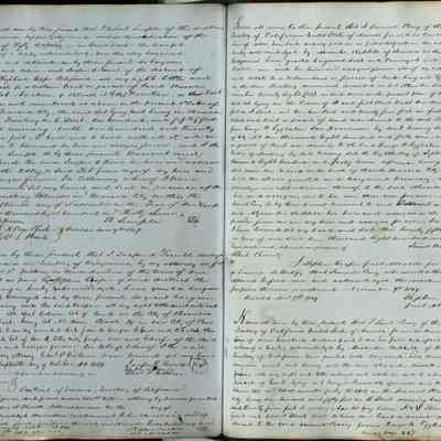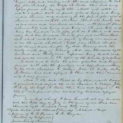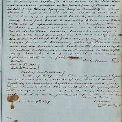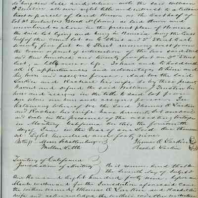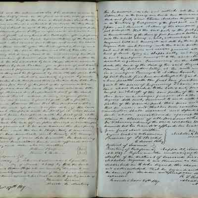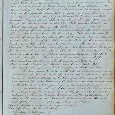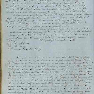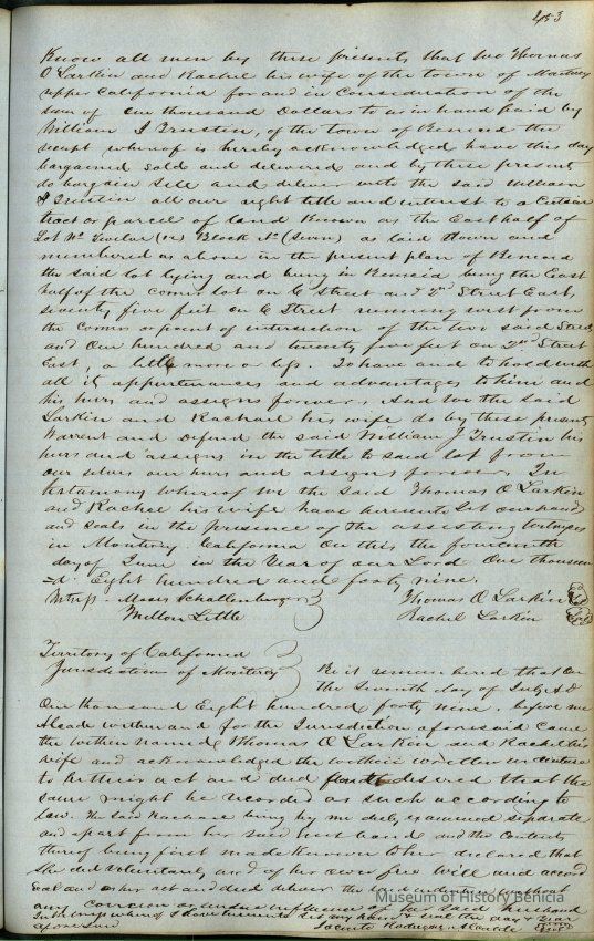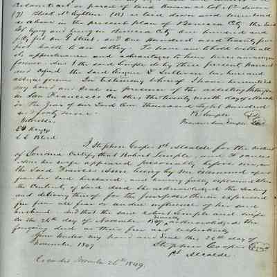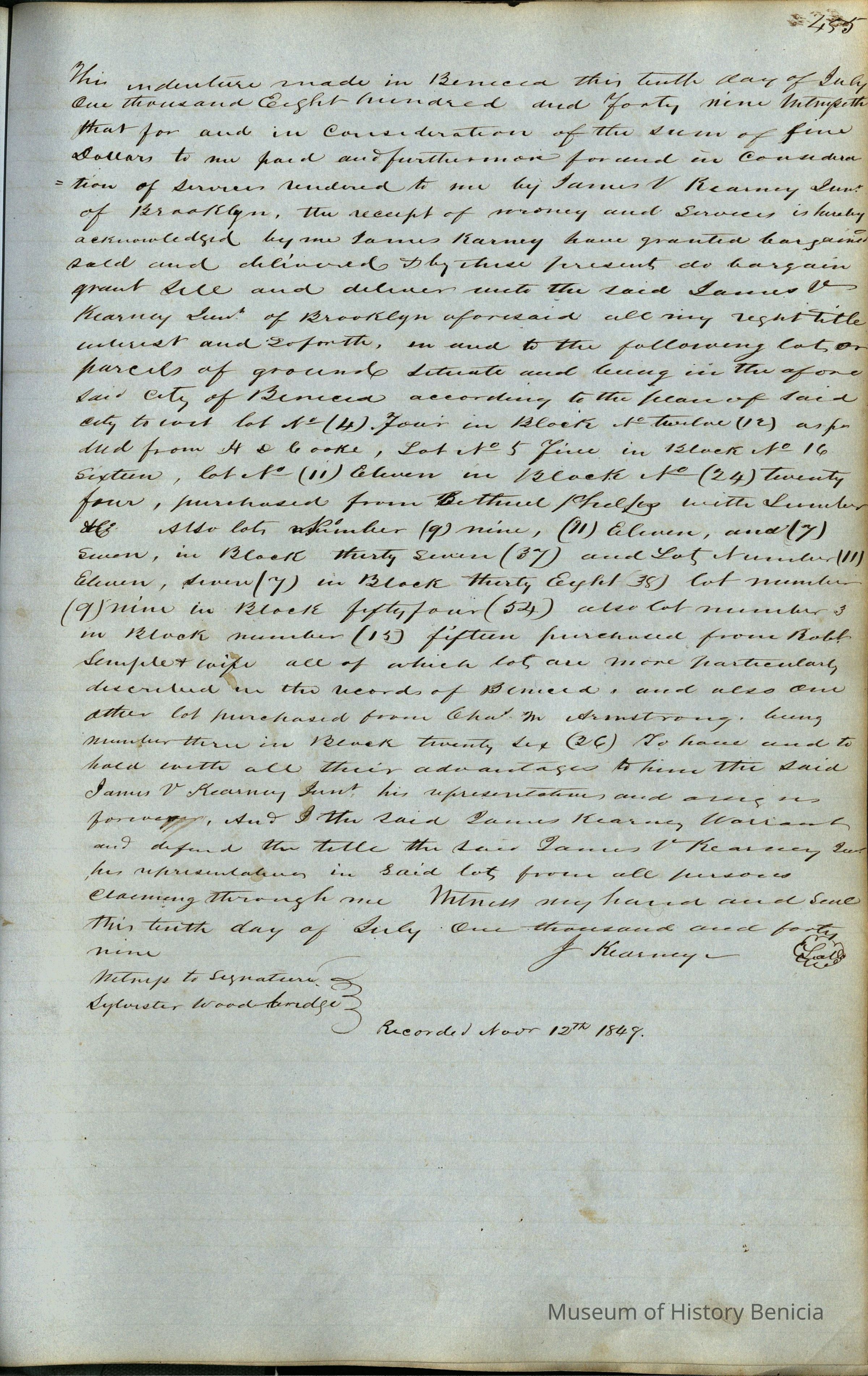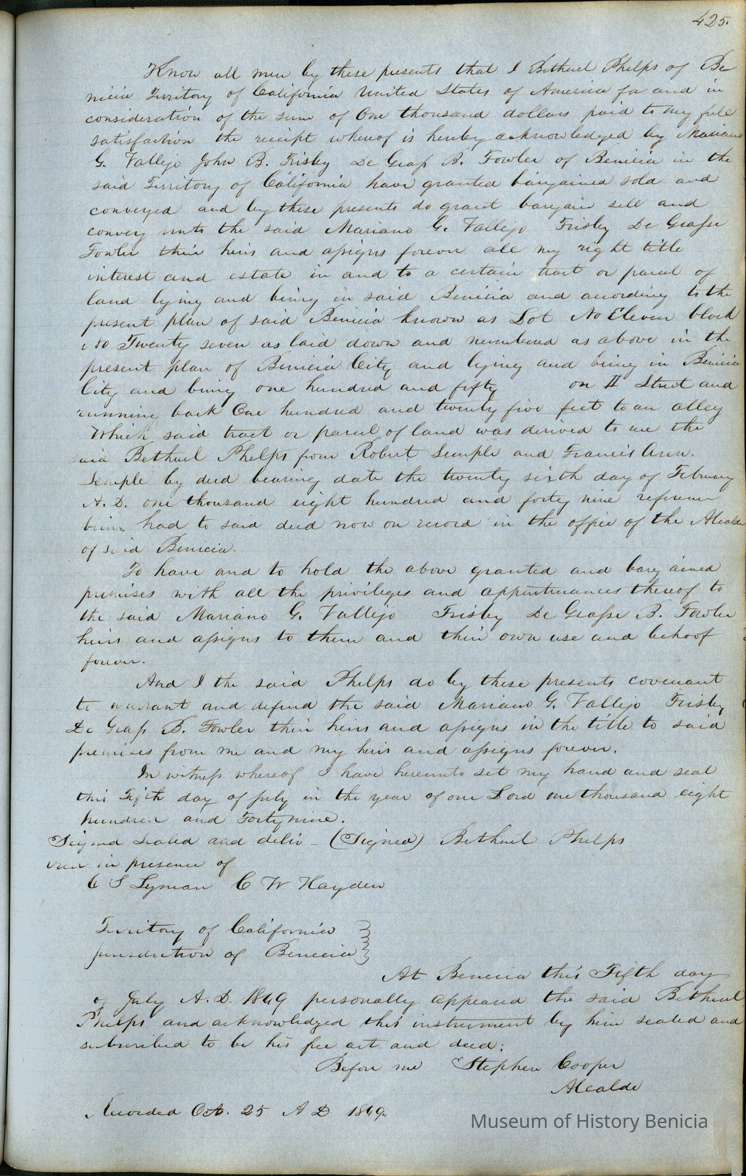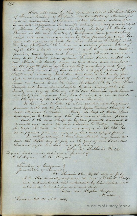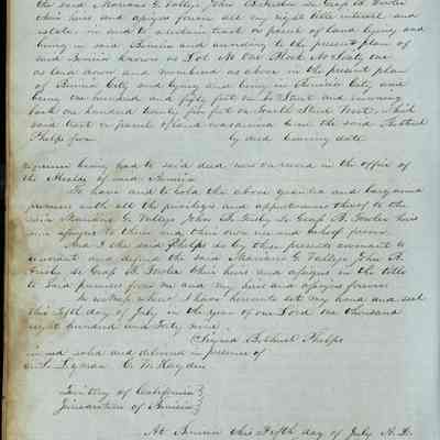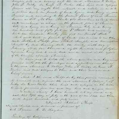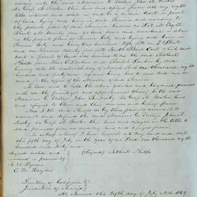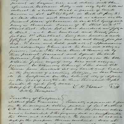 This journal/ledger contains the beginnings of Benicia including: lists and descriptions of first 12 houses in Benicia, a translation of the deed to General Vallejo by Manual Micheltorena, Governor of Calif. (1844); deed to Semple and Larkin by Vallejo (1847); deeds of properties sold by Semple and Larkin from 1847 - 1849