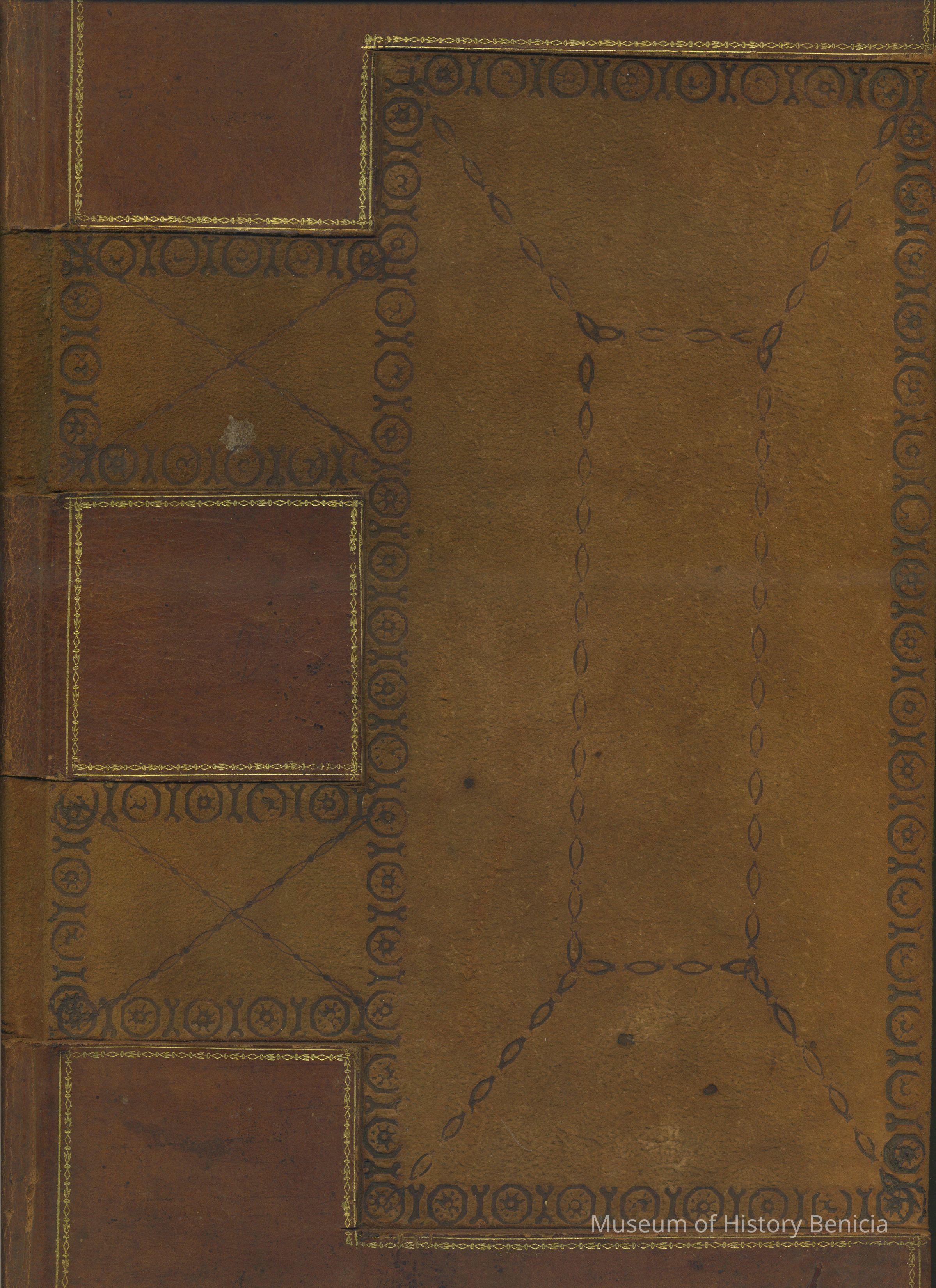 Butcher's Ledger of accounts; butcher unknown Shades of brown on cover with dark tooling and gold embellishments; 9" x 14"