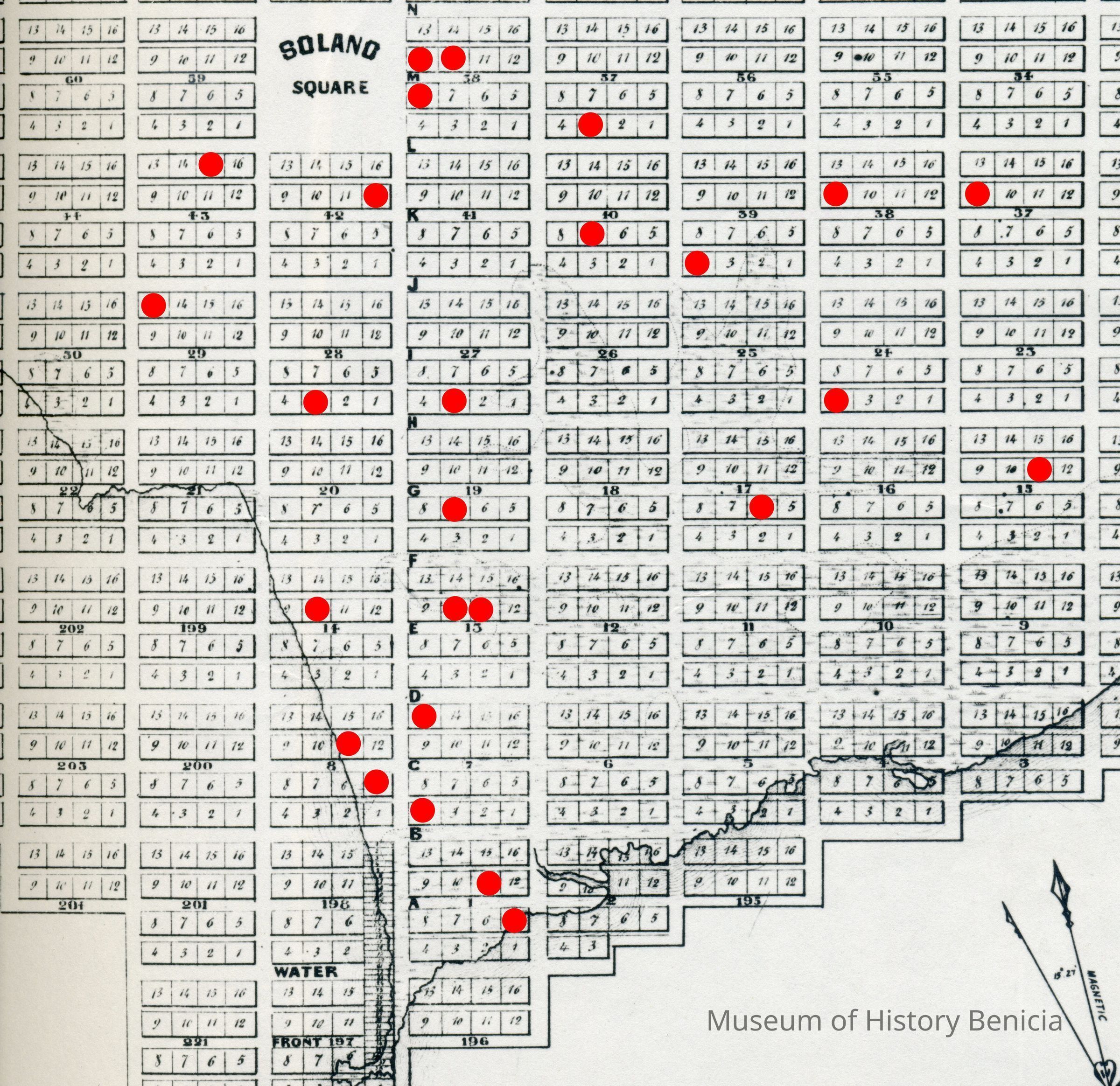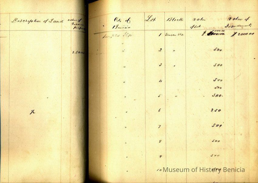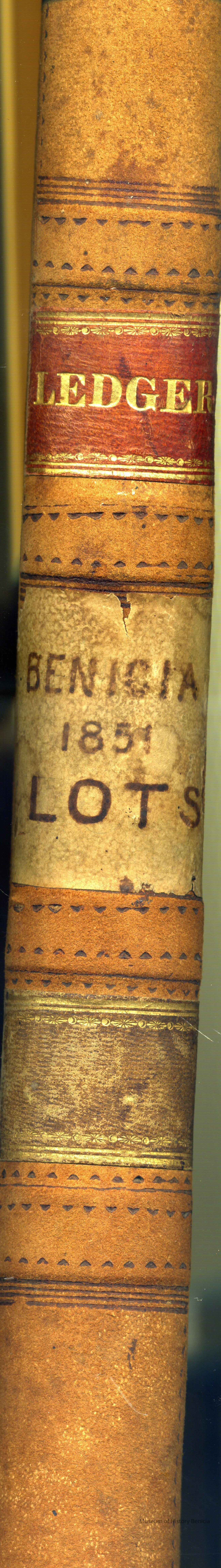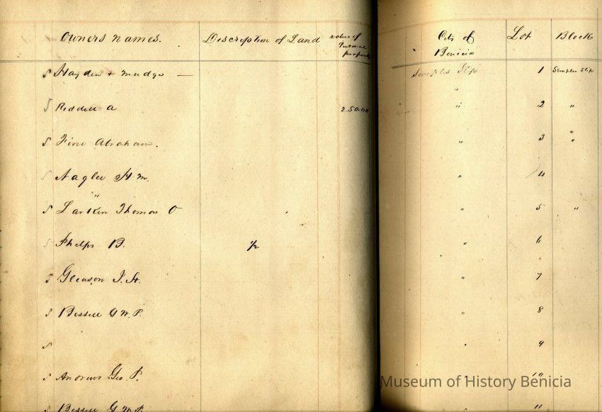 The ledger has an alphabetical section which has not been used. The rest of the ledger shows each lot in Benicia and the following columns: