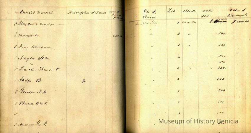 This is a ledger from 1851 of the lots in Benicia. It was compiled by Stephen Cooper who was the Solano County Assessor at the time. It was filed by Saisbul Bynum who was the Solano County Clerk. Pasted in the front is a 2 page letter from Stephen Cooper of "additional Tax List". It contains information about Baysi, I. Long & Co., and Richmond I.