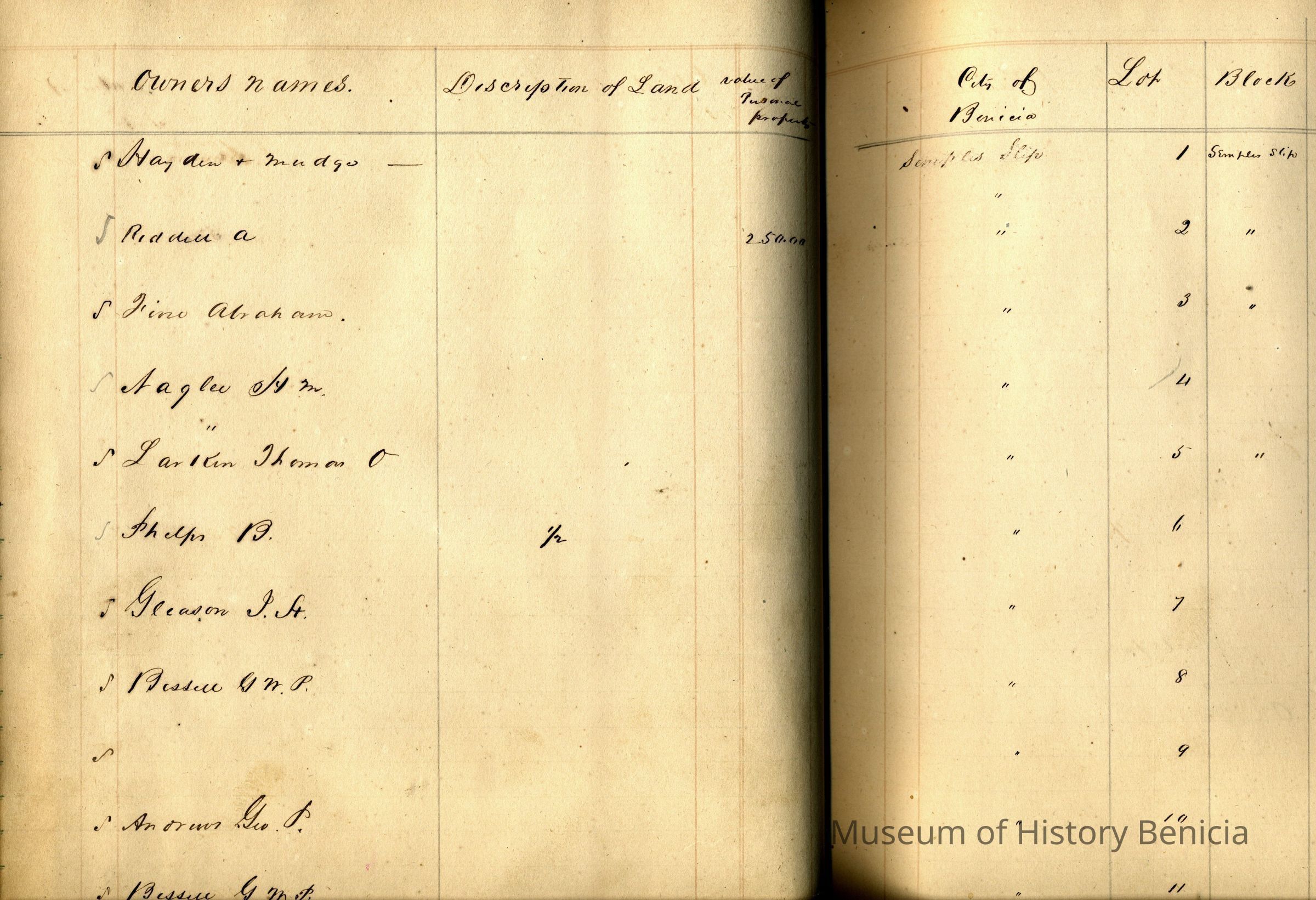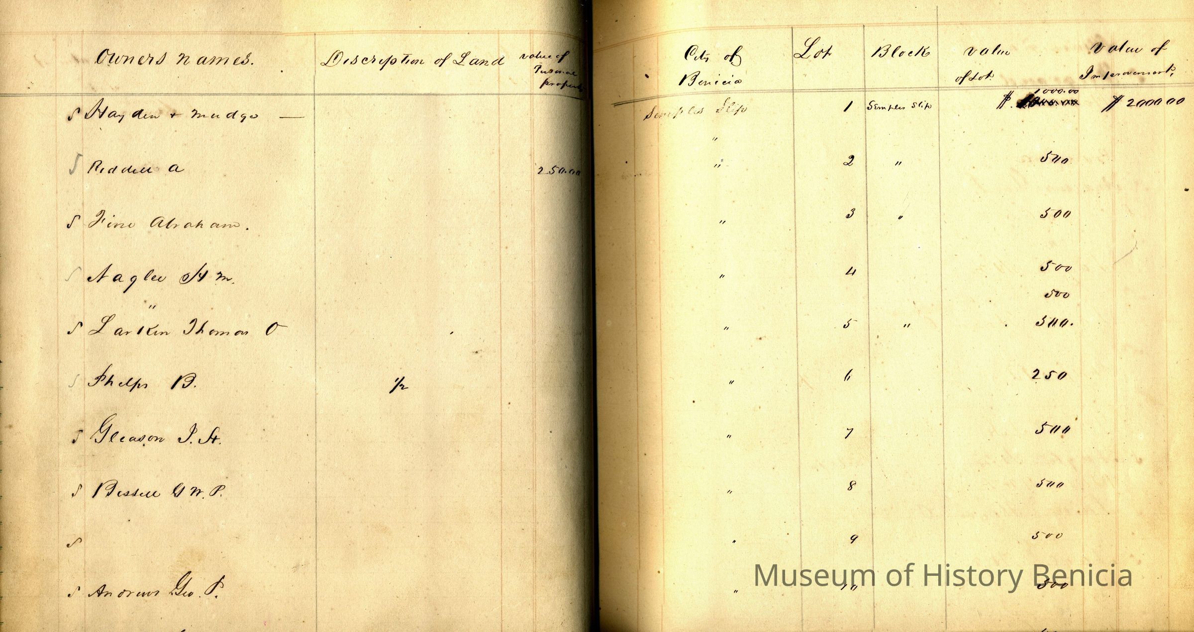 The first lot is #1 on block "Semple's Slip". It was owned by Hayden & Mudgo and valued at $1,000 with $2,000 value of improvements.