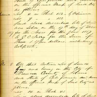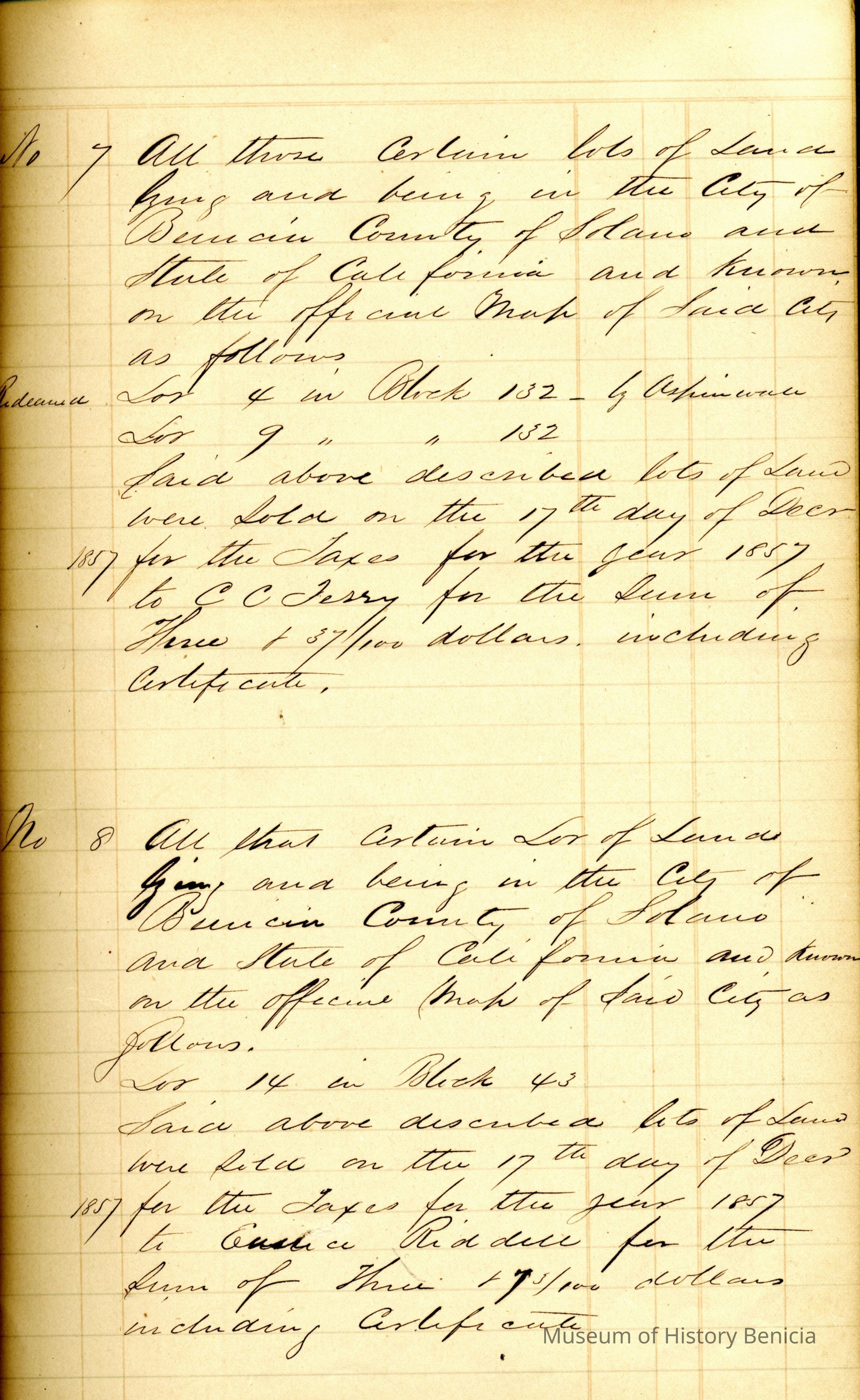 This is a ledger showing delinquent properties sold in the city of Benicia for 1857. There are only eleven entries in the whole book.
