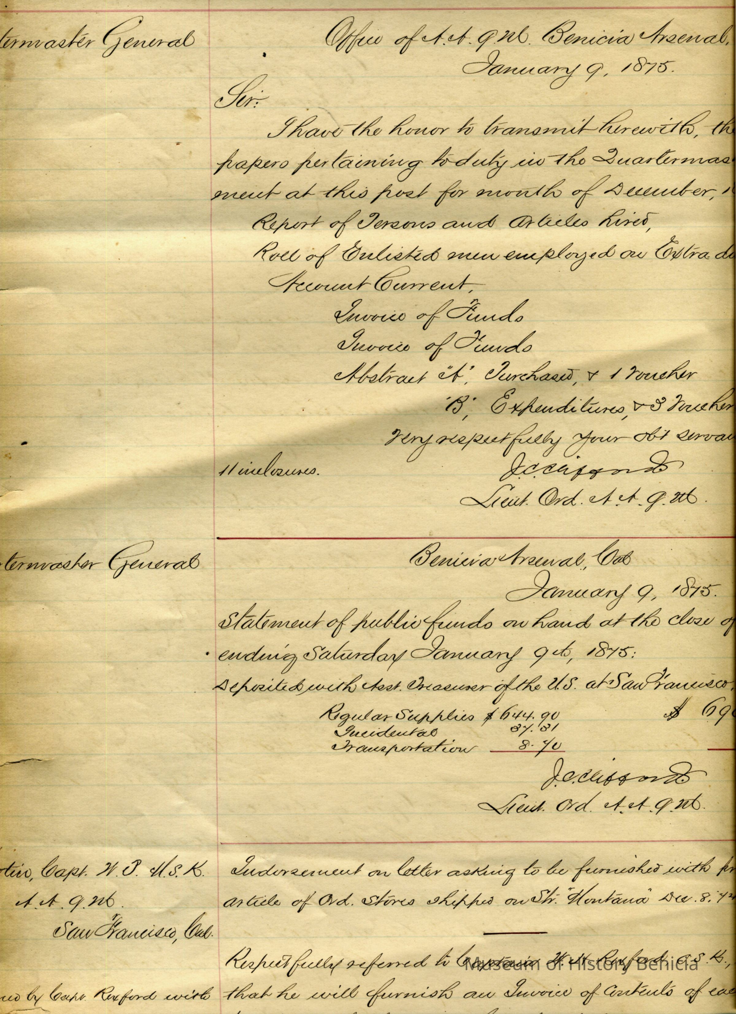The spine reads Letters Se - T." Other words "Or----ee-s Department" Notice of instructions pasted inside front cover - ink inscription bottom of this notice "Property of Mr/Mrs Rudolph Quandt, 660 East "K" Street, Benicia, California" Contents are notices in ink of letters (copies of) where from and to whom and contents. Latter day book used as scribble pad by child/children and scrapbook circa 1933 on.