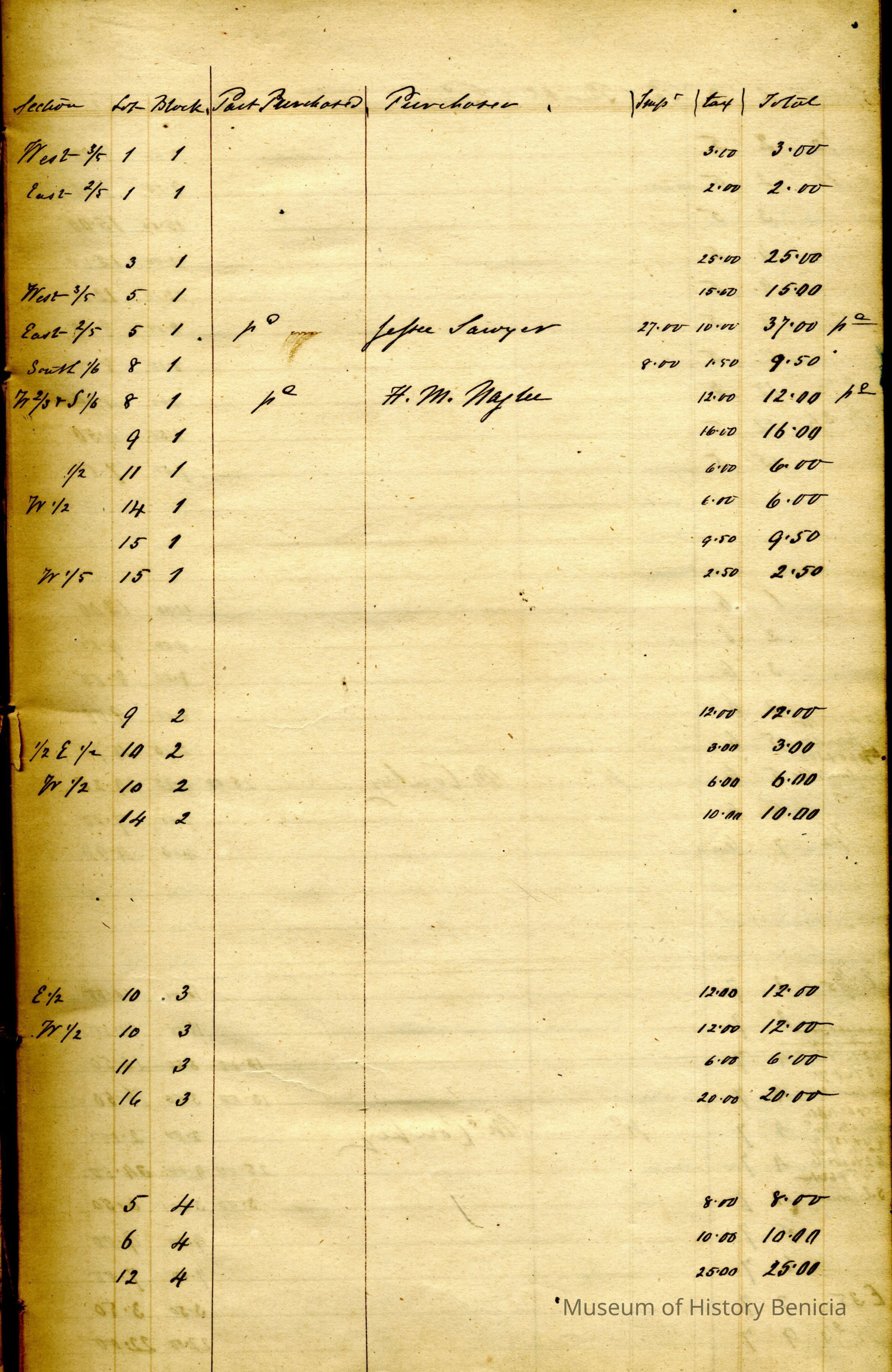 This is a ledger showing Benicia lots and taxes by owner. There is no date on the book and it looks like some pages were removed in the front of the book. It starts with block 1 lot 1 and goes to block 64 lot 13. There are very few owners shown and not all lots in each block. It just doesn't seem to be a complete ledger. Maybe names are only added after land owners pay the tax.Collection