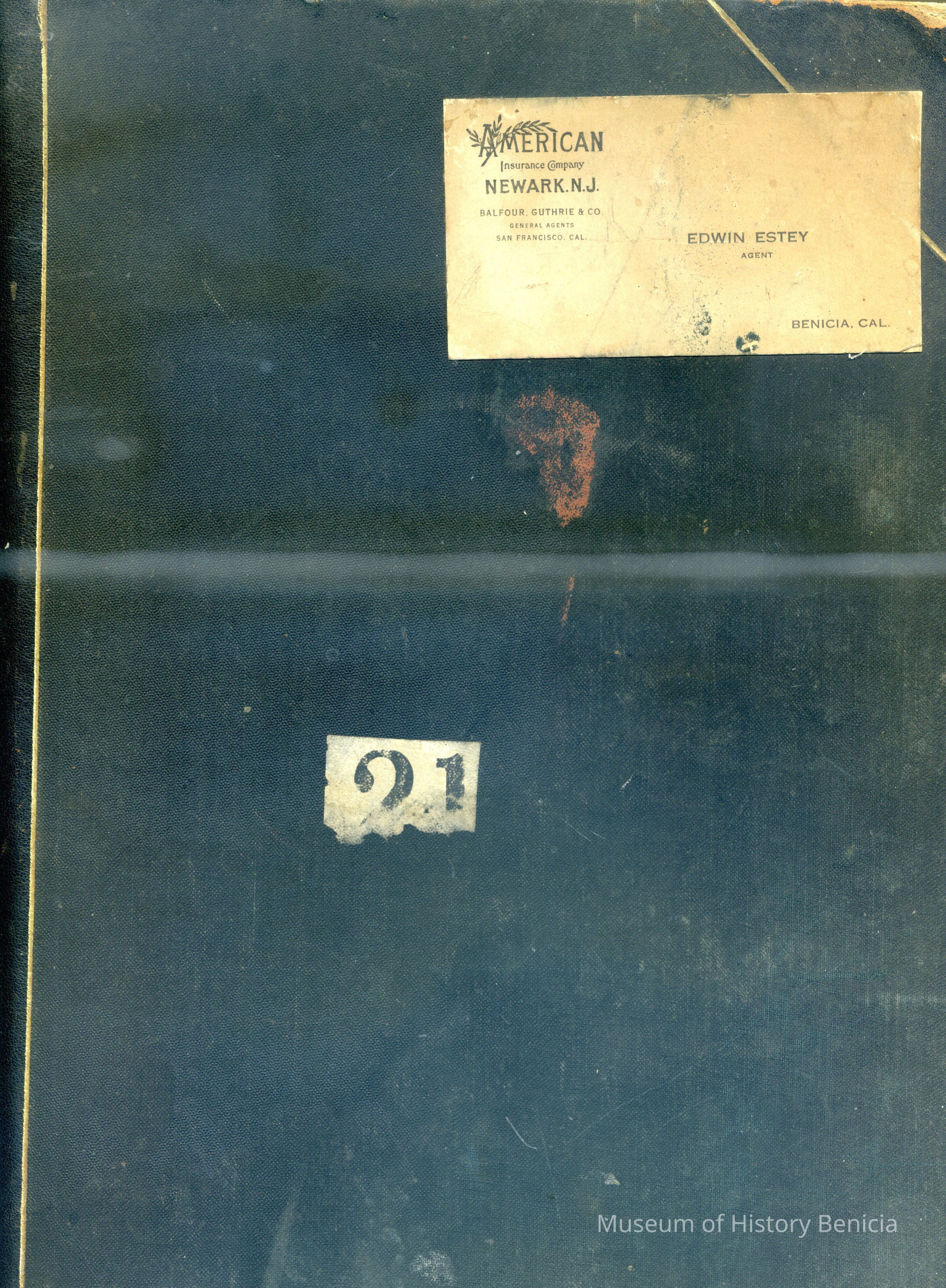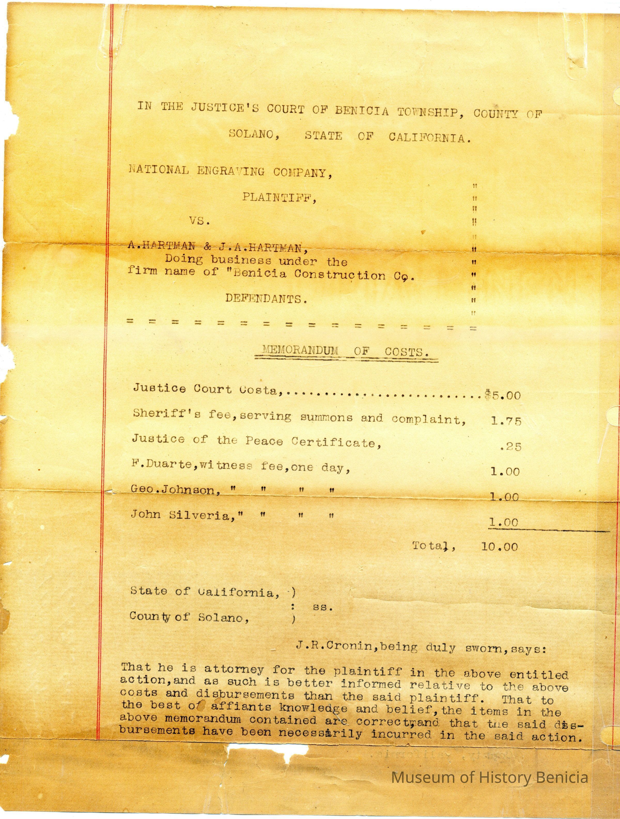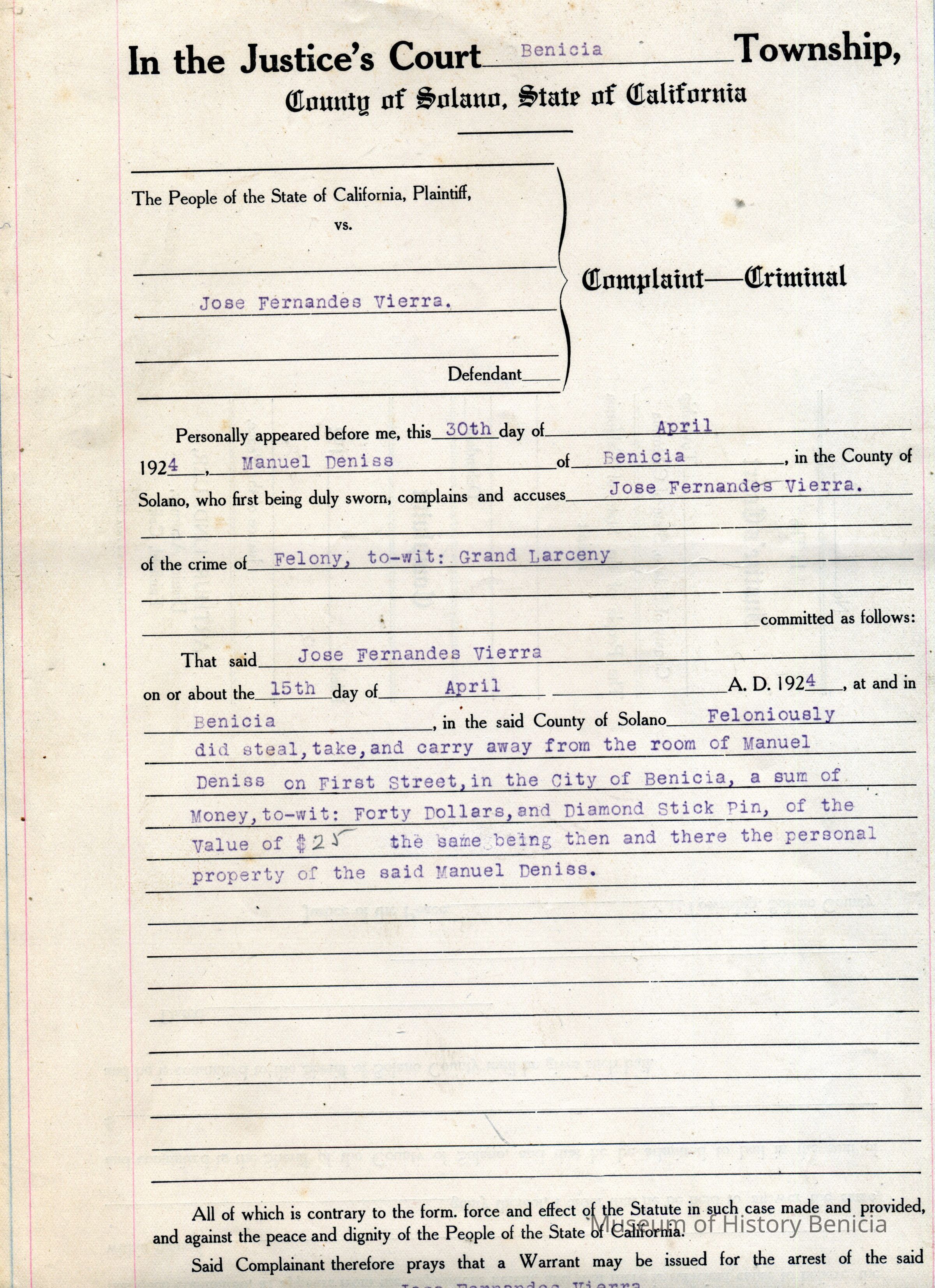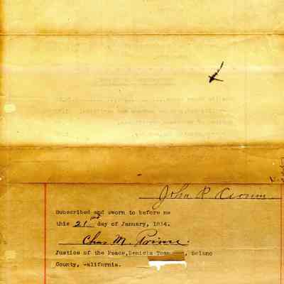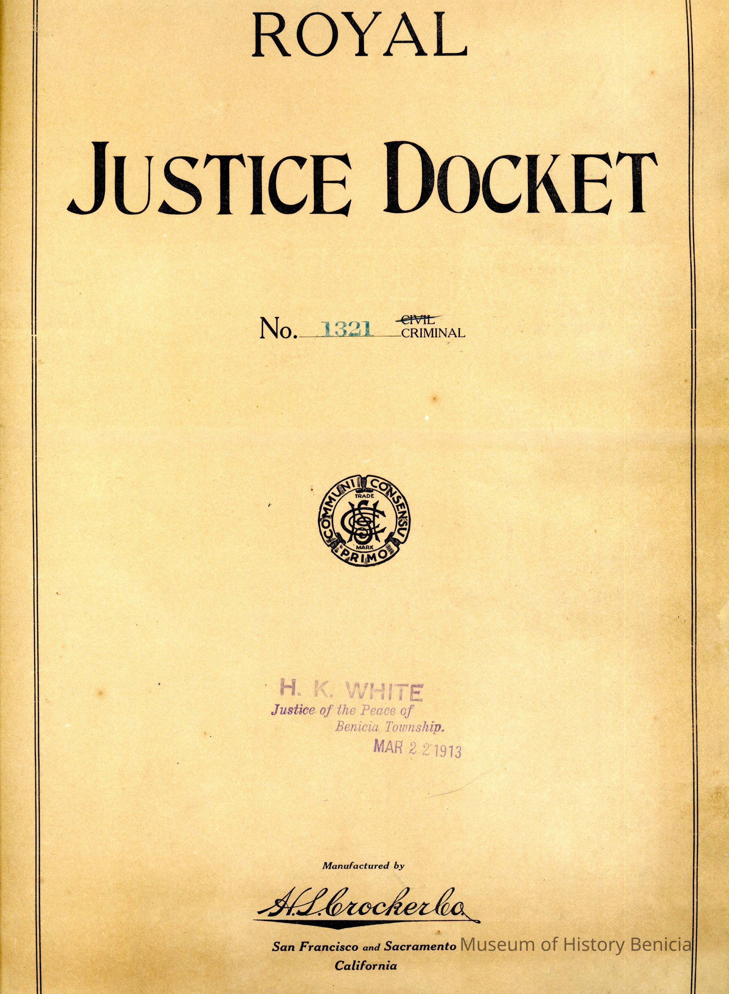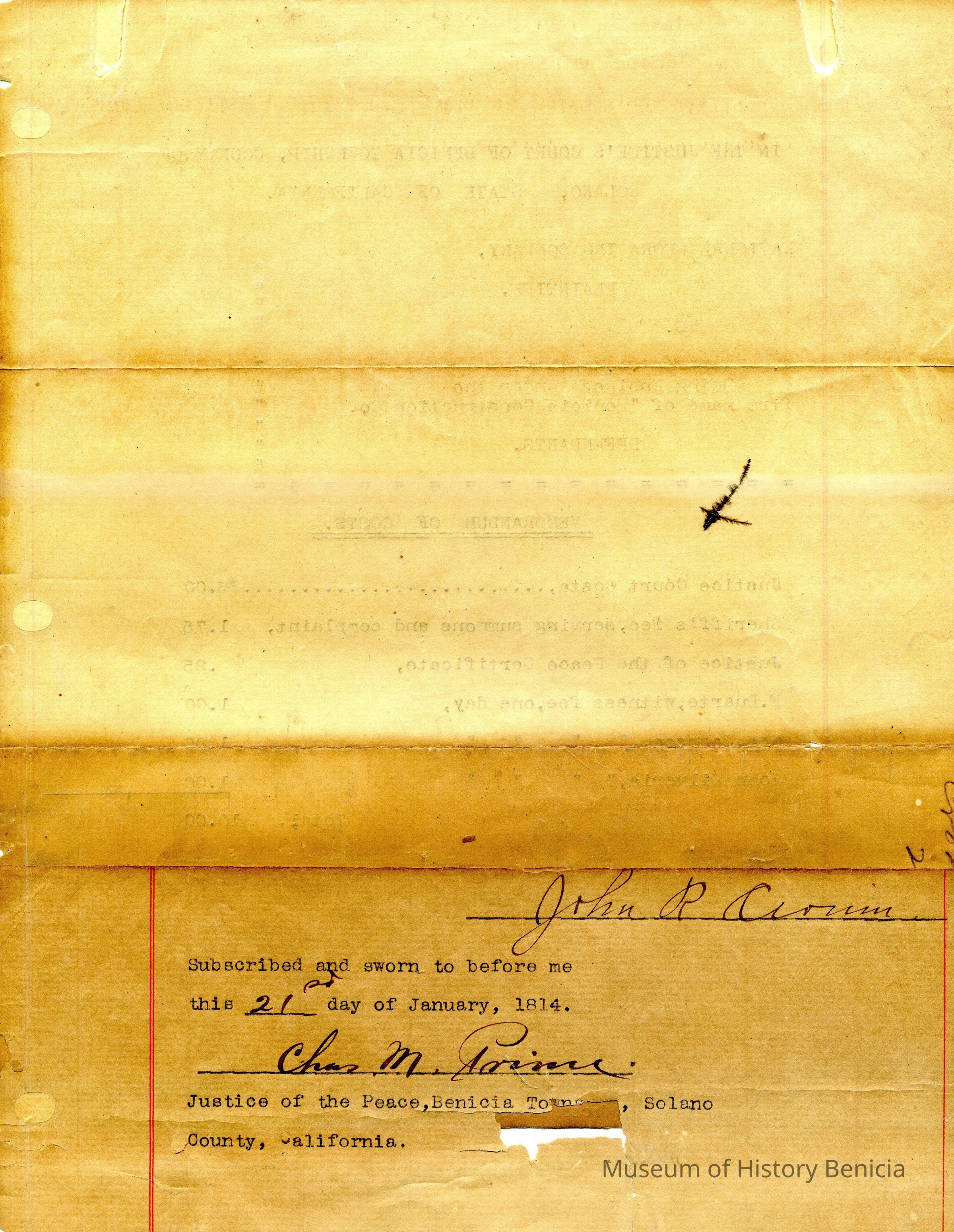 Included loose in the book are several original criminal complaint forms or bond and warrants mostly from 1924. Included is one court paper showing court costs for the case of National Engraving vs. Benicia Construction Co. It is dated 01/21/1814 and signed by Charles M Prince Justice of the Peace.Collection
