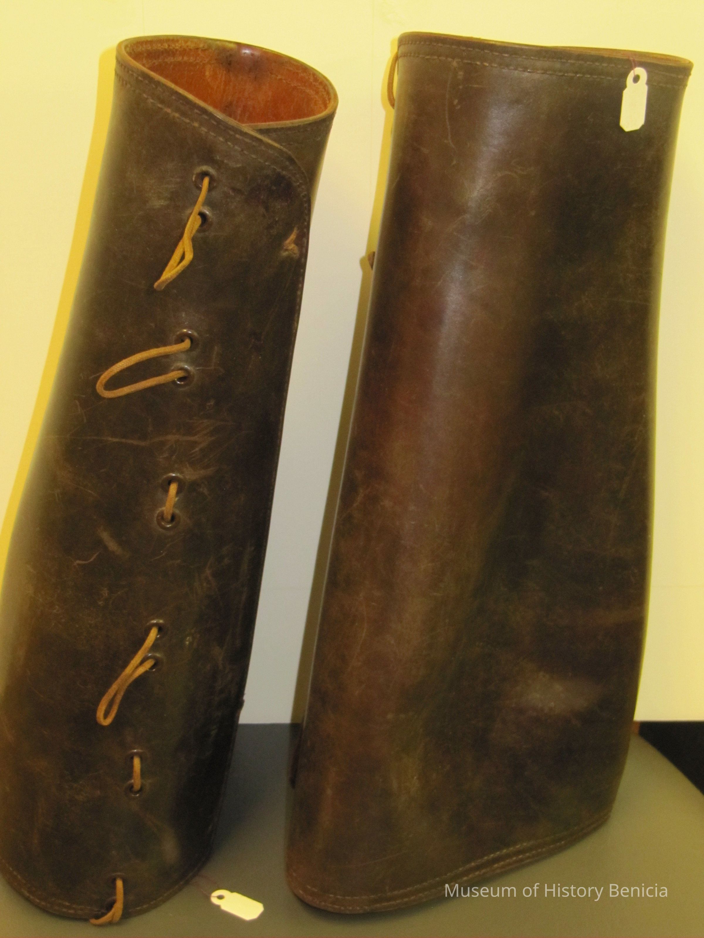 A pair of riding leggings. They are dark brown leather about 12 inches long and 14 inches across. They are fastened with leather loops that go arounr a metal post. They are made by the Reveille Legging Company.Collection