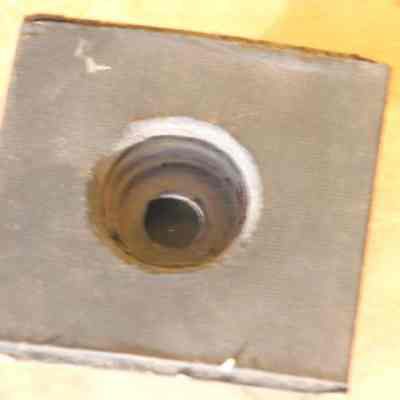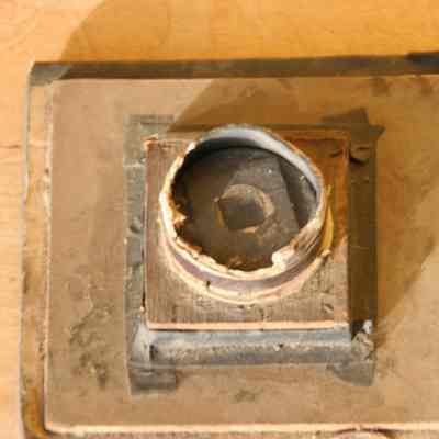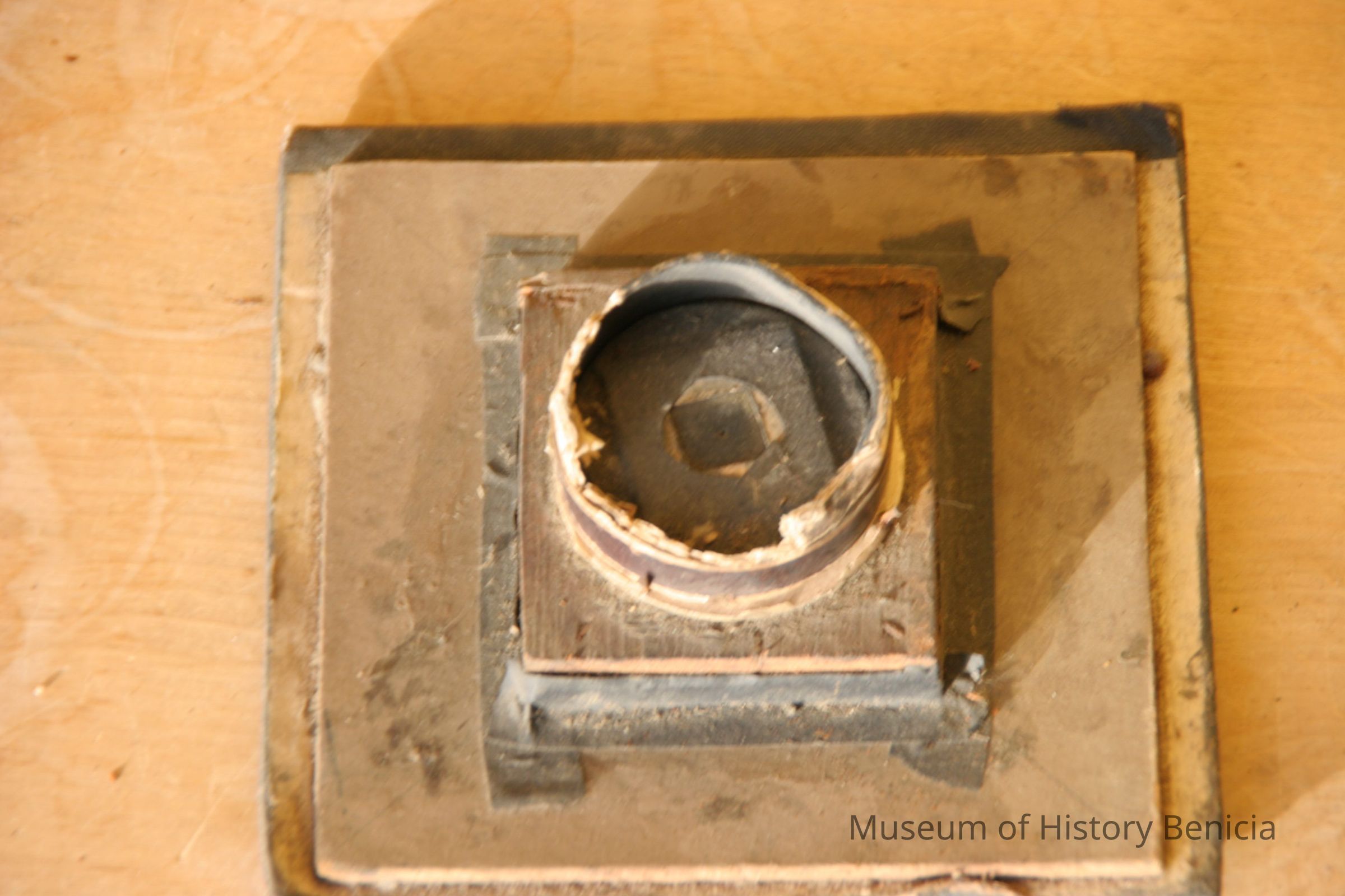 Wooden and cardboard homemade photographic item. May be a board used to mount a lens to a camera or enlarger.