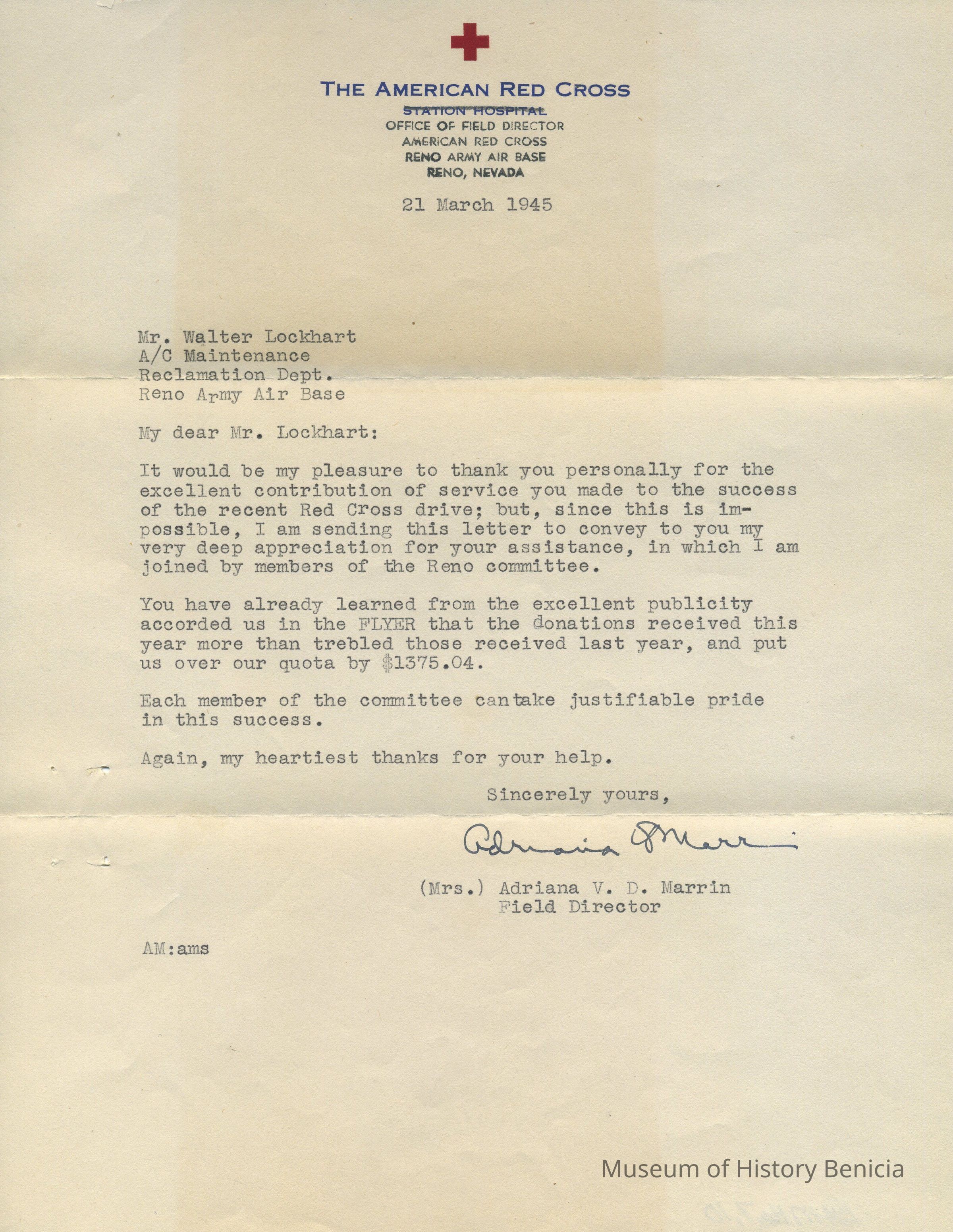 dated 21 March 1945, signed by Adriana V. D. Marrin, field director,