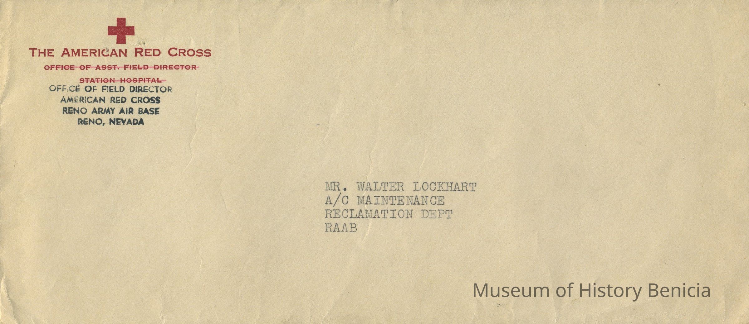 BHM2016.007.0010a - envelope which is not stamped or cancelled; addressed to Mr. Walter Lockhart, A/C Maintenance, Reclamation Dept, RAAB from The American Red Cross, Office of Asst. Field Director, Station Hospital Reno Army Air Base holds thank you letter for assistance in donation drive 1945Collection