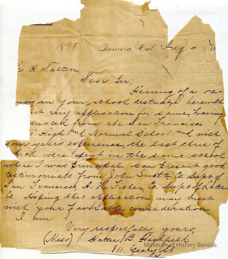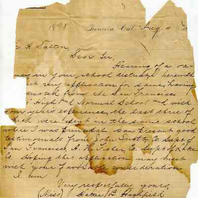 A letter dated 08/04/1891 from Hattie B Highfield inquiring about a job at the Benicia school district. The letter is addressed to Mr. A Dalton and lists her experience in San Francisco schools and lists Mr. John Swett and A.H. Fisher (County Superintendents of San Francisco and Lake county) as references.Collection