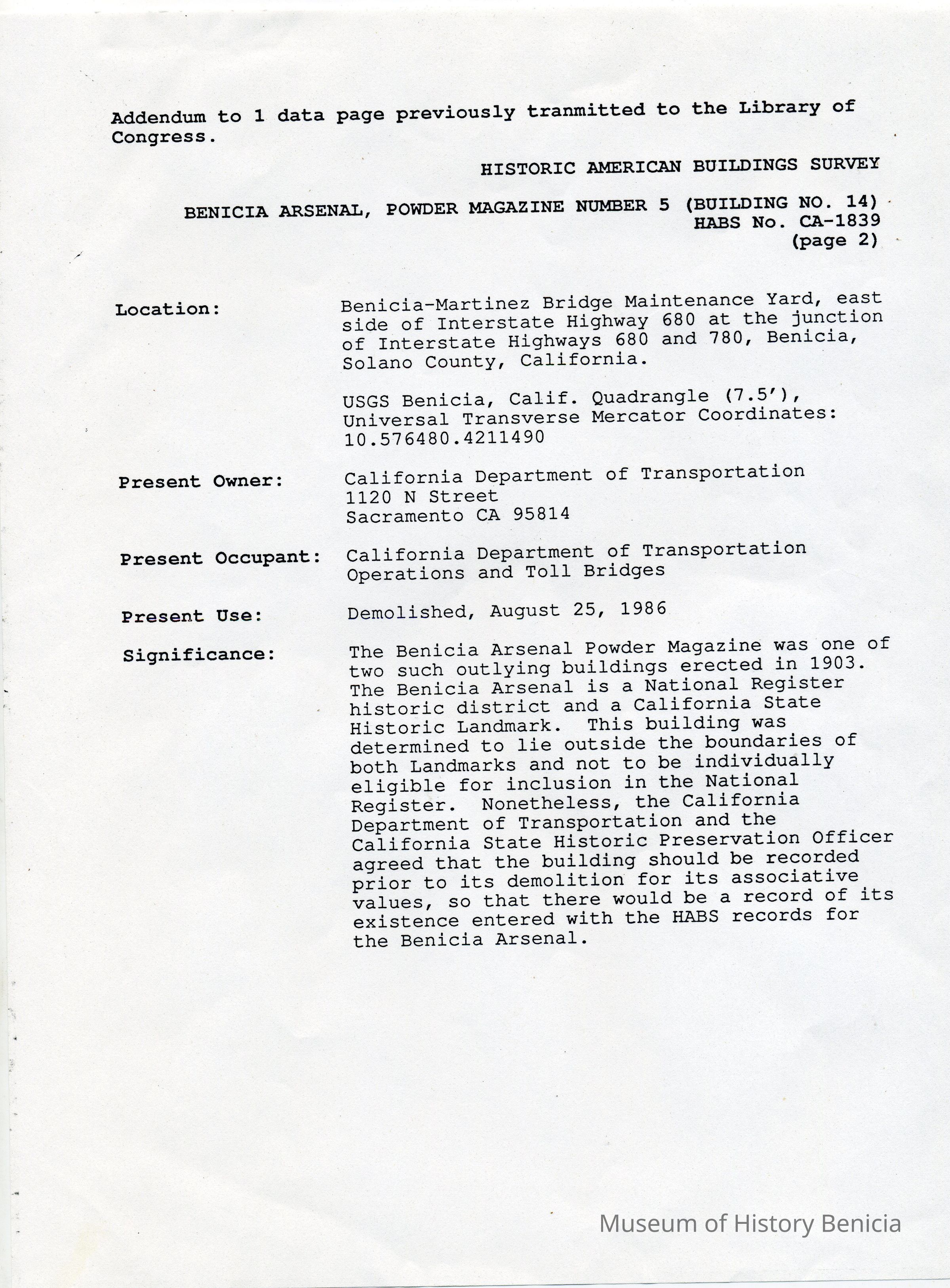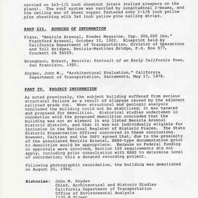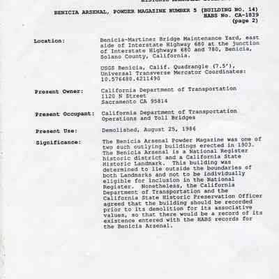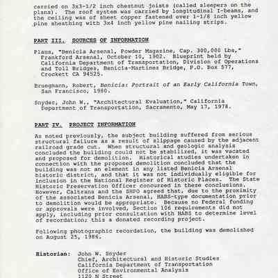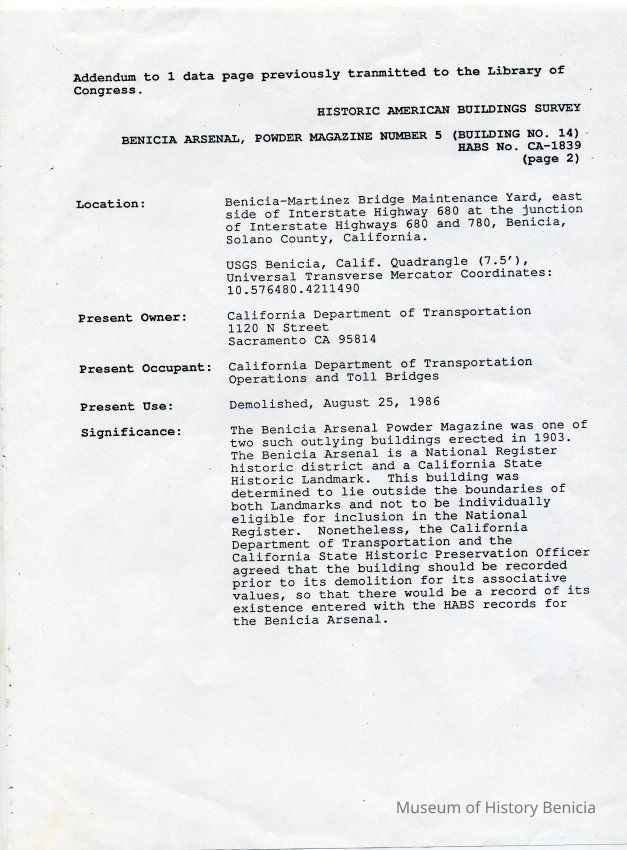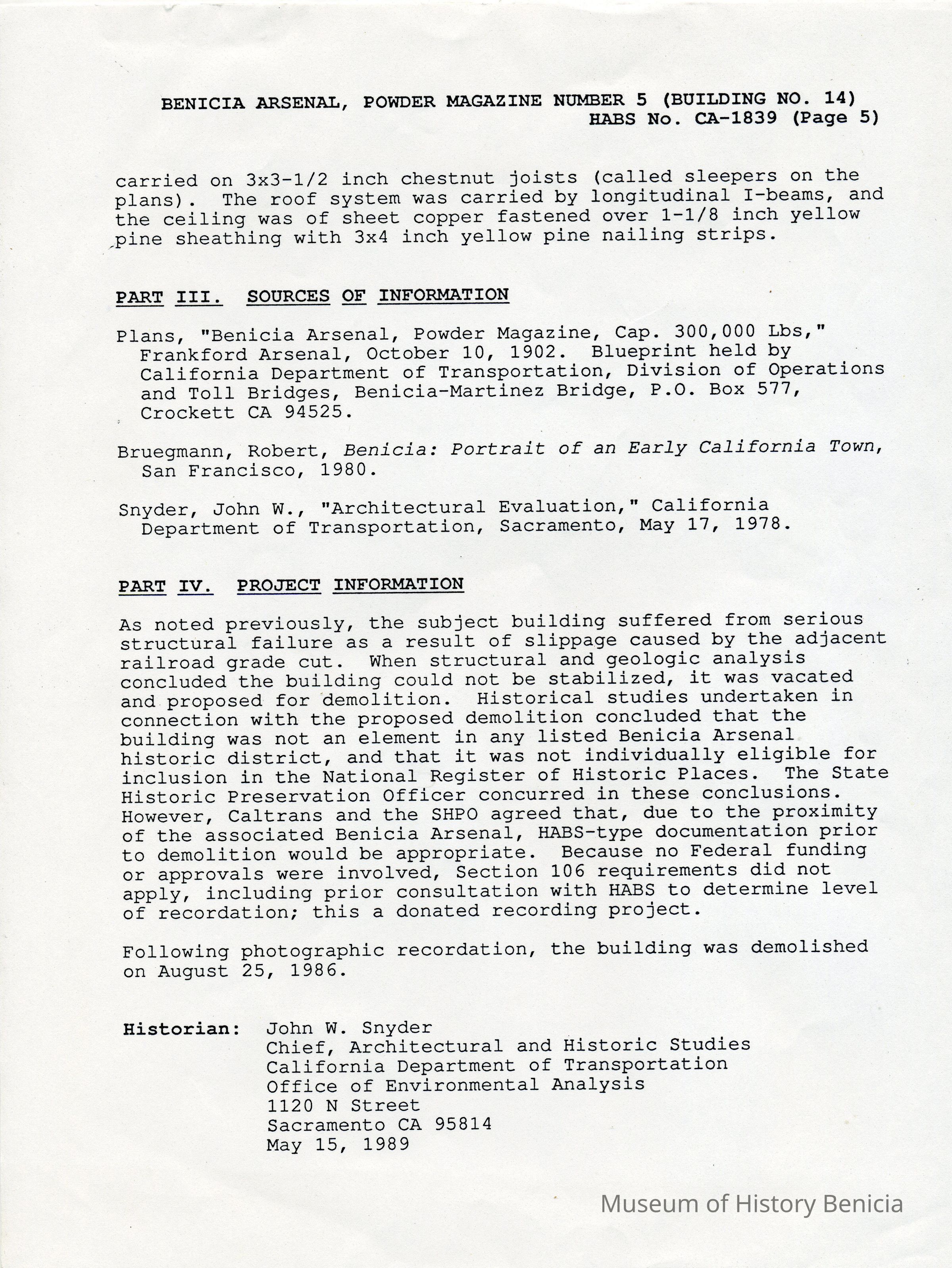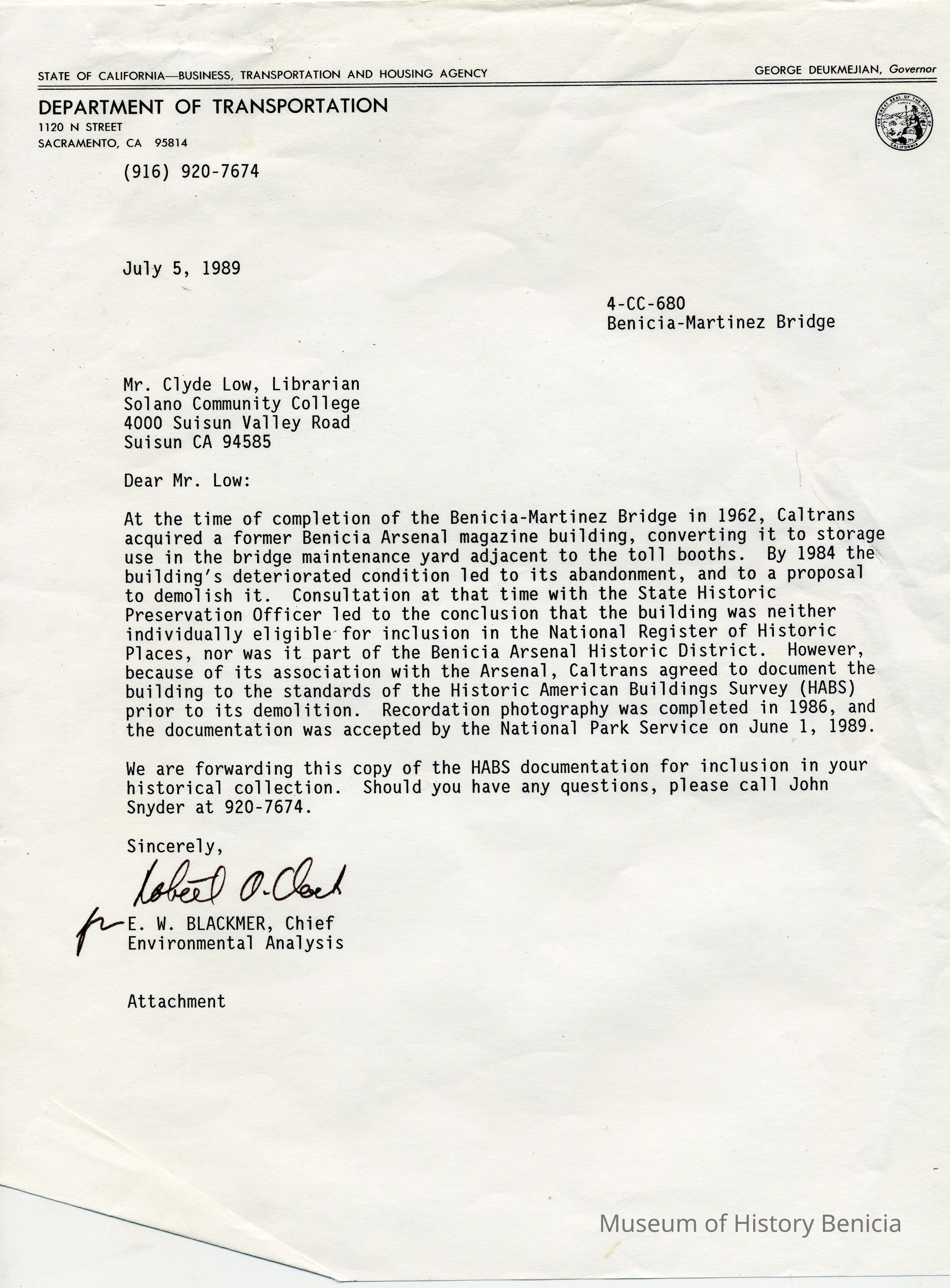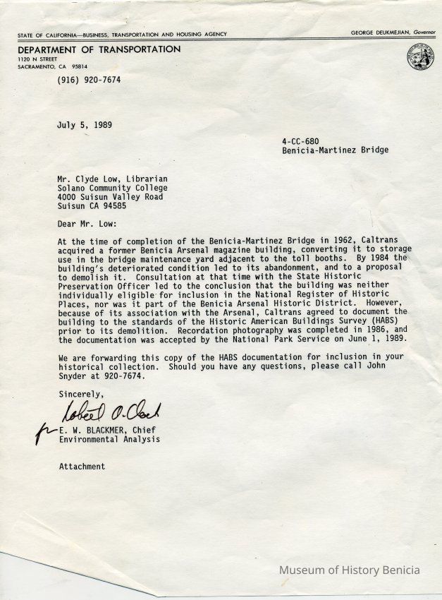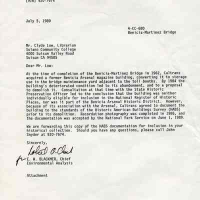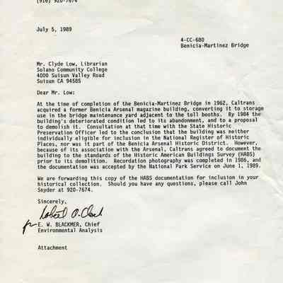 This is a letter from the California Department of Transportation to Mr. Clyde Low, a librarian at Solano Community College dated 07/05/1989. The letter explains the reason for the demolition of an Arsenal Powder Magazine which was near the Benicia-Martinez bridge. The powder magazine was built in 1903 but because of excavations for the bridge done in 1962, the building was becoming unsafe and needed to be demolished.