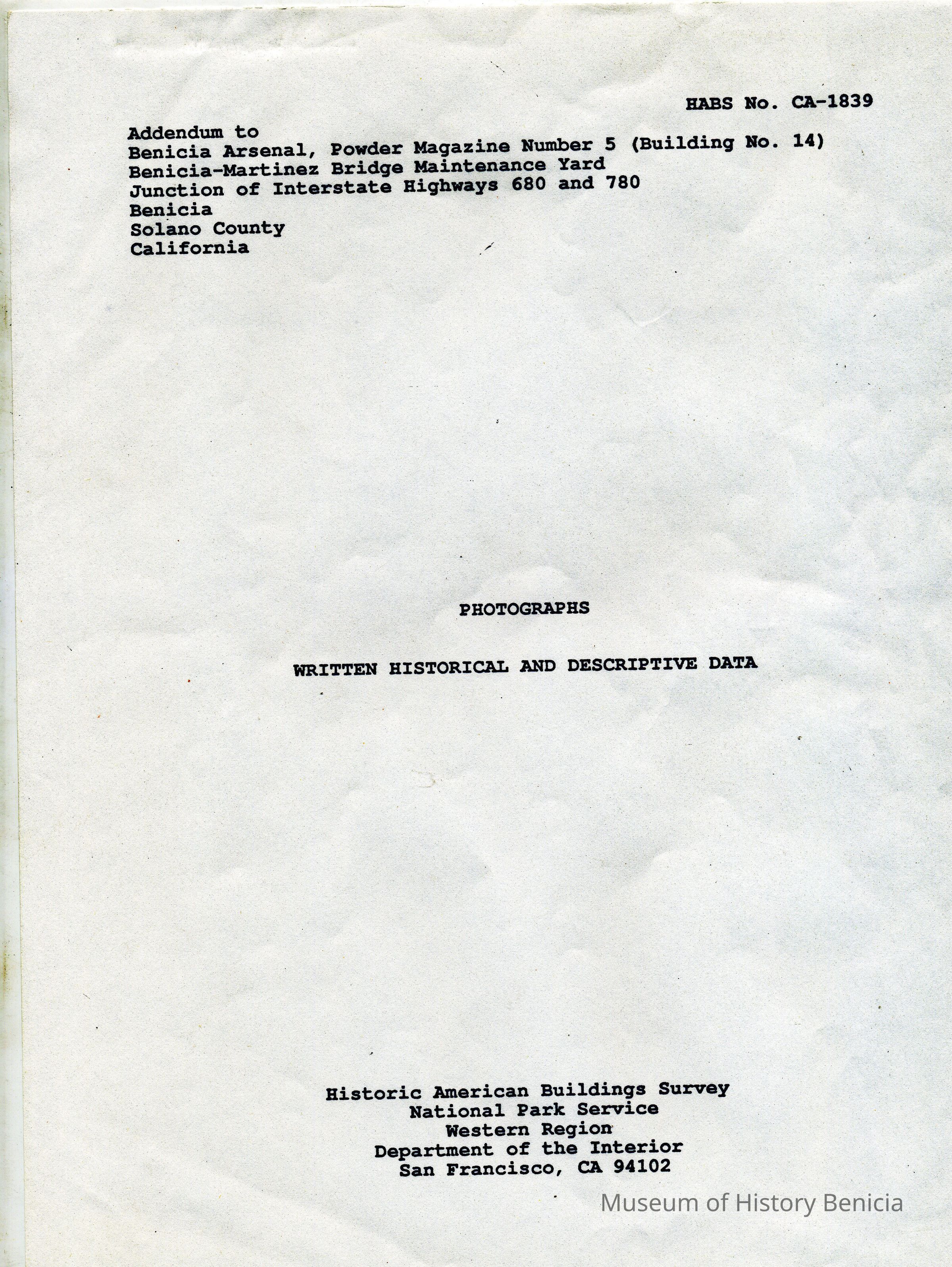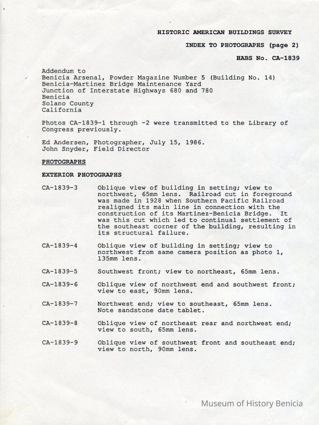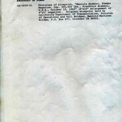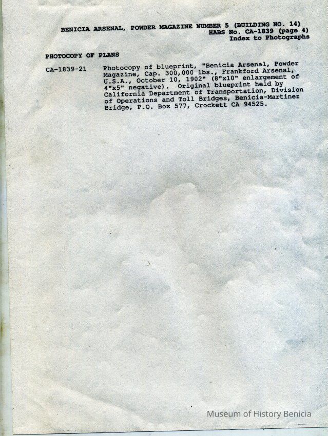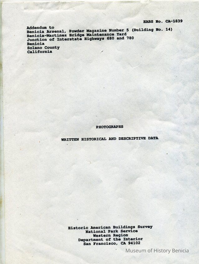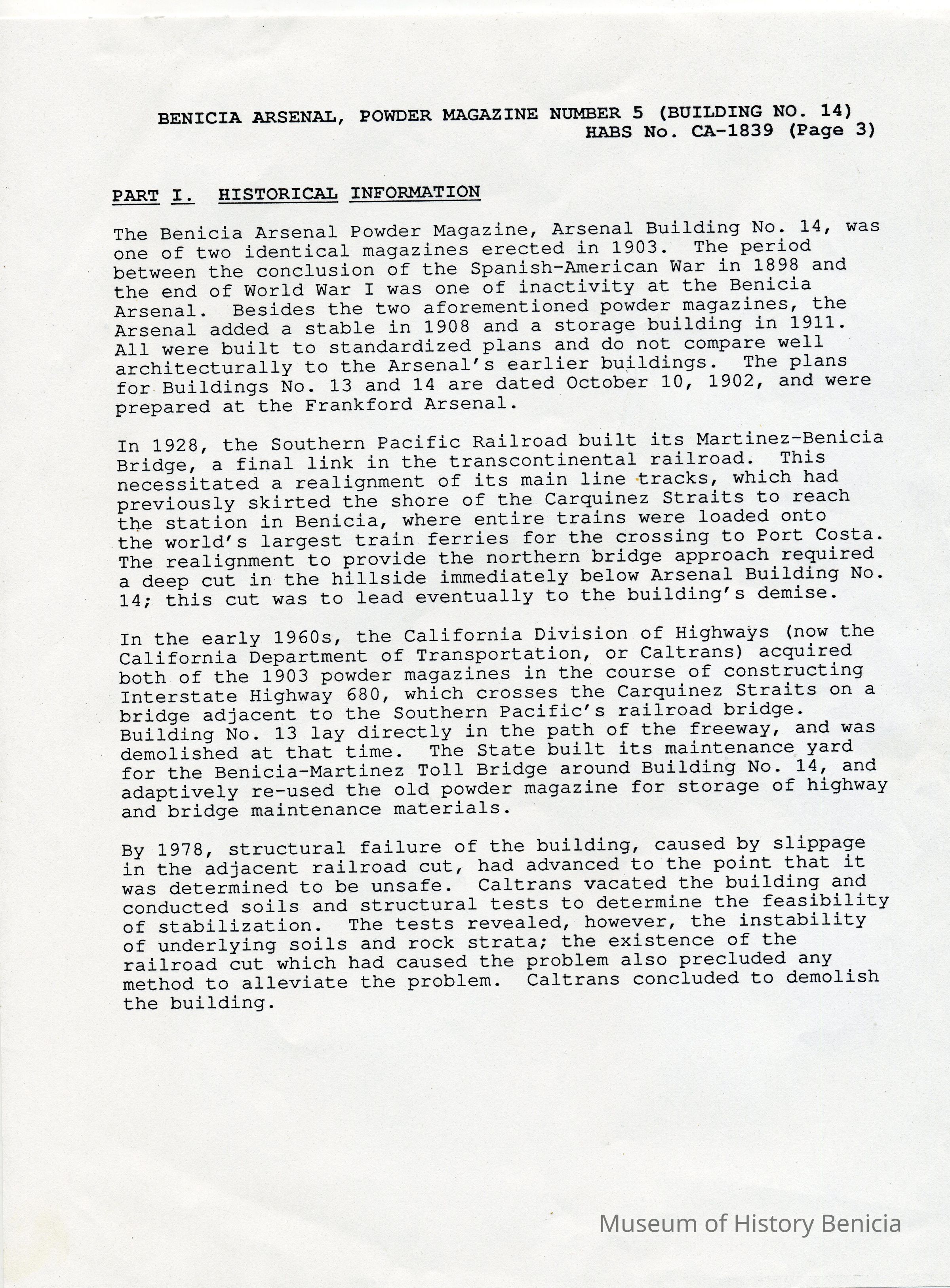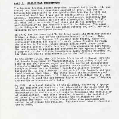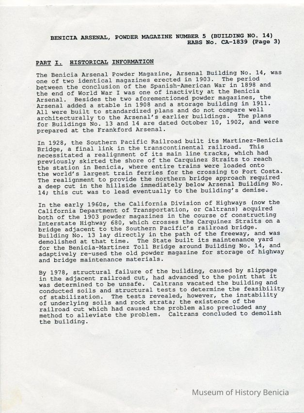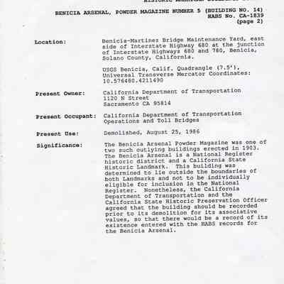 This is a letter from the California Department of Transportation to Mr. Clyde Low, a librarian at Solano Community College dated 07/05/1989. The letter explains the reason for the demolition of an Arsenal Powder Magazine which was near the Benicia-Martinez bridge. The powder magazine was built in 1903 but because of excavations for the bridge done in 1962, the building was becoming unsafe and needed to be demolished.