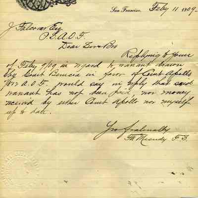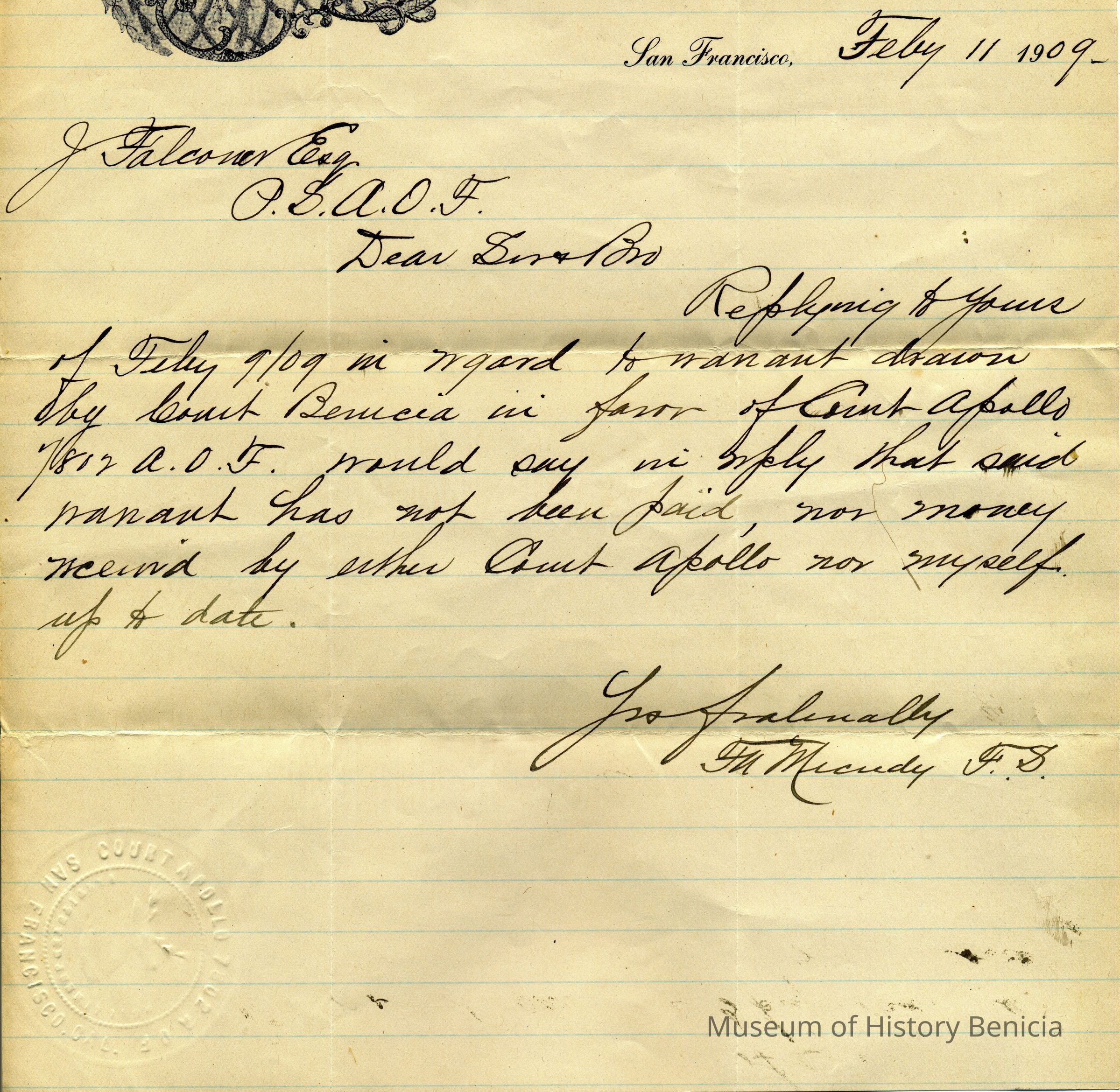 This is a letter dated 02/11/1909 from FA. Micudy to Mr Falconer regarding a query by him as to a warrant drawn for $3.10.