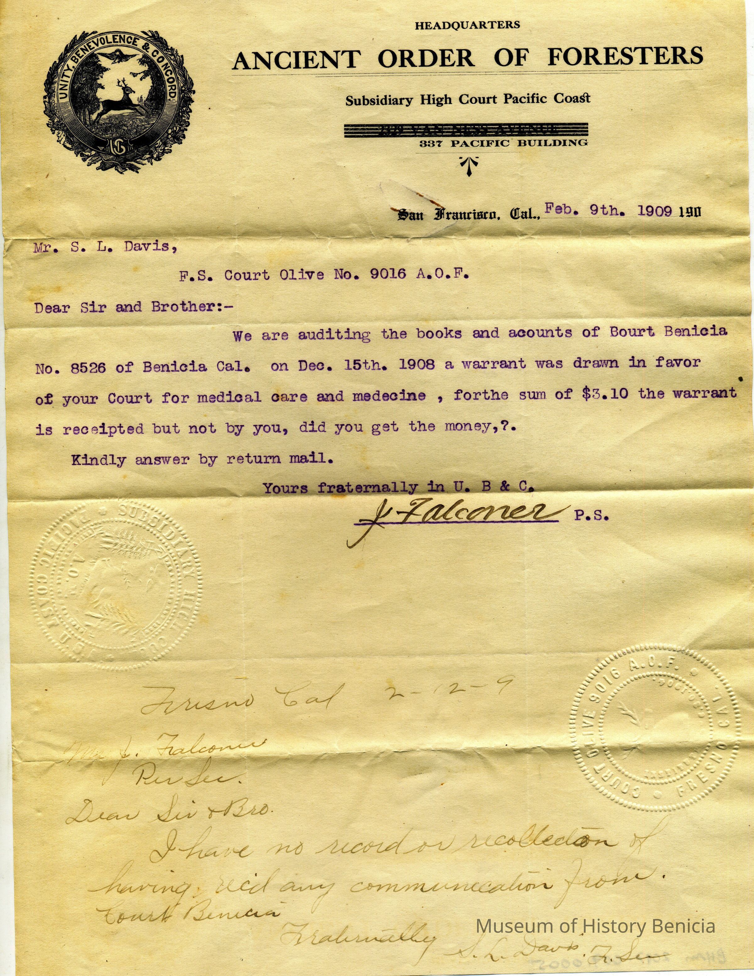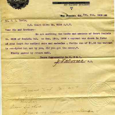 This is a letter dated 02/09/1909 from the Ancient Order of Foresters, High Court Pacific Coast to a Mr S.L. Davis regarding an expenditure of $3.10 for medical care. They are auditing the books and want to know if Mr. Davis can account for the expenditure.