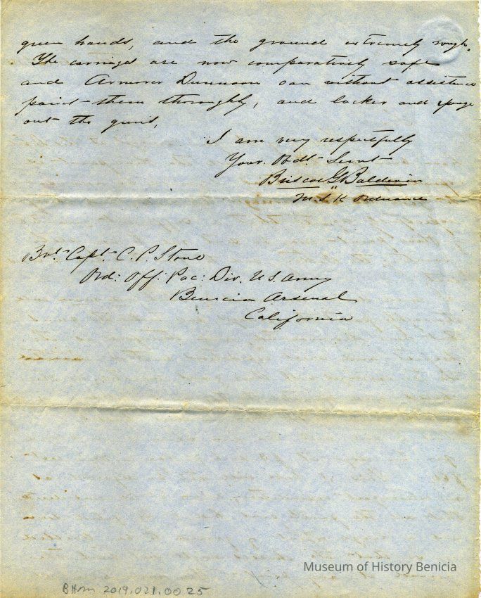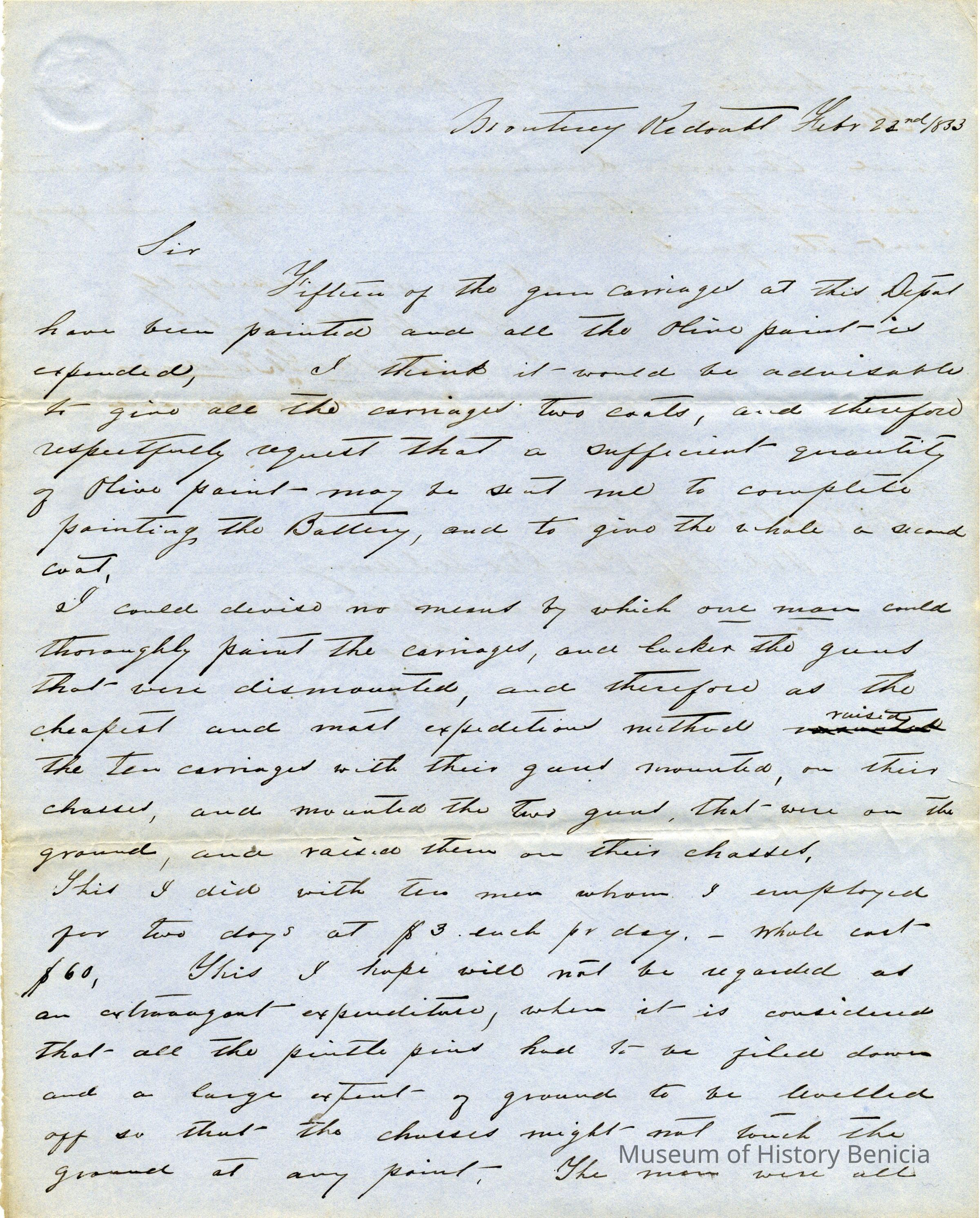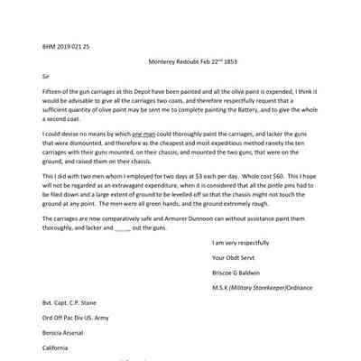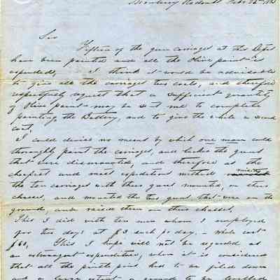 Letter is about Briscoe Baldwin maintaining 15 gun carriages at the Monterey Redoubt. He explains to Charles P. Stone how he did the painting and the fact that he had to hire two men at $3 per day each.Collection