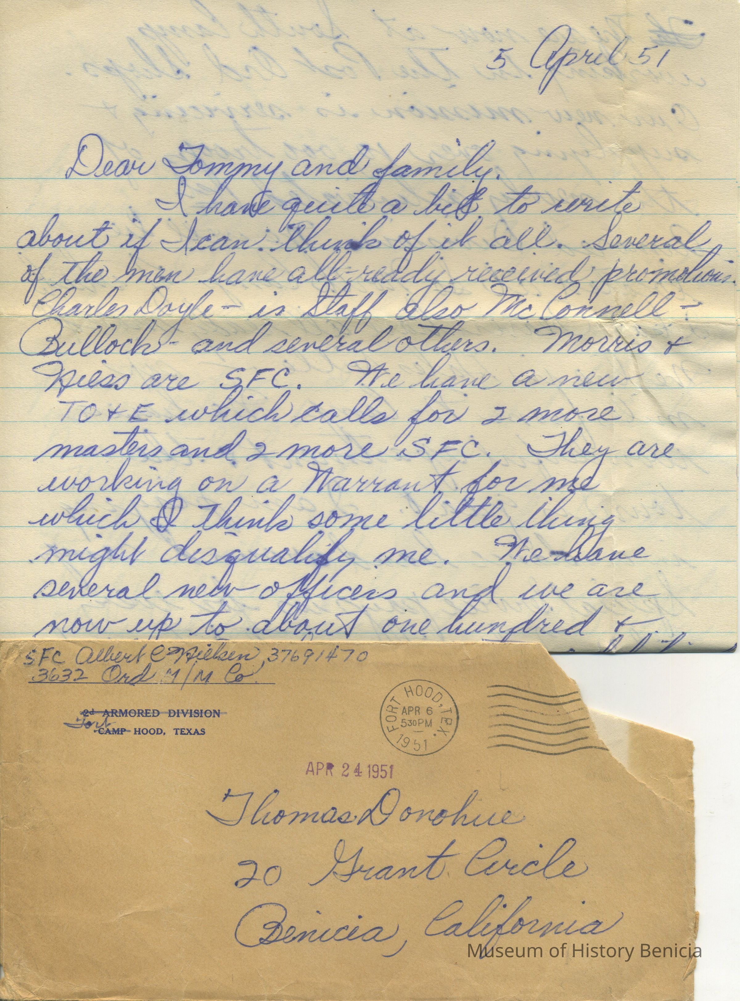 postmarked Fort Hood Tex, Apr. 6, 1951