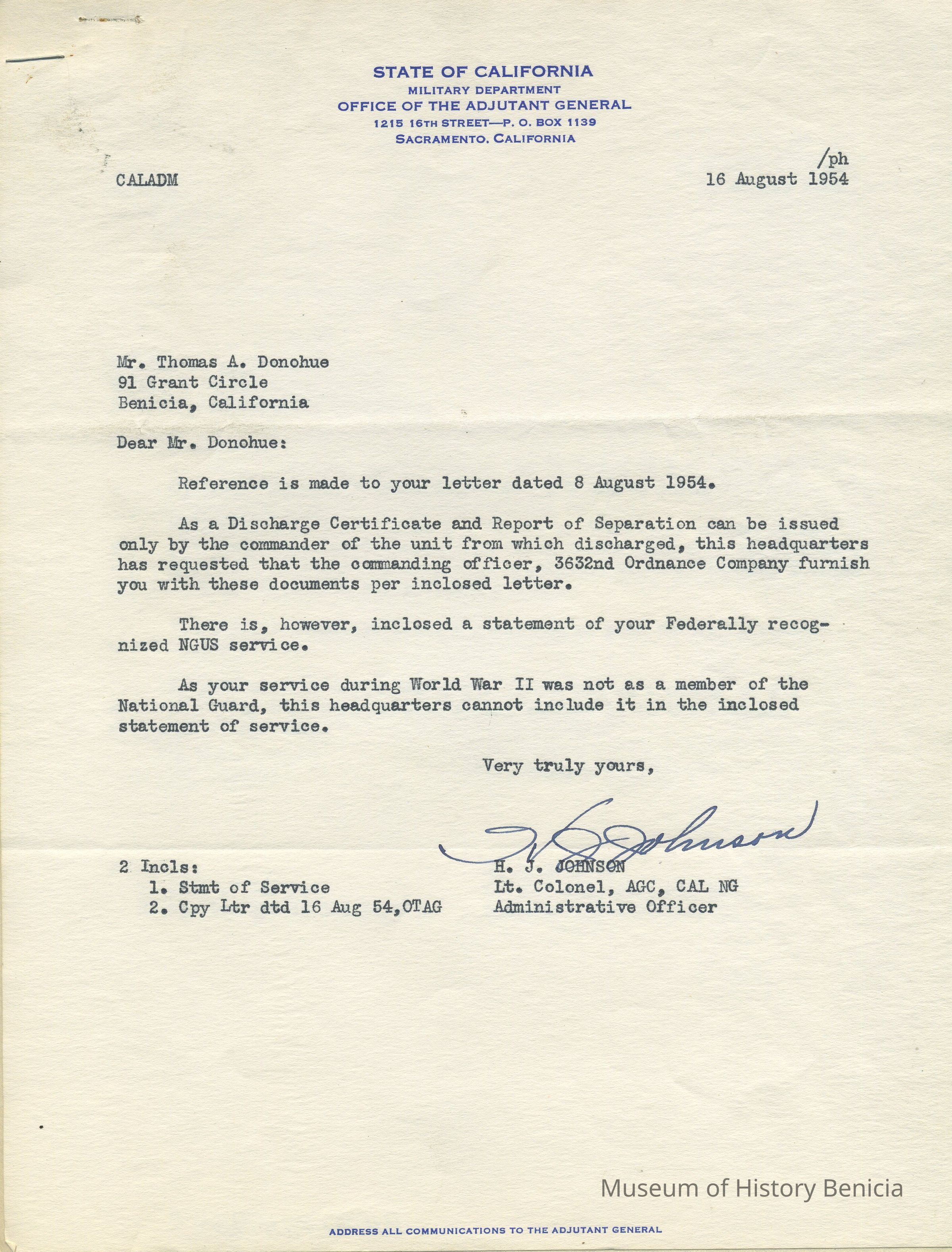 Copy of a letter from H.J. Johnson, Lt. Col. to Mr. Donohue regarding the request for a Discharge Certificate, and a Separation Report;