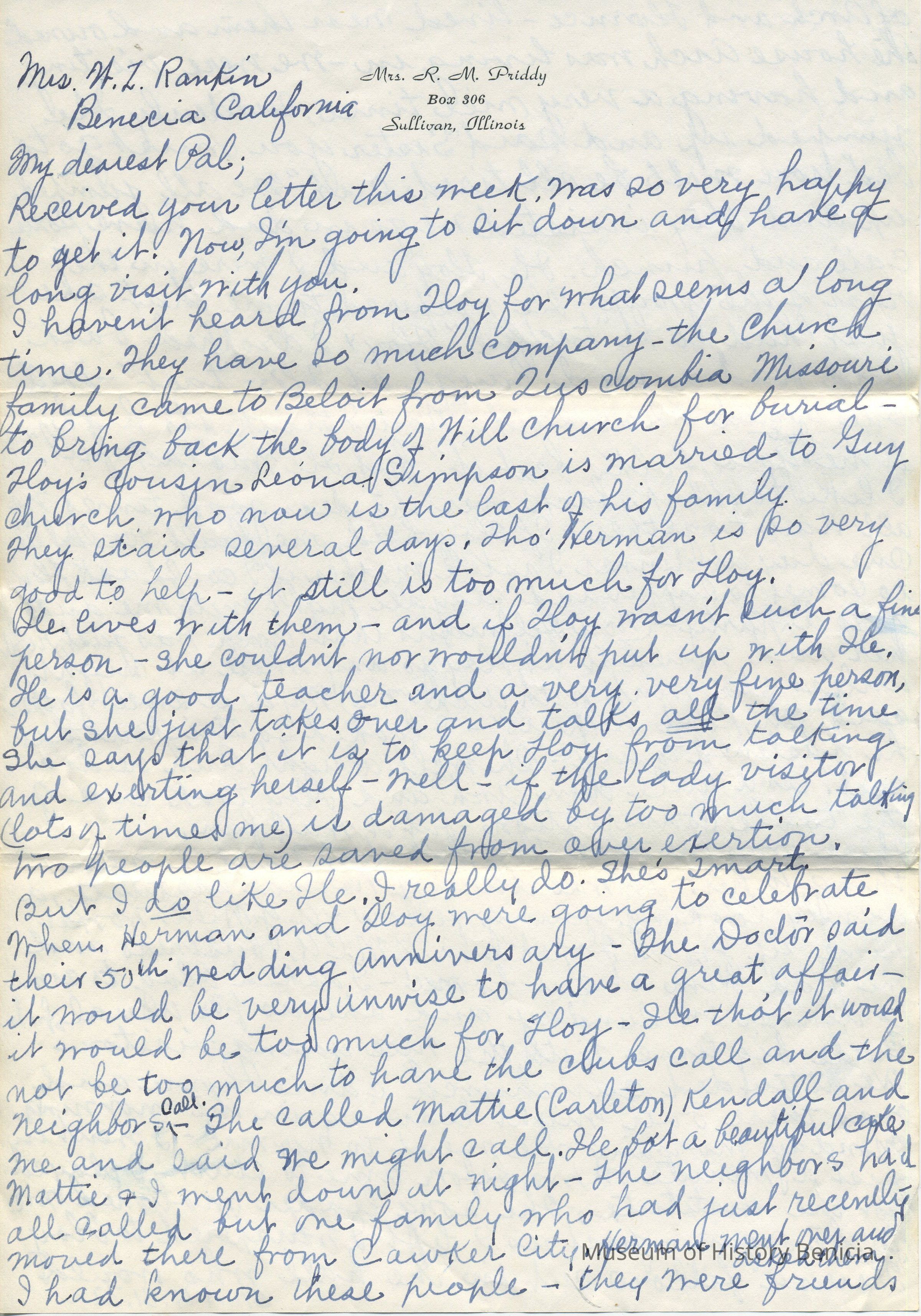 Letter to Mrs. W.Z. Rankin in Benicia California from Mrs. R. M. Priddy in Sullivan Illinois. It is addressed "My Dearest Pal". It is two-and-a-half sheet covered on all sides with handwritten information about family member and many friends. It is signed "Lots of Love".