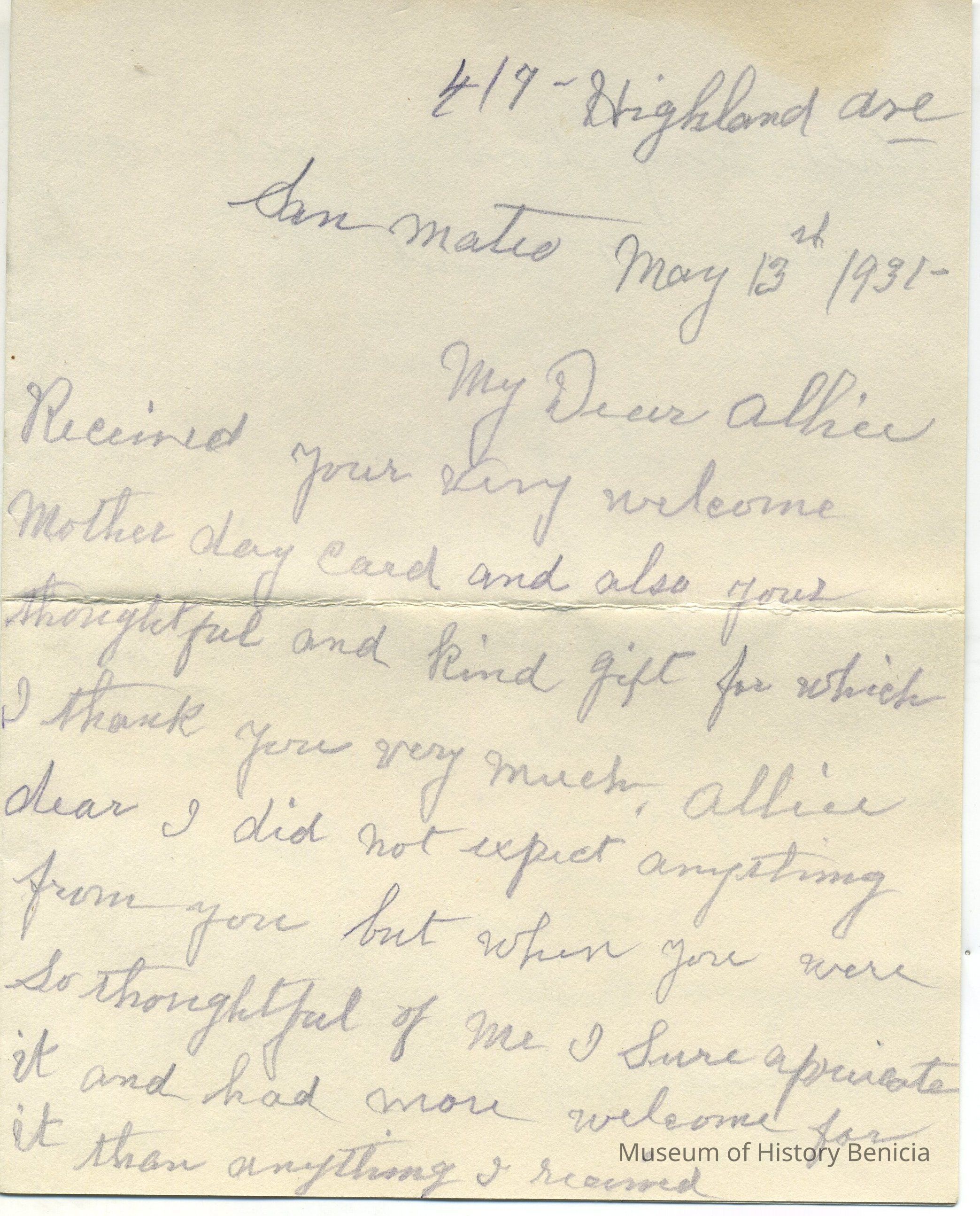 Letter to Miss Alice Keneally, Napa Cal dated May 13, 1931 from Mrs. K. Keneally, 417 Highland Ave, San Mateo, Cal.