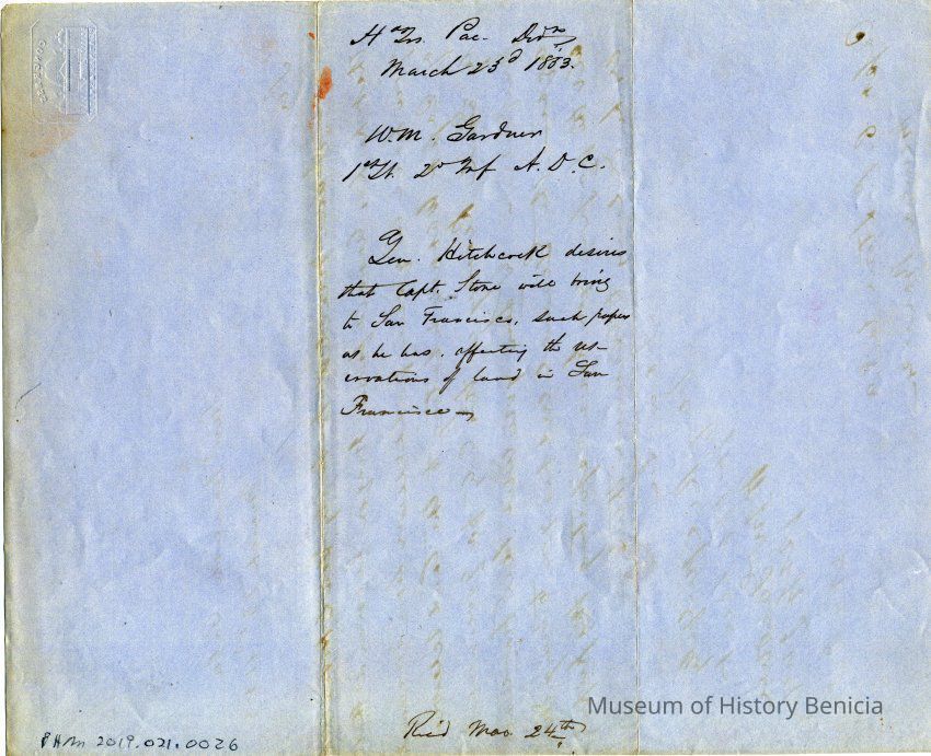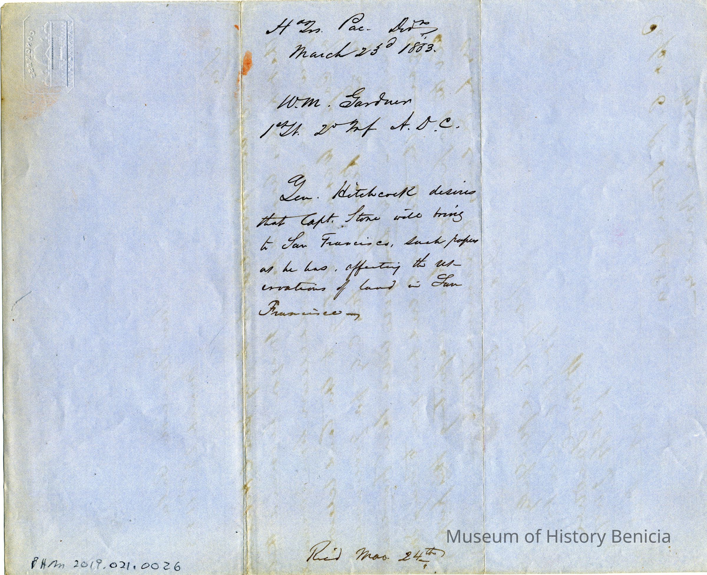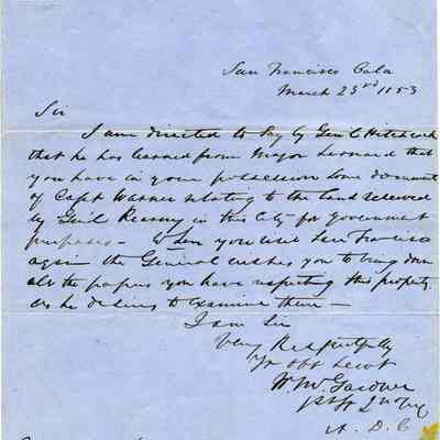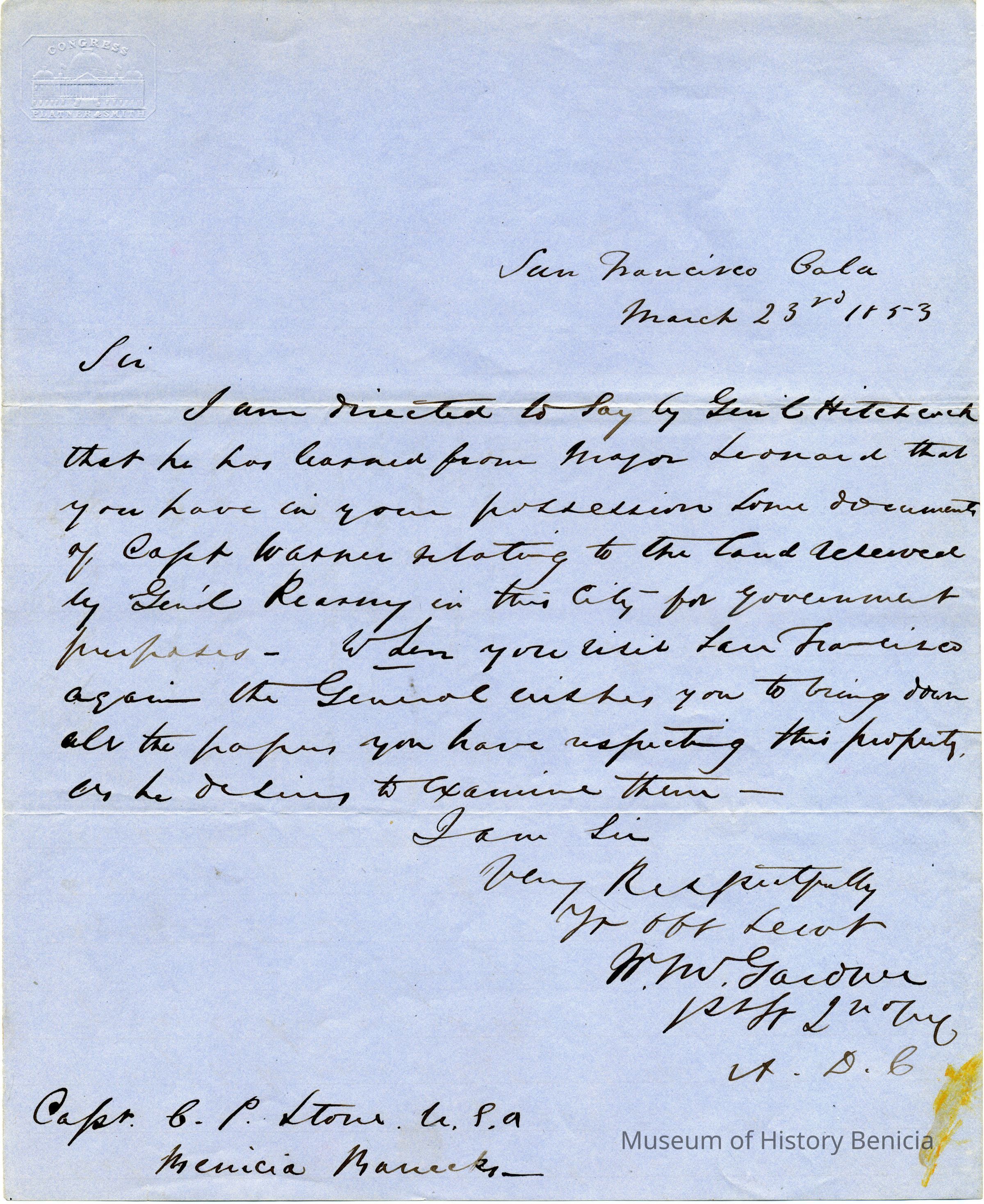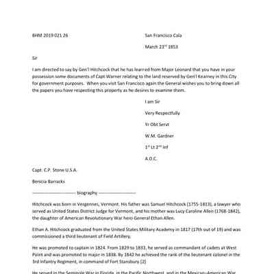 This is a letter from San Francisco Presidio to Captain Charles P. Strone in Benicia vis a Lt. Gardner for some documents that Capt. Stone has regarding the ownership of the Presidio.Collection