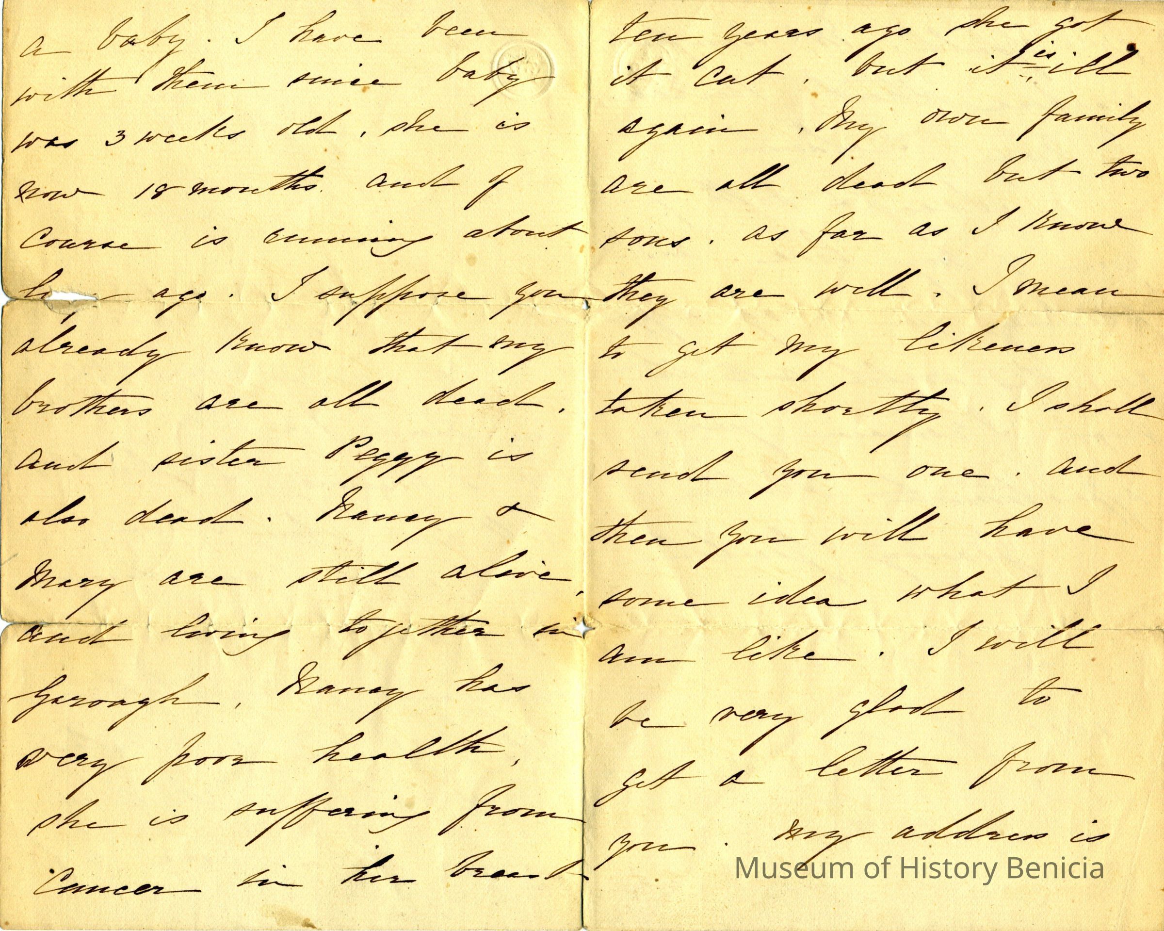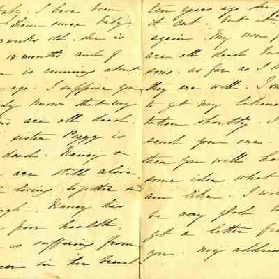 The letter shares some family information. The writter is taking care of a small baby (18 months old) . She relays that her brothers are all dead, her sister Peggy is dead, Gancy and Mary are alive, Nanvy has breast cancer, and her own family is all dead except for two sons. She intends to get a "likeness" (photograph) done and will send it so her sister knows what she looks like. She gives her address and asks her sister to write.Collection
