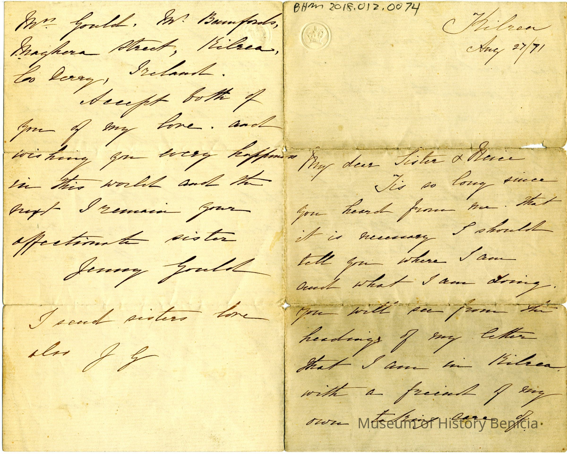 Letter from a sister, Jenny Gould, in Ireland to her sister in America dated August 27, 1871. The letter comes from Kilrea, Ireland. This is in Northern Ireland.