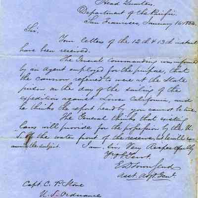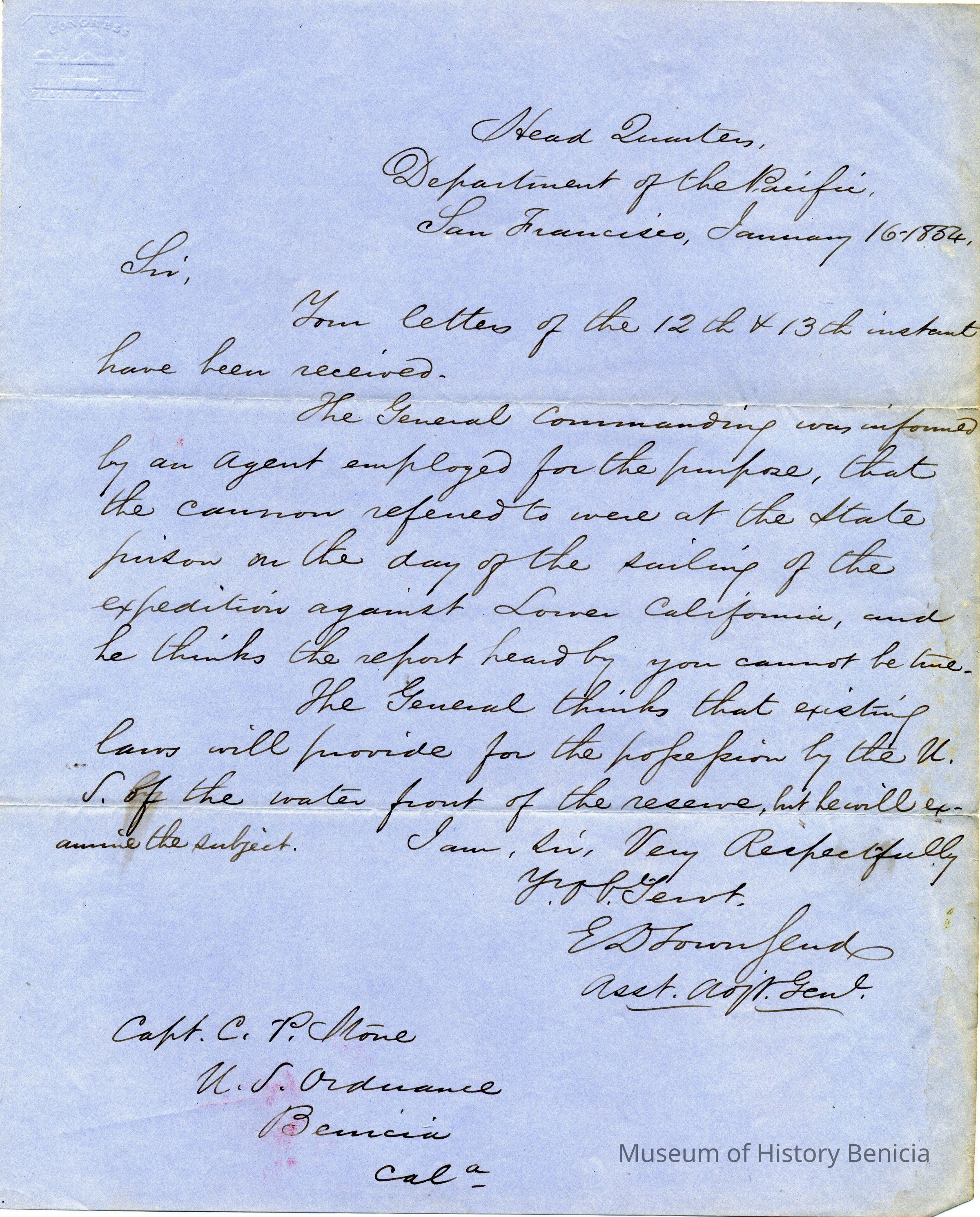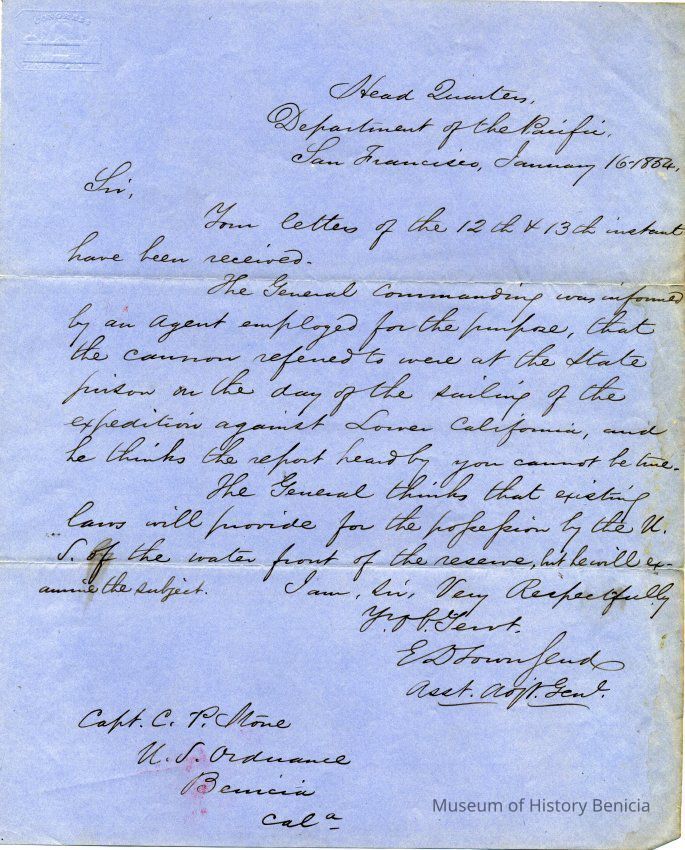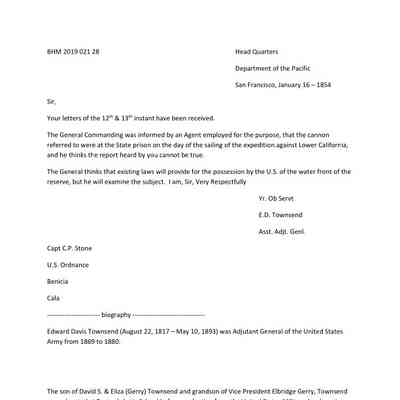 This is a letter between General Edward D. Townsend and Captain Charles P. Stone. It is part of an ongoing exchange and I'm not sure of the situation being discussed. They mention the cannons being at the State Prison and also possession of the waterfront bythe U.S. Government reserve.Collection
