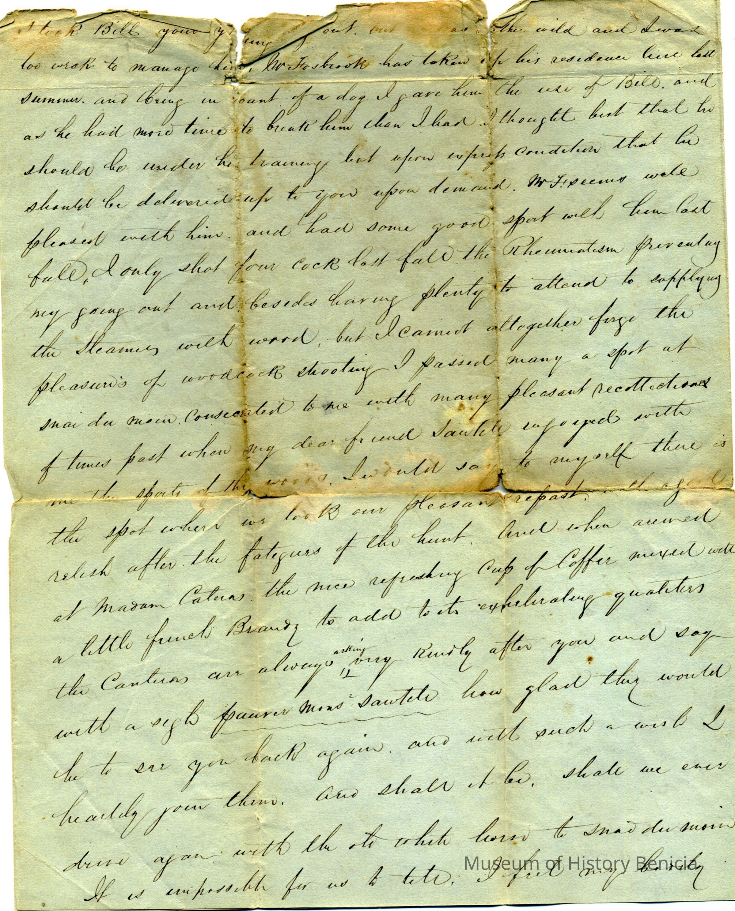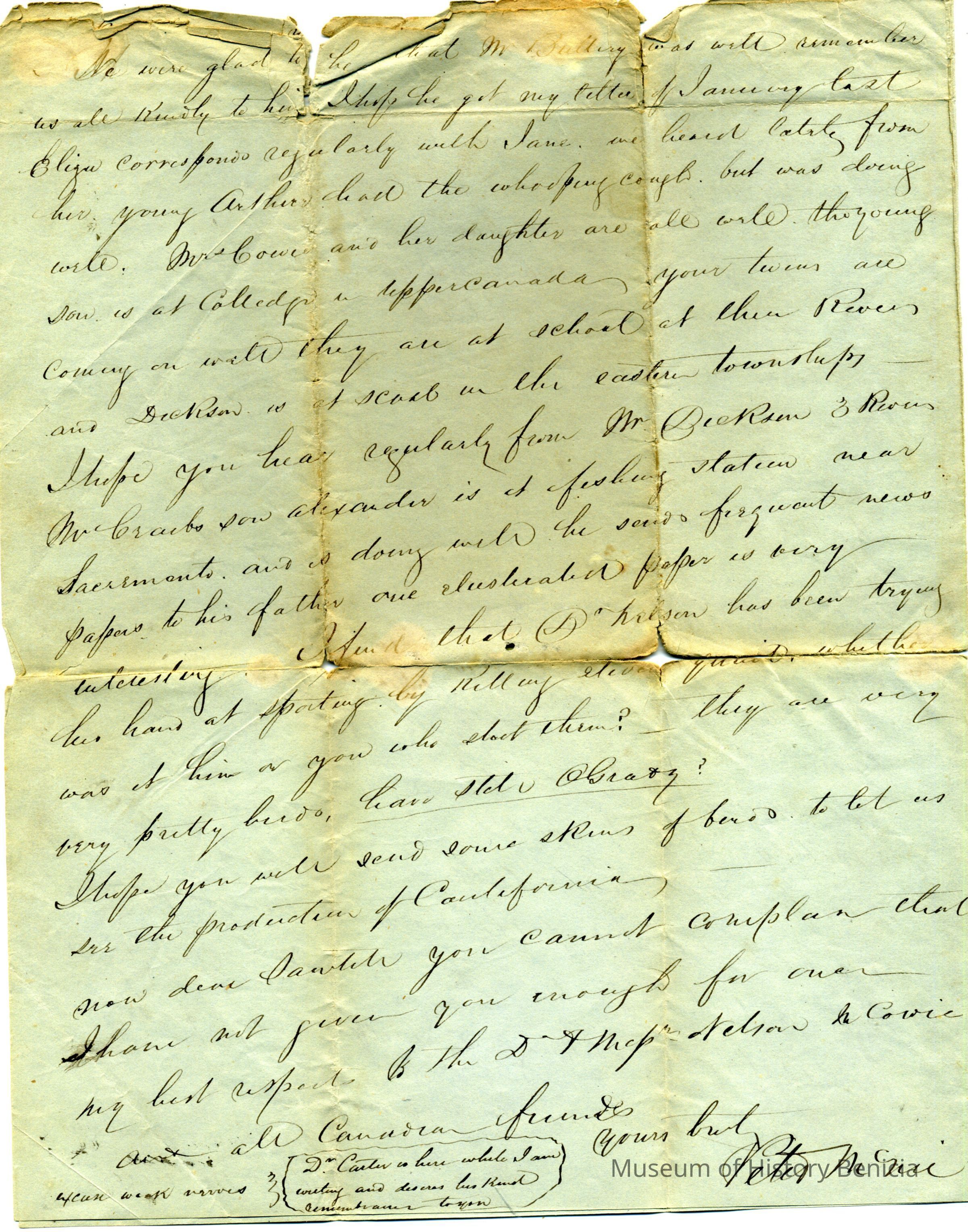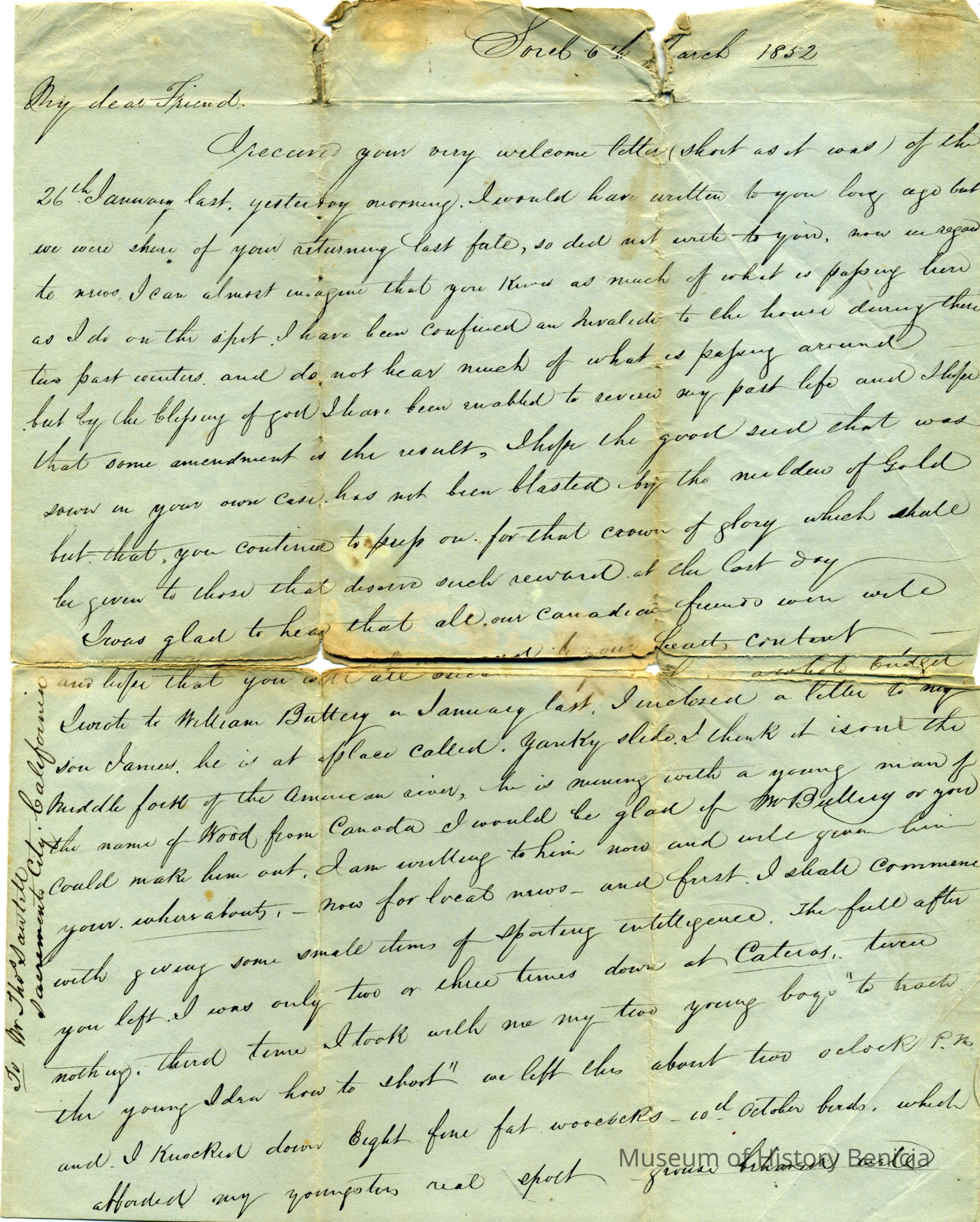 This is a letter dated 03/06/1852 from Peter Mcnie (?) to Mr Thomas Sawtell of Sacramento City, California. (The name sawtell is written on the margin of the letter in a different hand than the letter.)Collection