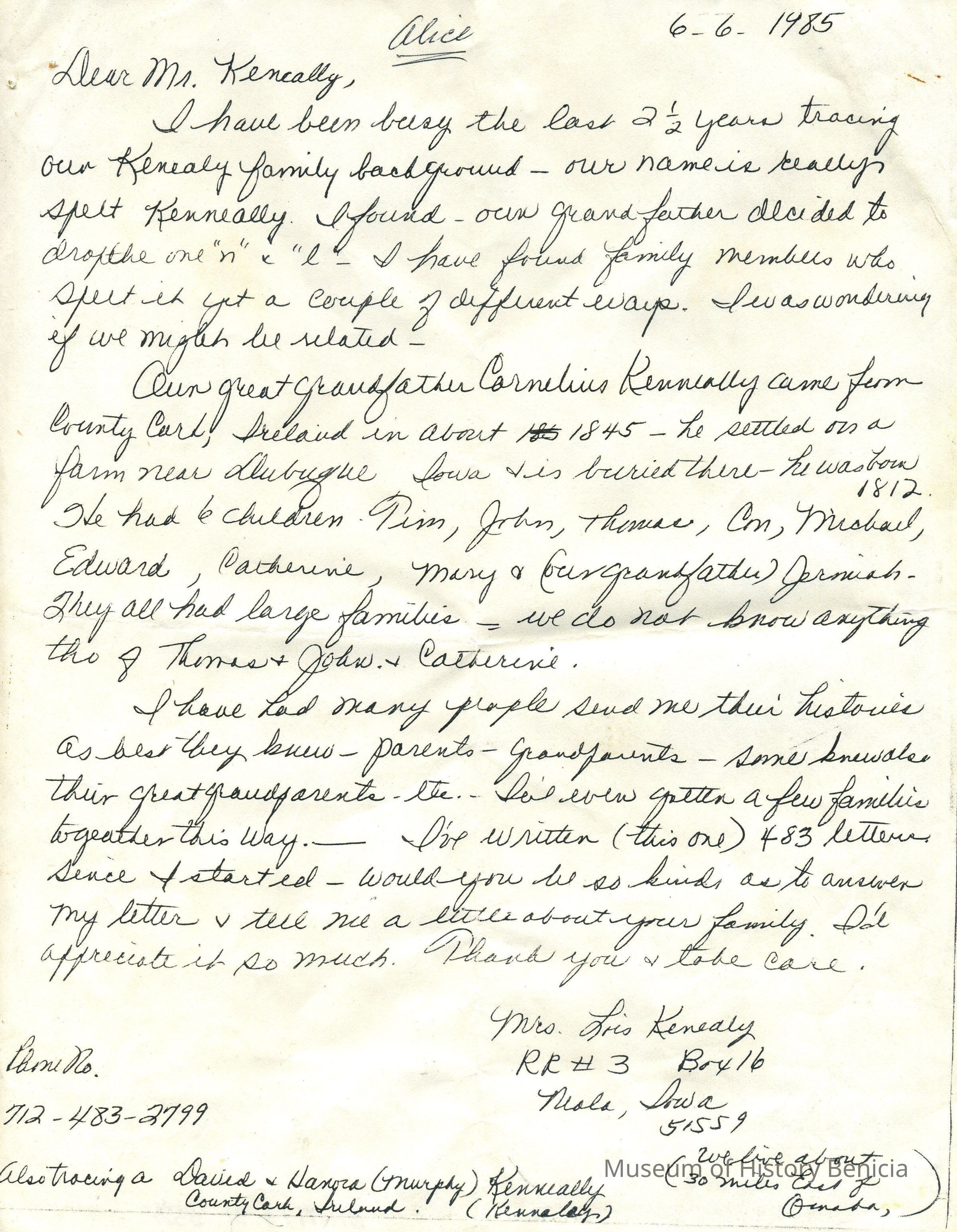 Letter to Mr. Henry Keneally (father of Alice Rankin) from Mrs. Lois Kenealy of Niola, Iowa regarding a possible family connection and shared genealogy.