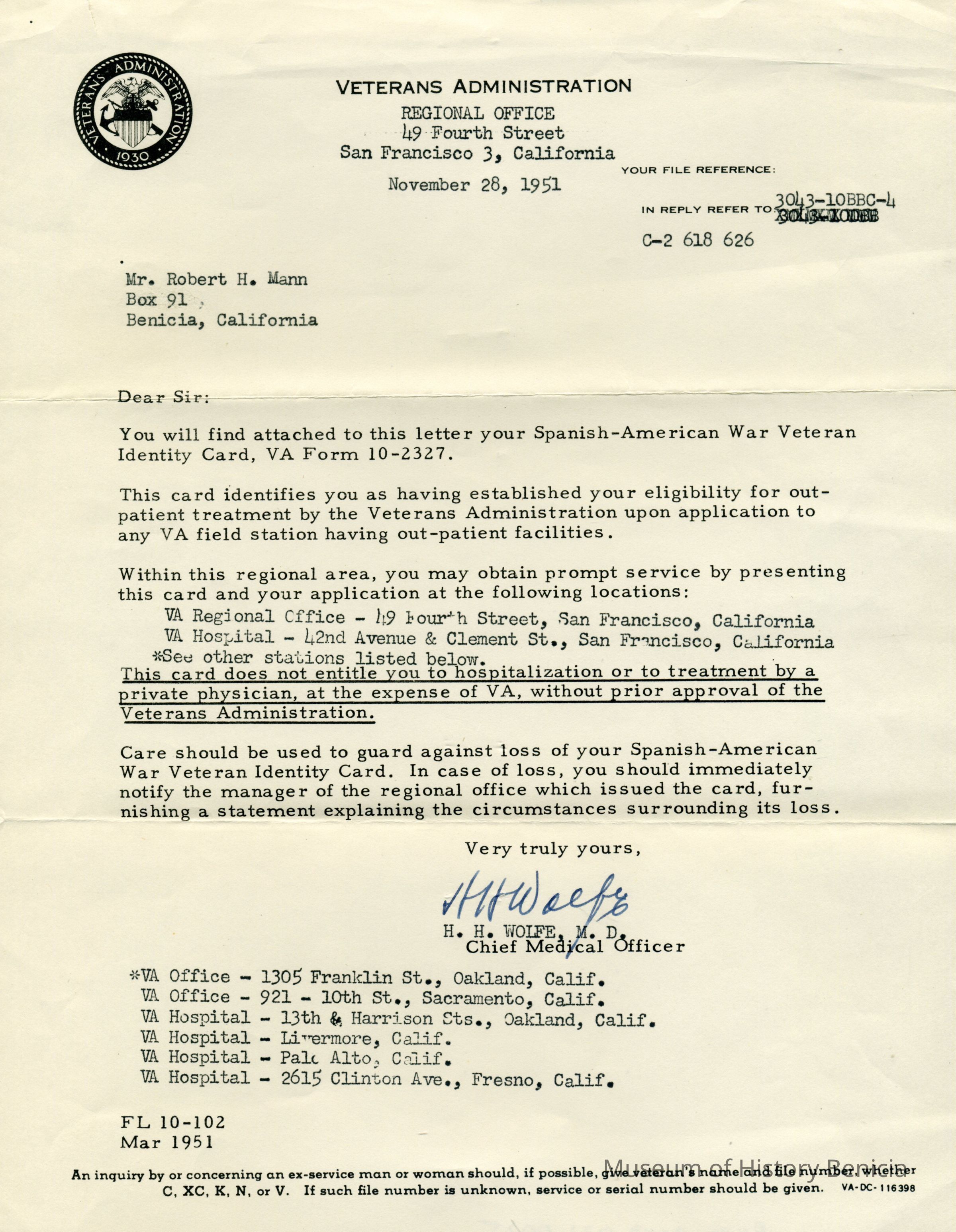 Letter from the Veterans Administration to Robert H. Mann sending him his Spanish-American War Veteran Identity card. It goes on to list the places where he may receive medical treatment in this region using this card. It is dated 11/28/1951Collection