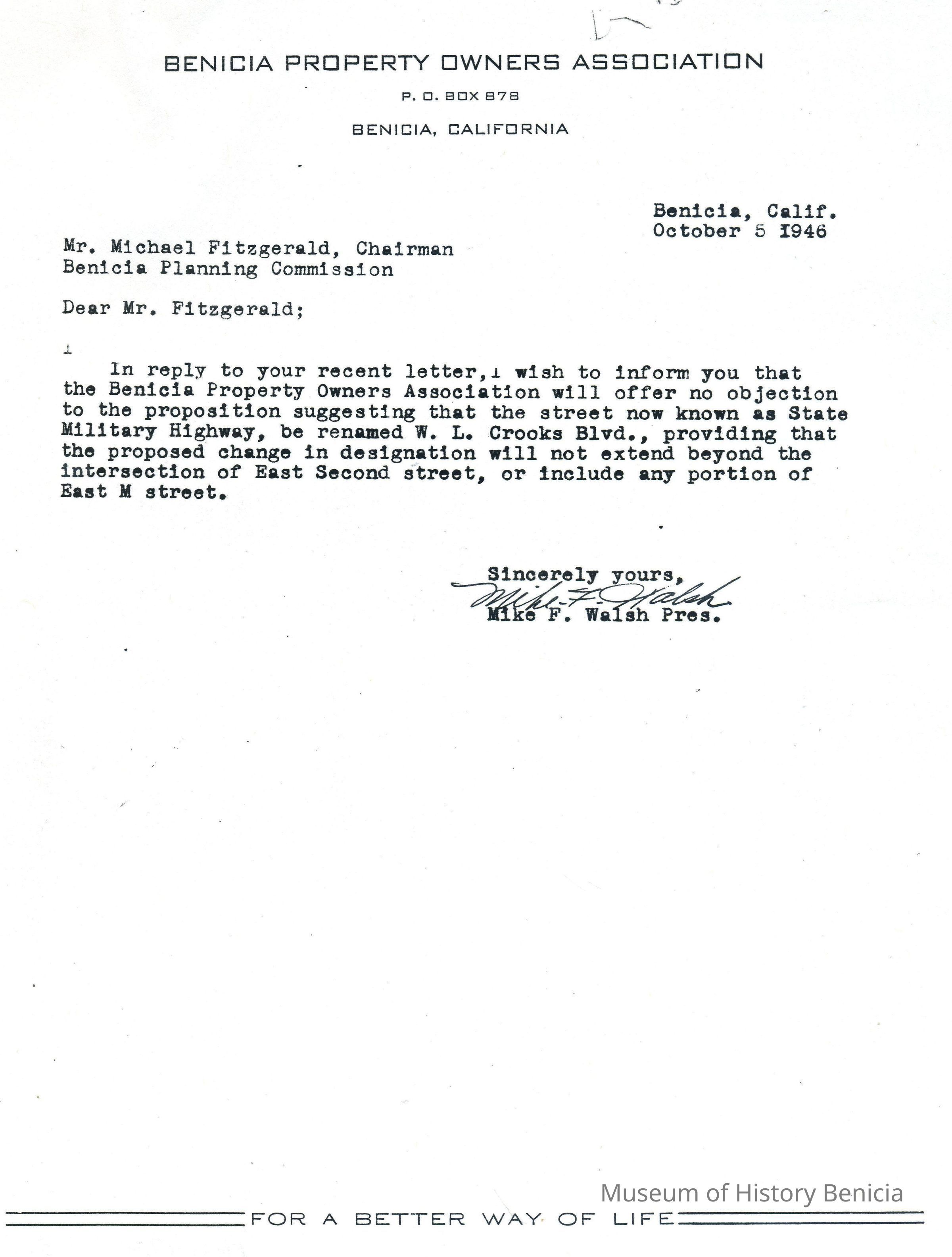 Third of a group of Four Letters from September and October 1946 on the subject of changing the name of M Street to Crooks Boulevard.